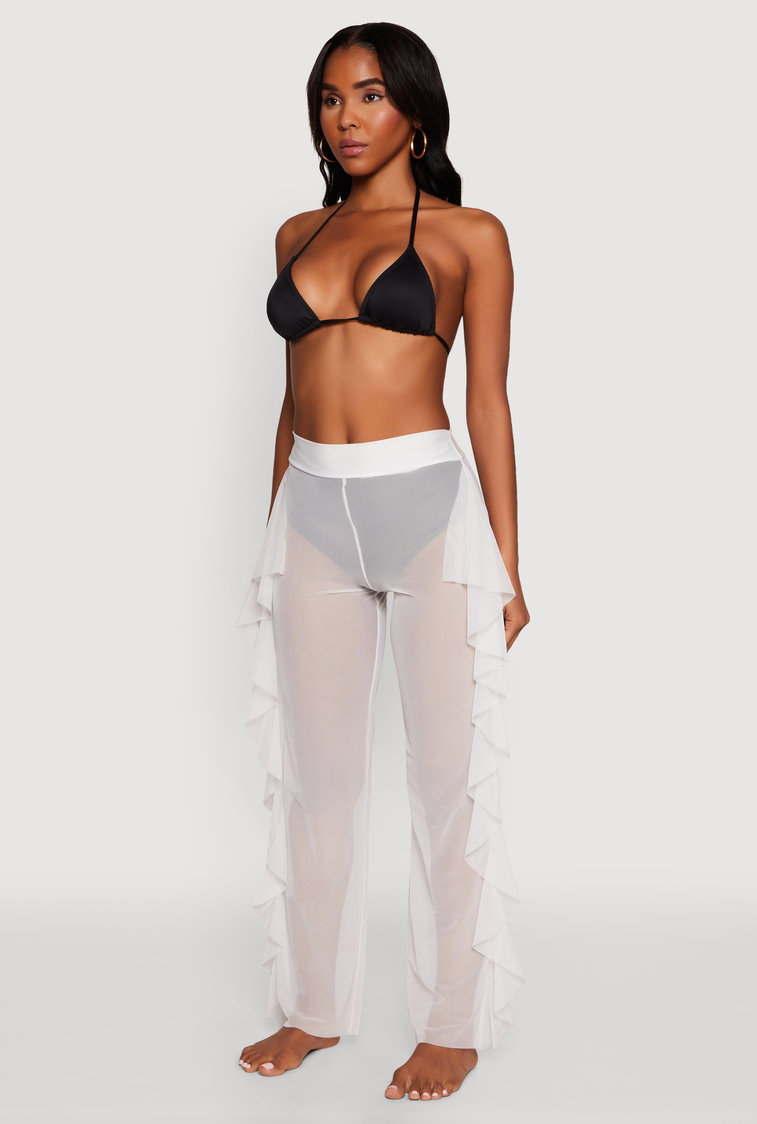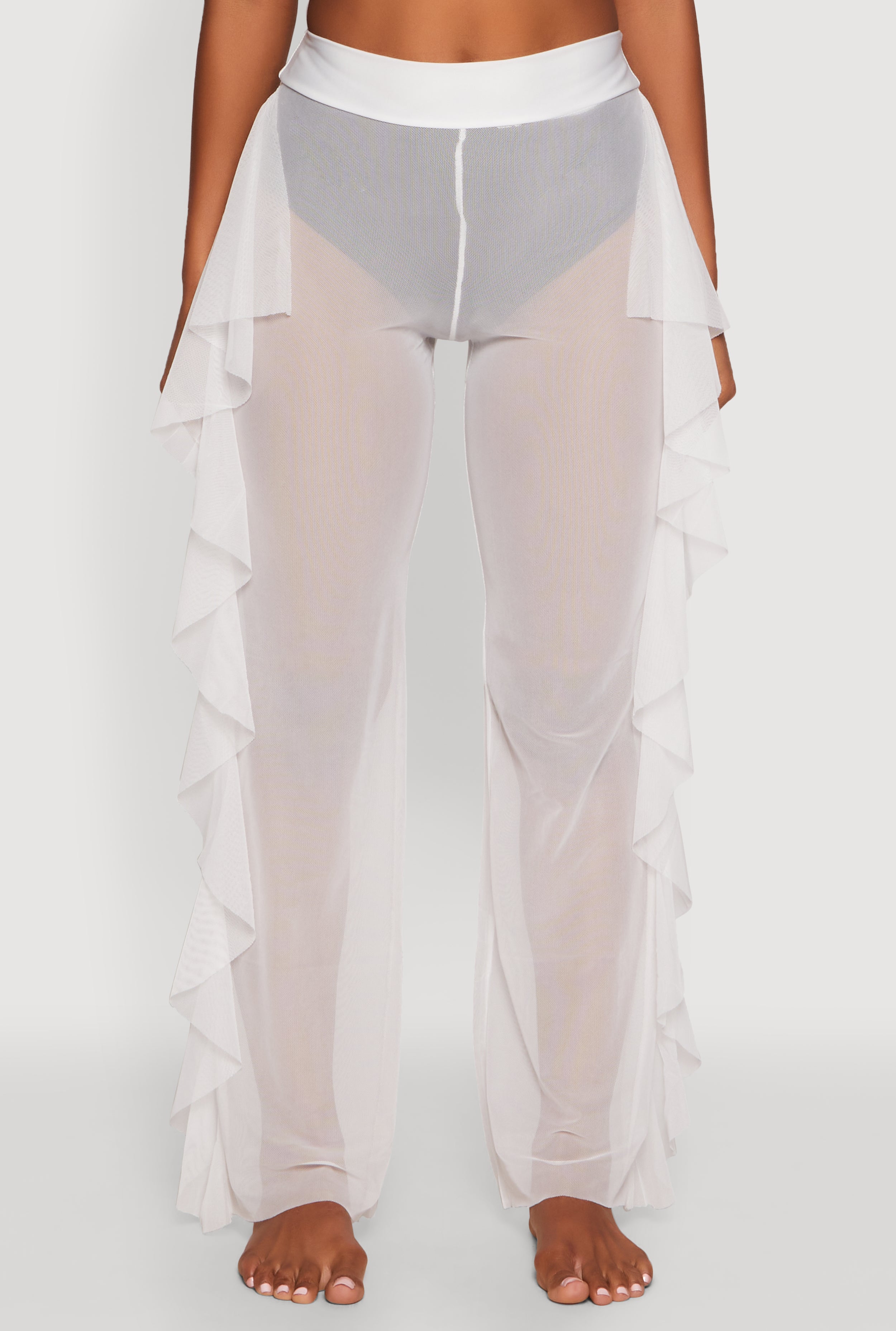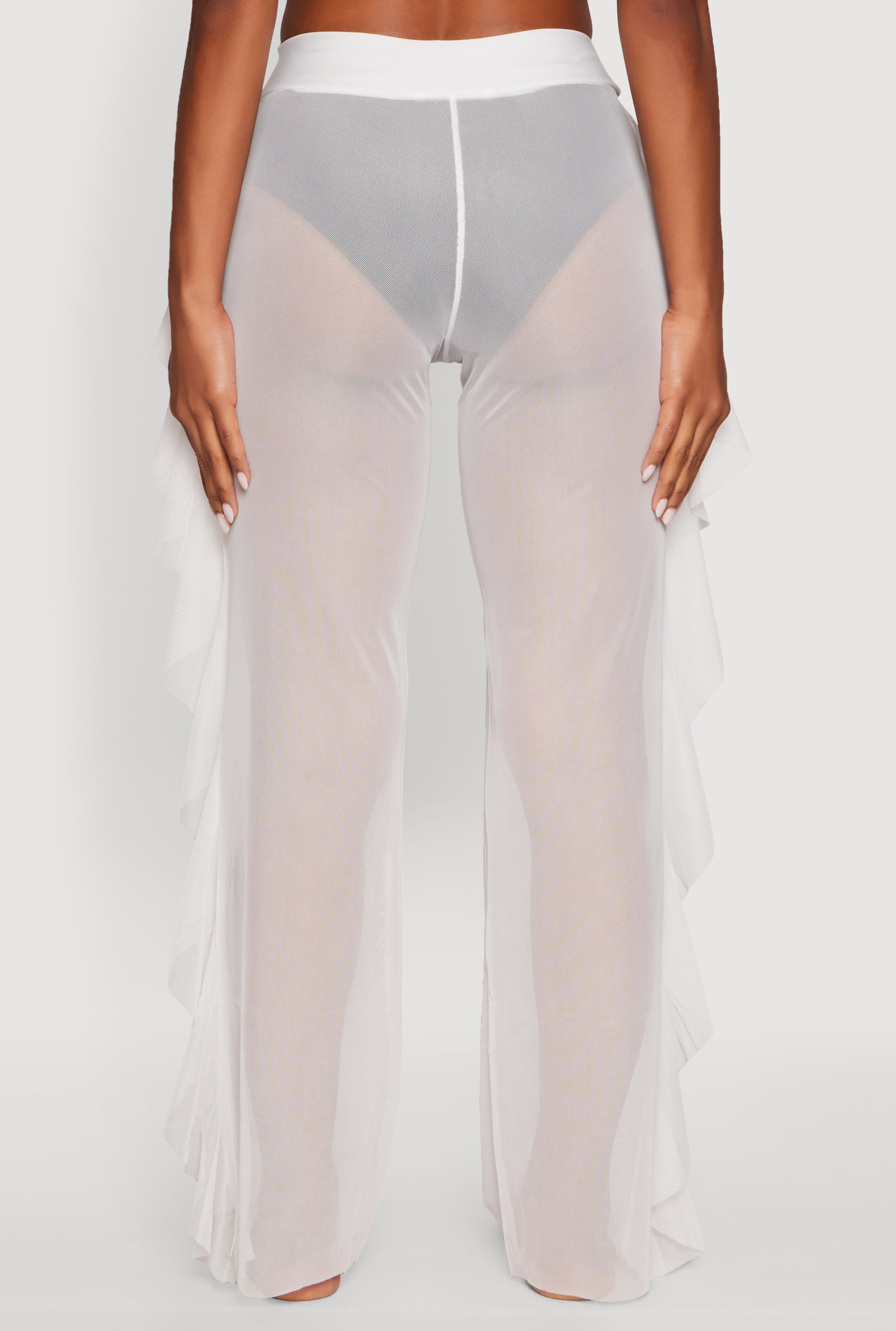Get ready to turn heads at the pool or beach with these High Waisted Ruffle Trim Cover Up Pants. Perfect for adding a flirty touch to your swimwear look, these pants combine comfort with style in a way that makes every moment by the water feel like a runway. The playful ruffle trim and sheer mesh material make them a must-have for your summer wardrobe. Easy to slip on and perfect for mixing and matching, these pants are your new go-to for effortless chic and fun.