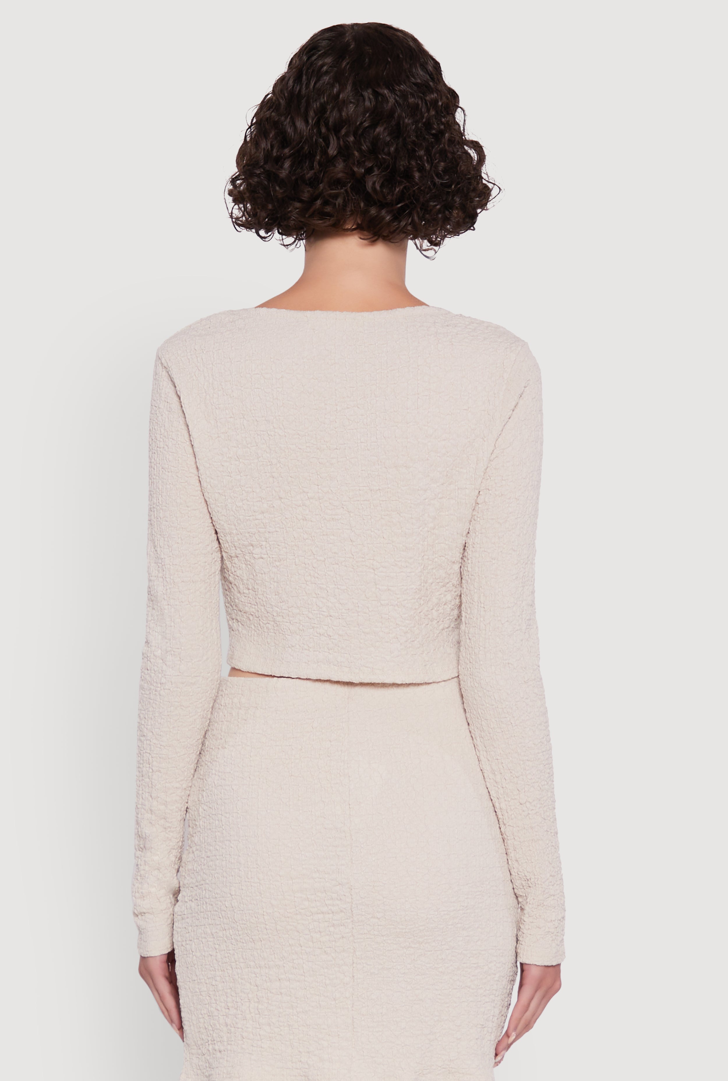Turn heads and keep it cute with this Textured Knit Bow Crop Top featuring a flirty slit front. Its classic fit and scoop neckline make it effortlessly stylish for your next night out or casual party vibe. The long sleeves balance the crop silhouette, while the textured knit and bow detail add a playful touch that stands out without trying too hard. Perfect for layering or rocking solo, this top is your new go-to for easy, breezy style that feels as good as it looks.