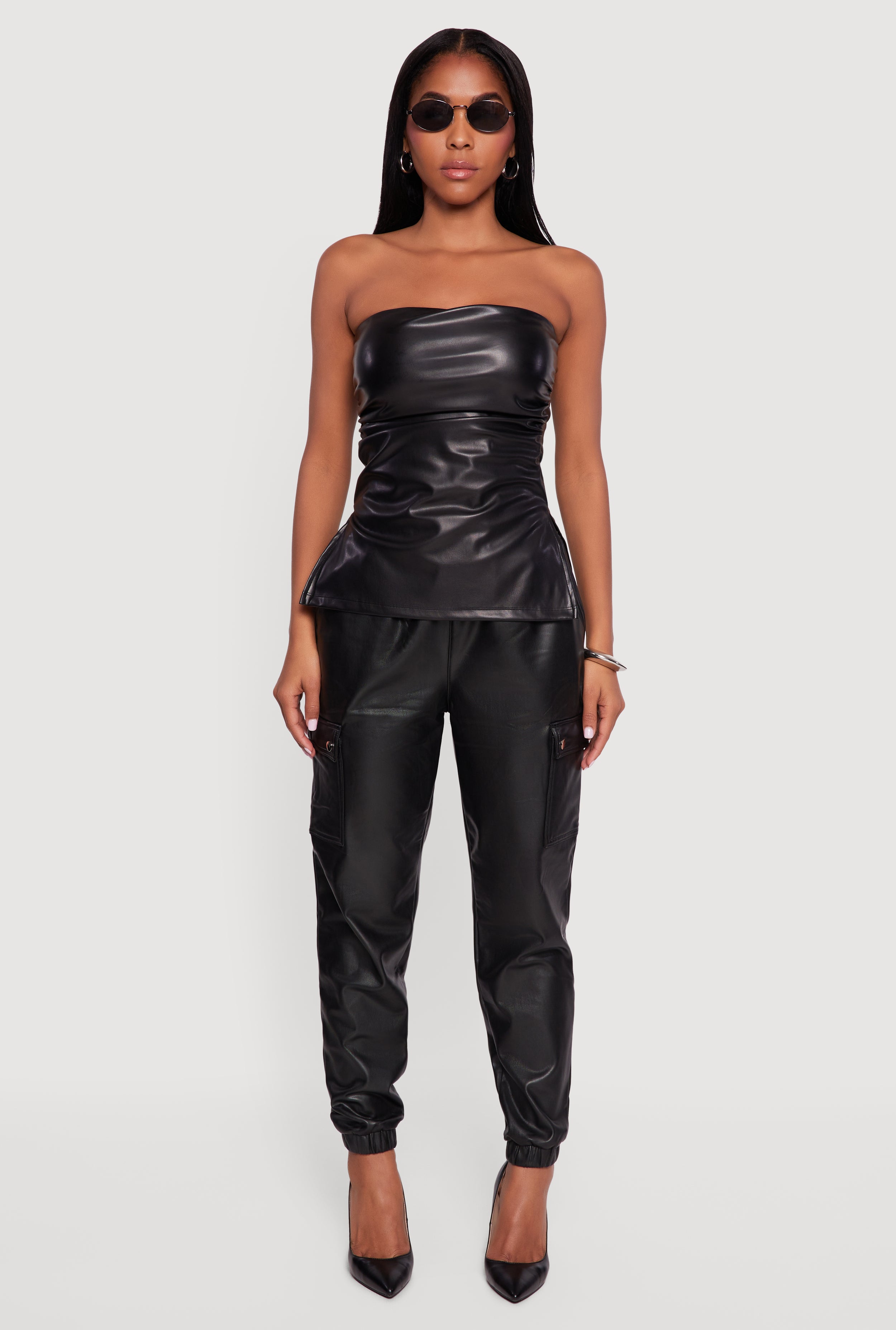• Faux Leather Side Ruched Side Slit Tube Top