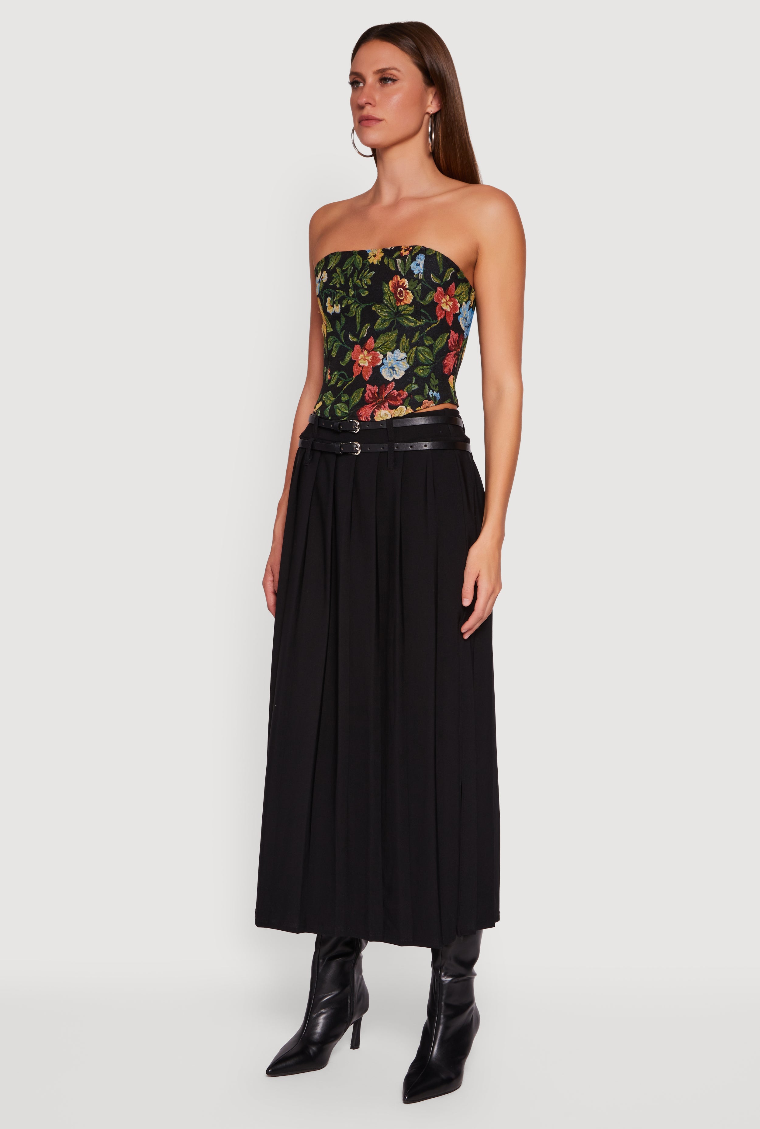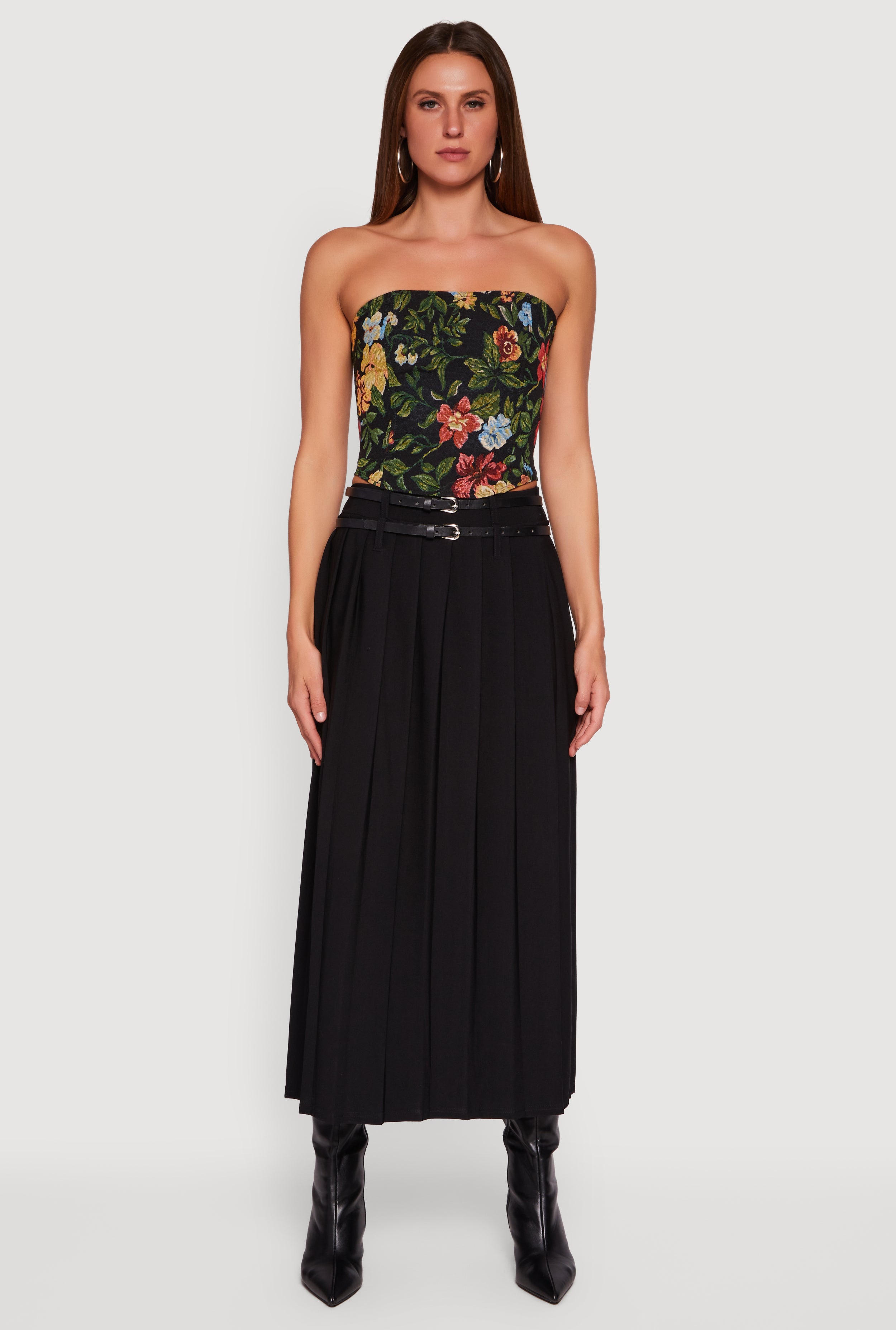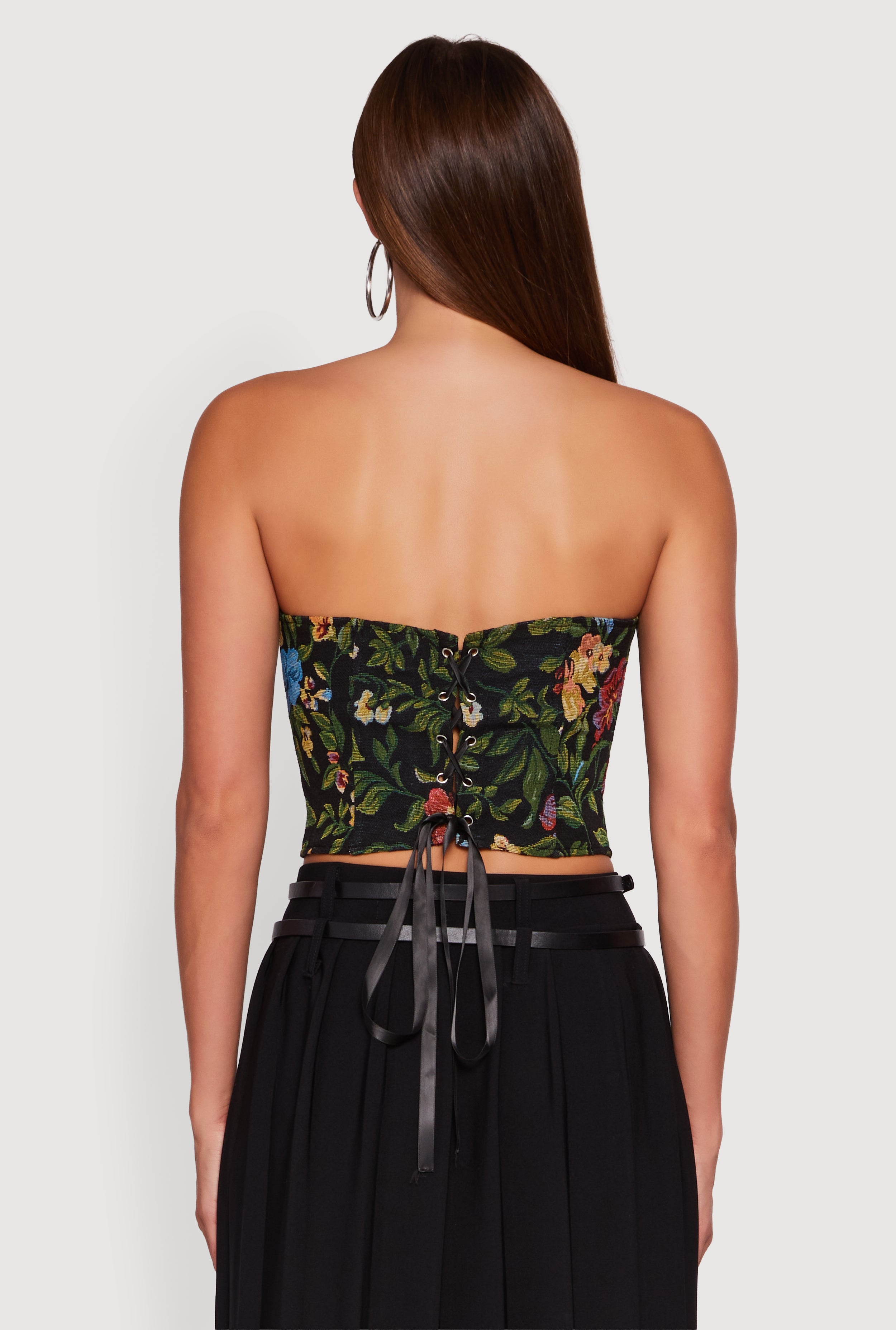 Turn heads wherever you go with this Floral Jacquard Lace Up Back Corset from Daisy. Designed to hug your curves and show off your silhouette, this strapless, sleeveless top features a stunning floral jacquard pattern and a daring open back with lace-up detail. Perfect for nights out, parties, or festivals, it’s a bold statement piece that blends edgy style with feminine charm.