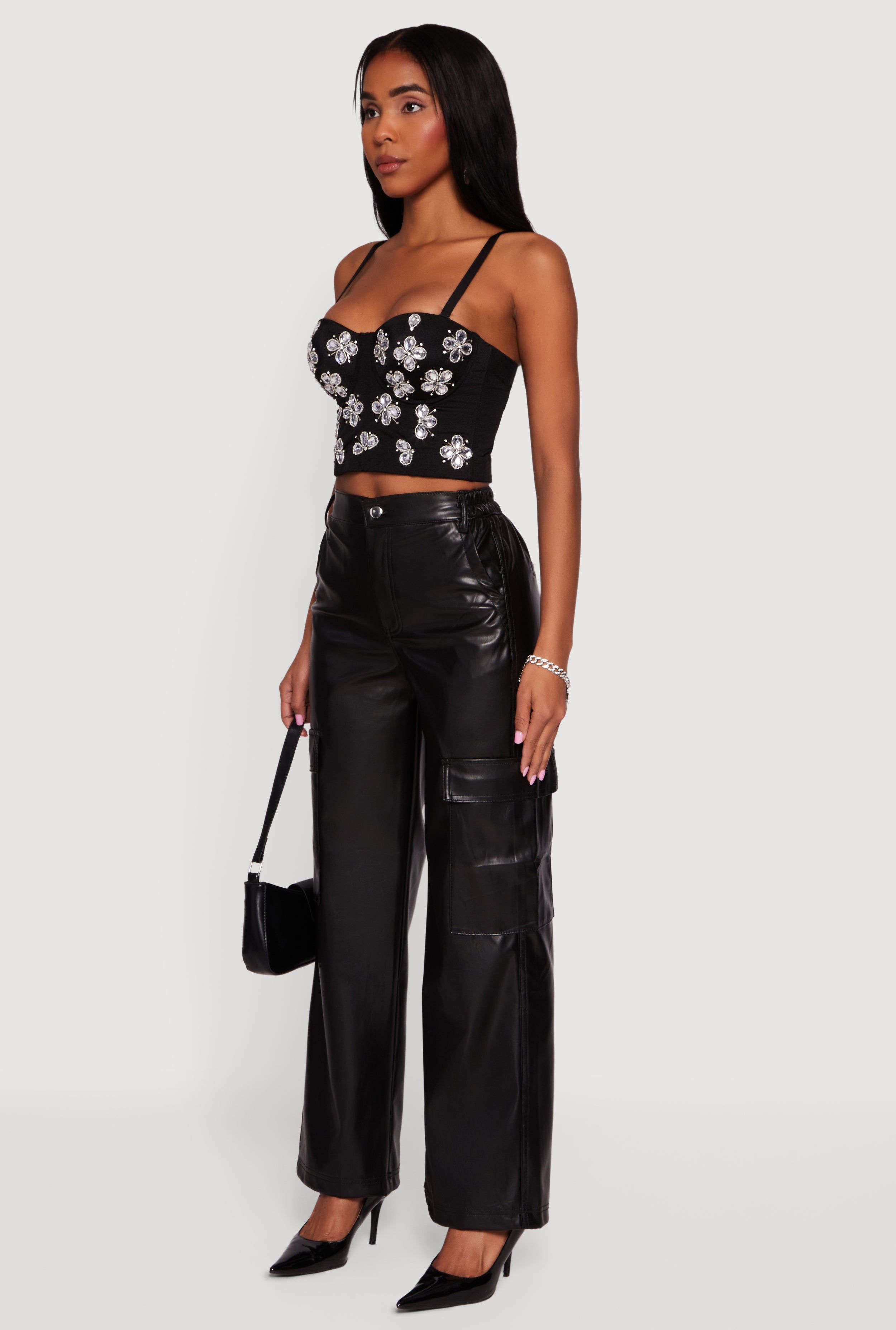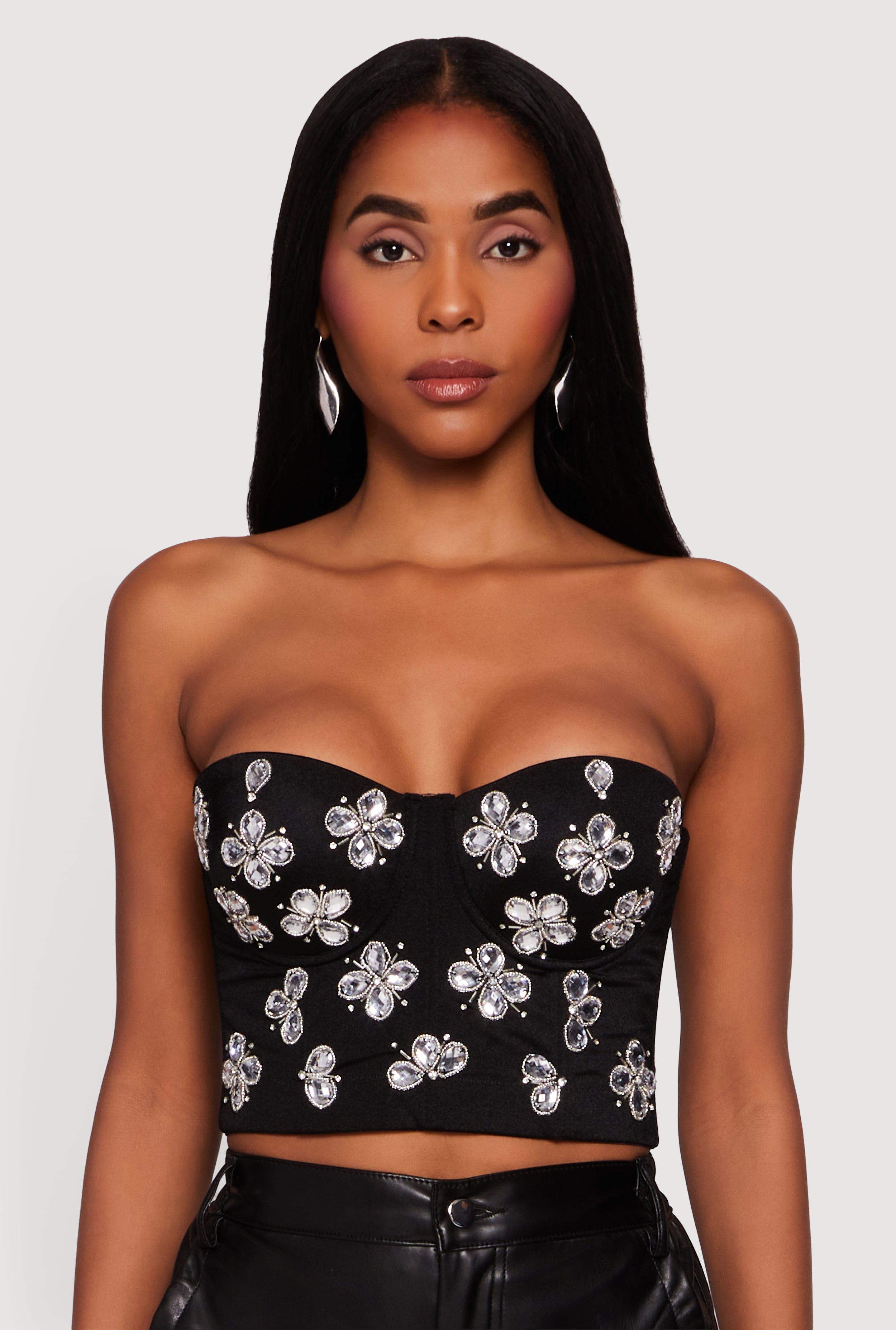 Turn heads with this Floral Rhinestone Convertible Bustier Crop Top, designed to hug your curves and add a sparkling touch to your night out or festival vibe. Featuring a sweetheart neckline and delicate spaghetti straps that you can adjust or remove to go strapless, this top combines flirty style with versatile wear. The padded cups, underwire support, and boning provide shape and lift, while the hook and eye closures ensure a secure fit. Perfect for making a statement with a touch of glam and effortless confidence.
