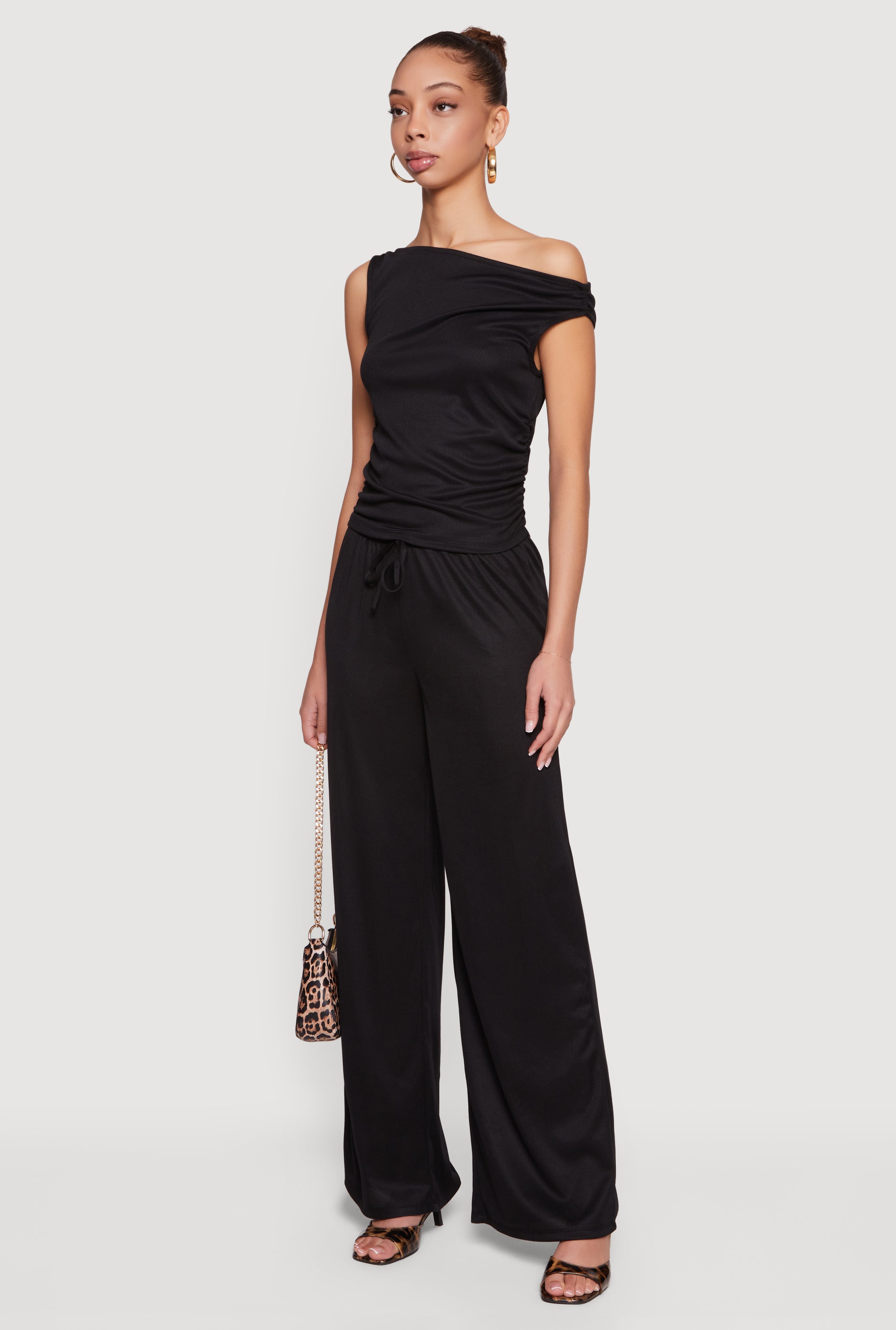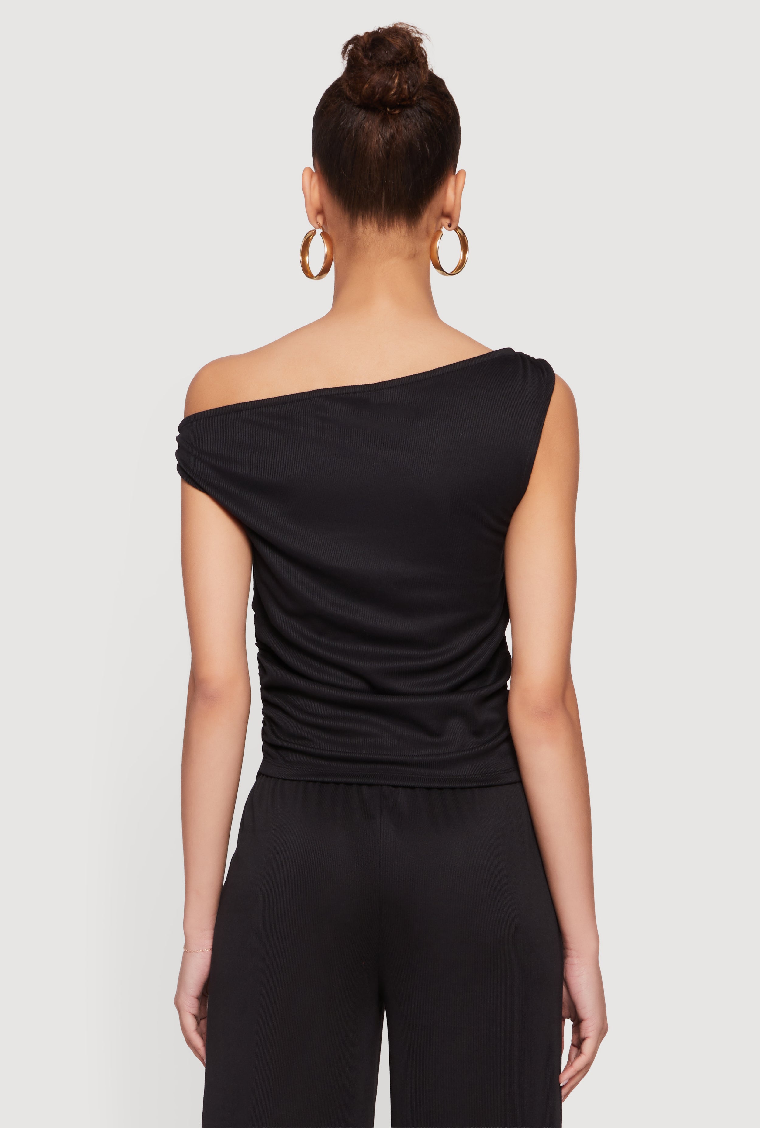 This ribbed knit blouse features a classic fit with a striking one-shoulder neckline and short sleeves. Side ruching adds subtle texture and shape, creating a flattering silhouette that works well for casual occasions. The soft, stretchy fabric offers easy movement and everyday wearability.