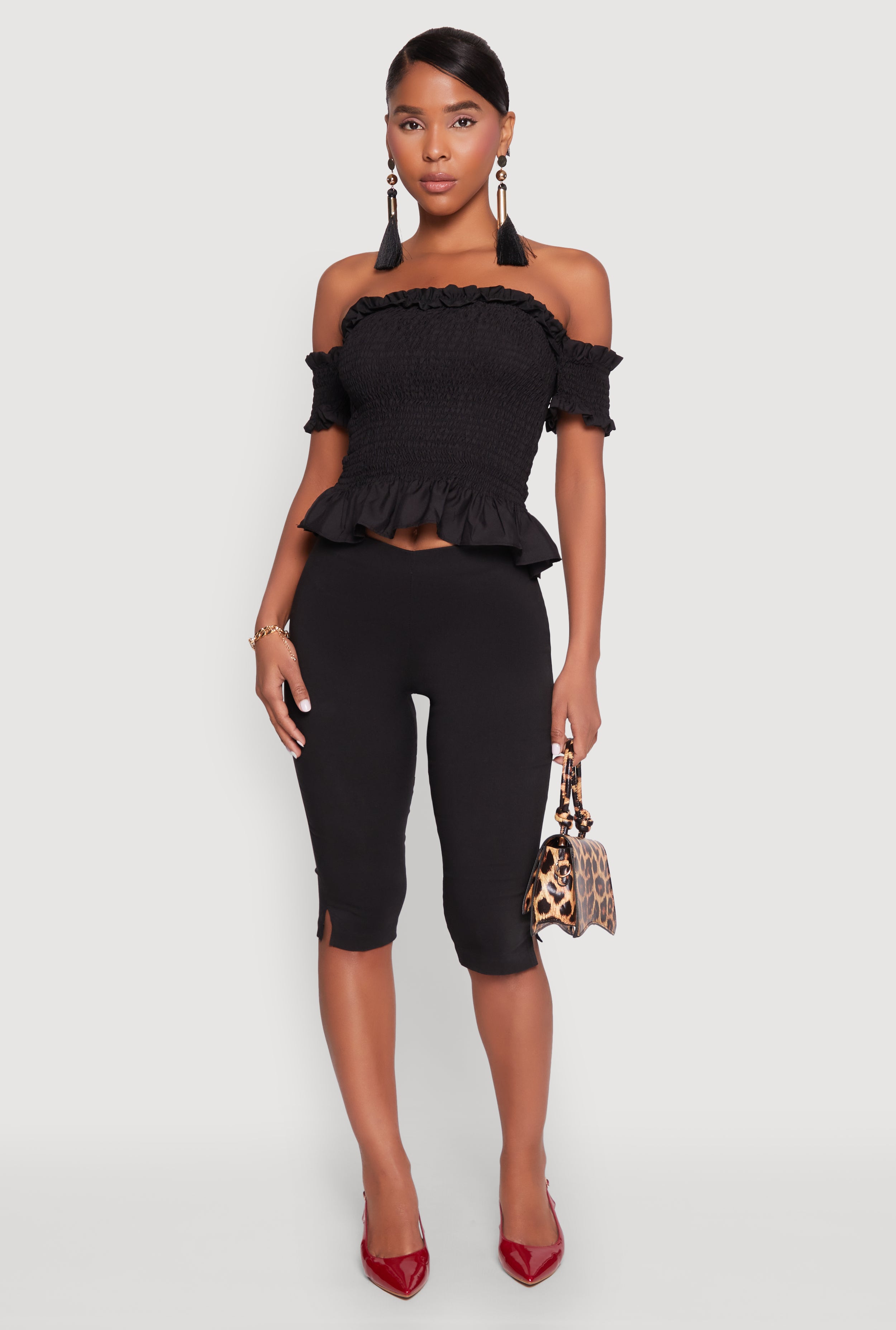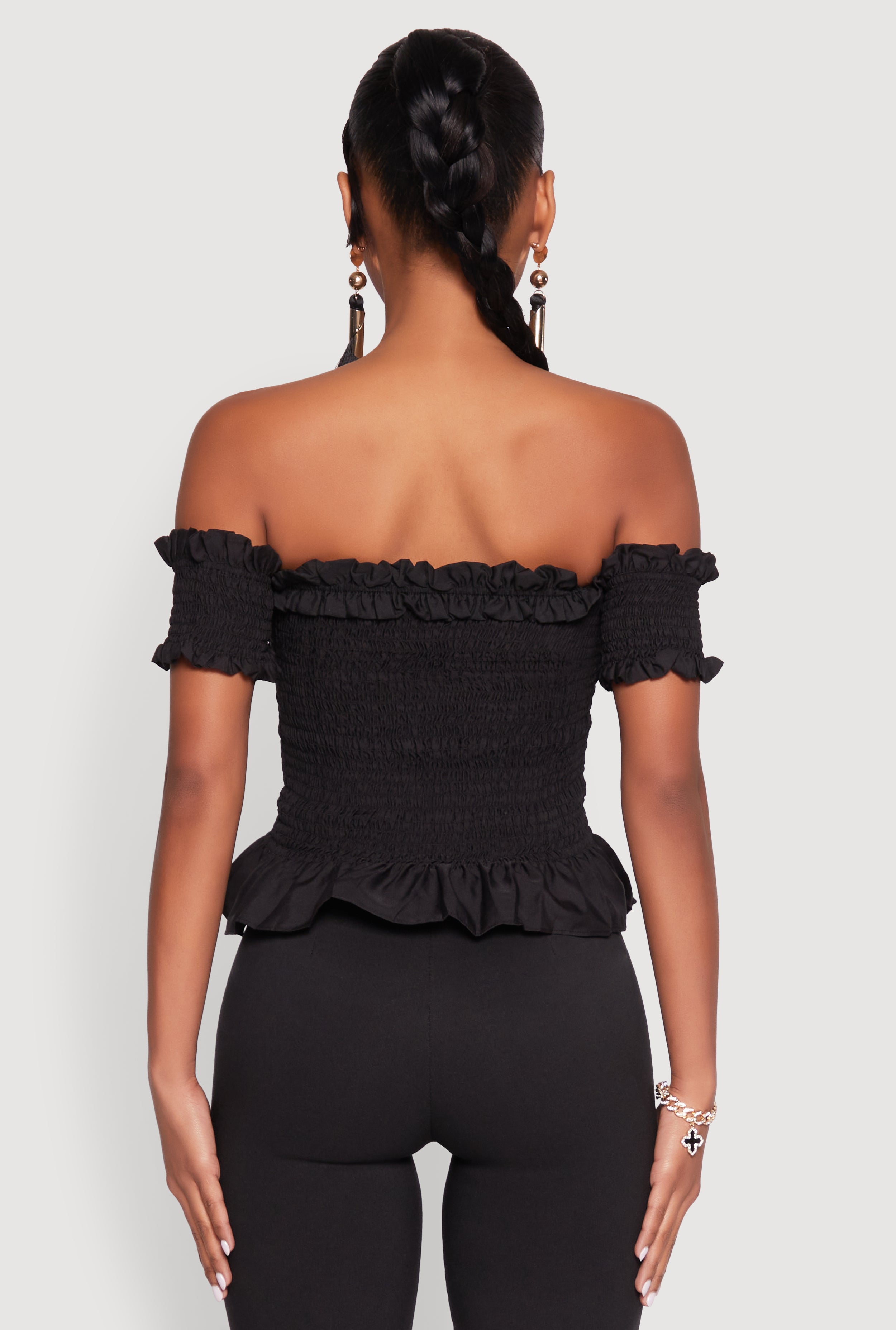 Get ready to turn heads with our Smocked Off the Shoulder Crop Top, the perfect blend of flirty and fun for your next night out or boho-inspired day. Its classic fit and timeless silhouette make it a versatile wardrobe staple, while the cropped hem adds a playful touch. With ruffles and a smocked detail, this blouse is all about effortless style and comfort. Whether you're dancing at a festival or brunching with friends, this top is your new go-to for looking cute and feeling confident.