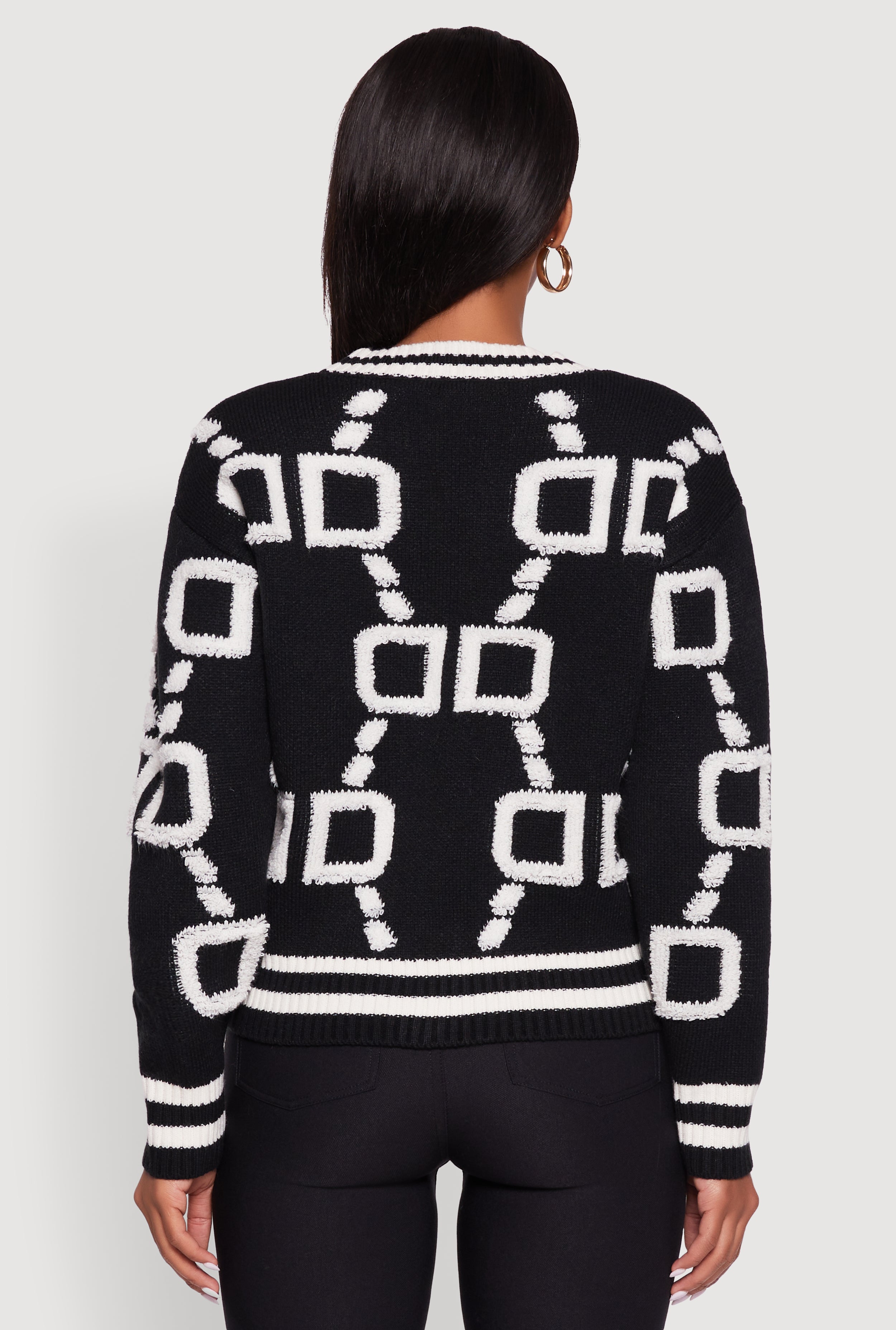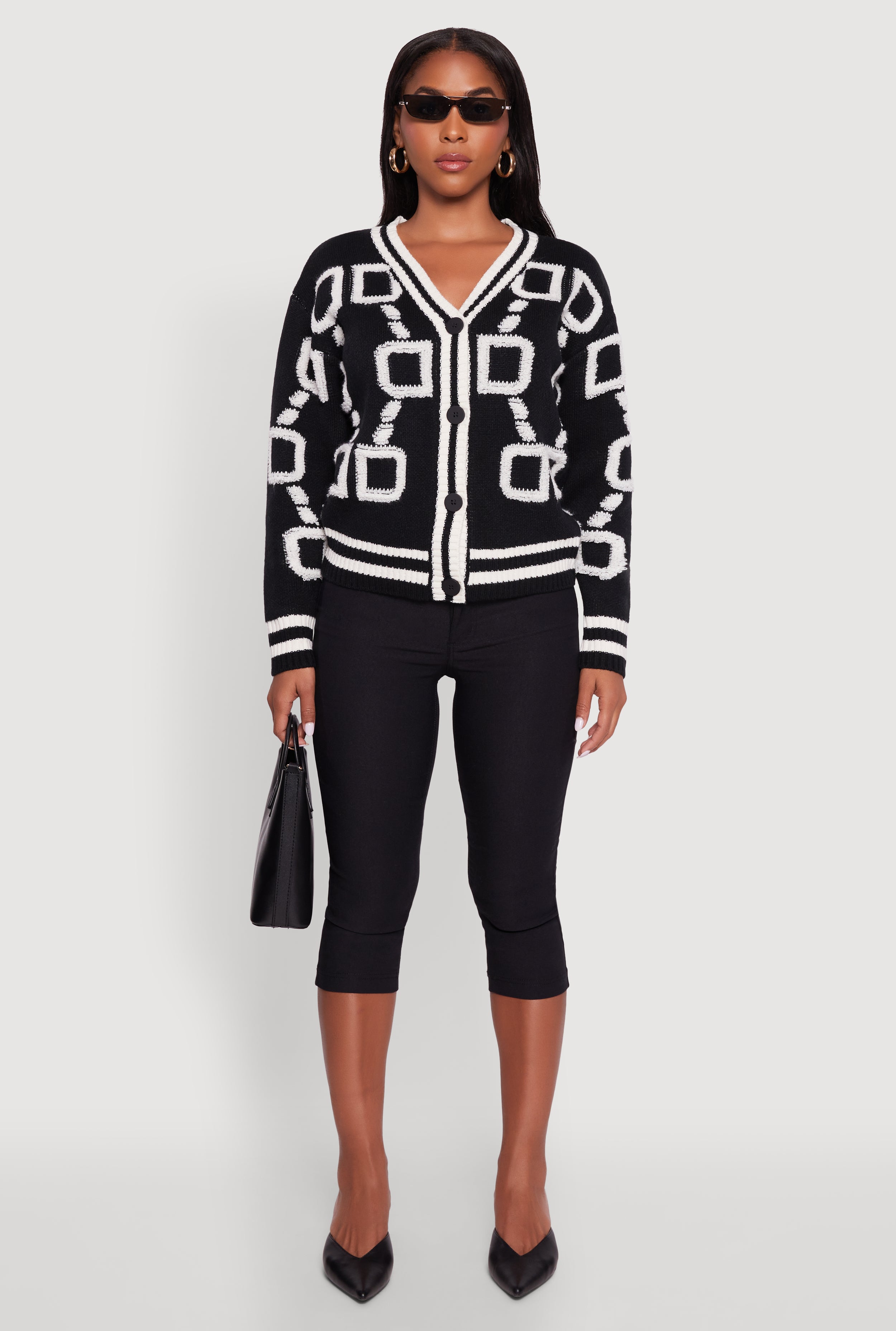Step up your casual game with the Varsity Stripe Chenille Chain Print Cardigan. This classic fit cardigan blends cozy chenille fabric with a trendy varsity stripe and chain print for a look that feels both timeless and fresh. The button front and V-neckline make it easy to layer over your favorite tees or dresses, adding just the right amount of flair to your everyday outfit. Perfect for chill days or casual hangouts, this cardigan is your new go-to for effortless style and comfort.