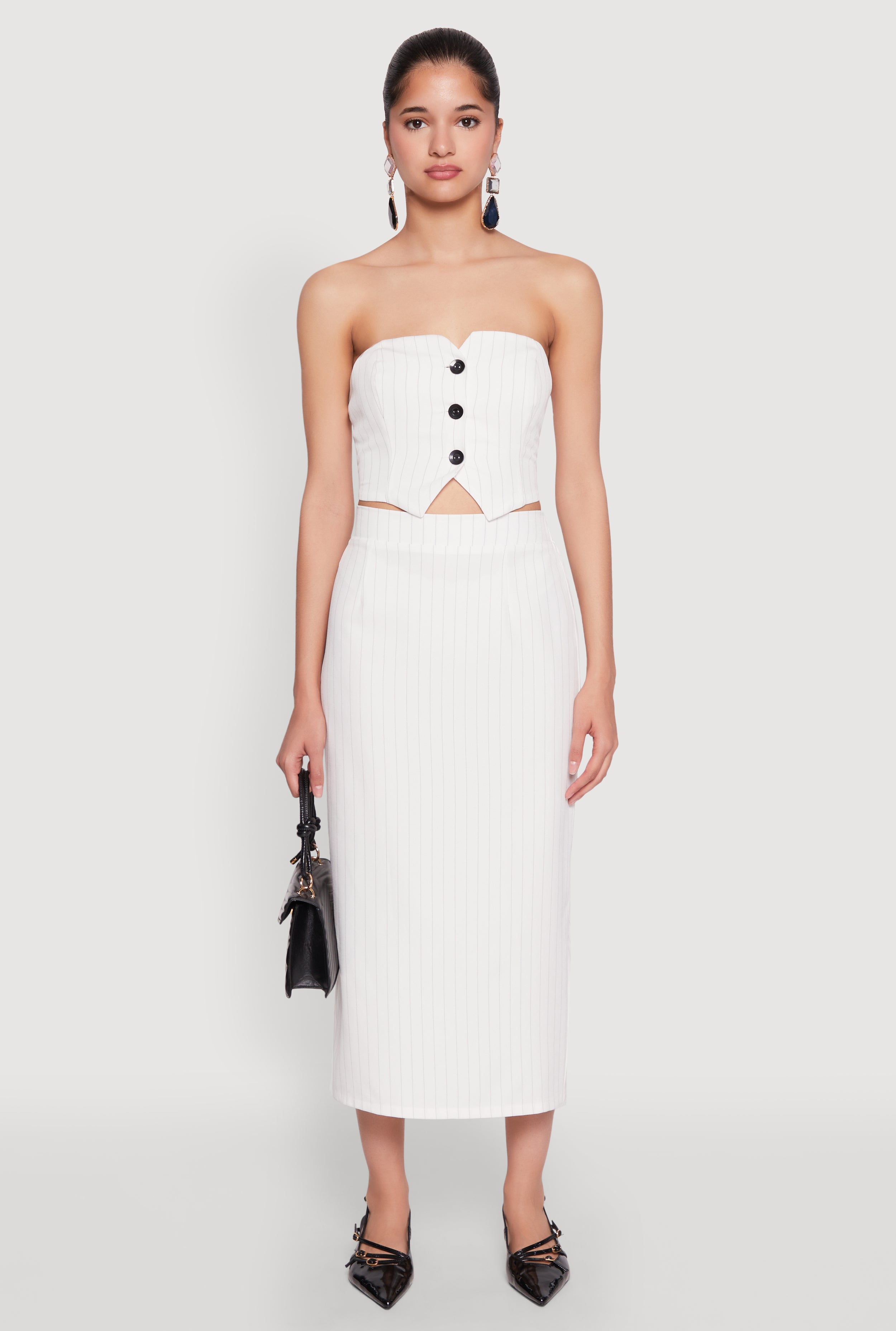 Get ready to turn heads with the Pinstripe Button Front Strapless Top, a perfect blend of flirty and chic. Its sweetheart neckline and cropped hem make it an instant favorite for sunny days or night outs. Designed with a classic fit and timeless silhouette, this tube top offers effortless style that keeps you feeling confident and cool. Whether you're dressing up for a set or just want to add a pop of pattern to your wardrobe, this top is your new go-to piece.