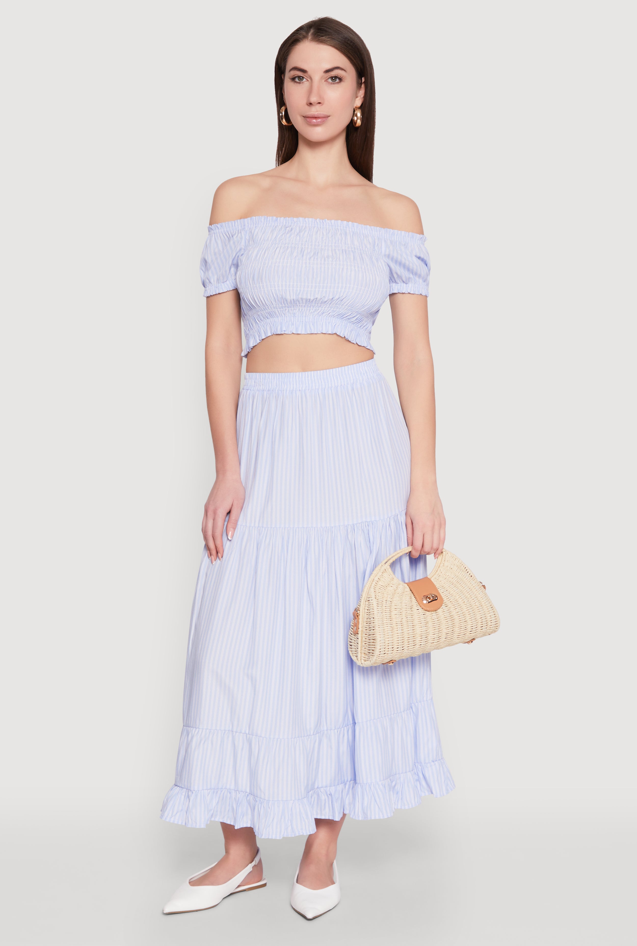 Get ready to turn heads with the Almost Famous Pinstripe Smocked Crop Top. This effortlessly chic blouse combines a classic fit with a timeless silhouette, making it your go-to piece for any casual or dressy occasion. The off-the-shoulder neckline adds a flirty touch, while the puff short sleeves bring a playful vibe. Perfect for pairing with high-waisted jeans or skirts, this cropped hem top is all about showing off your style and confidence. Whether you're hanging out with friends or heading to a fun event, this top is designed to keep you looking fresh and feeling fabulous.