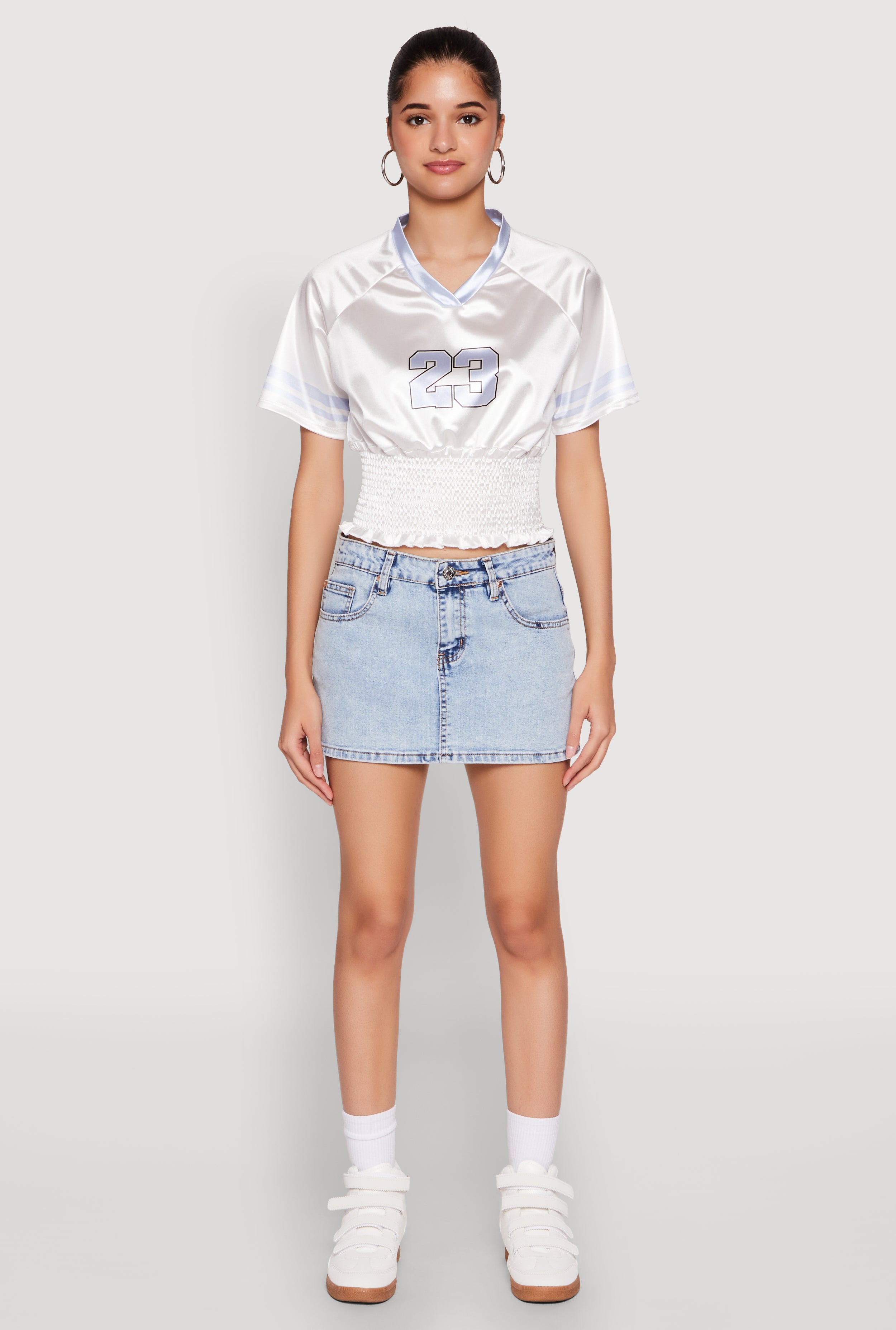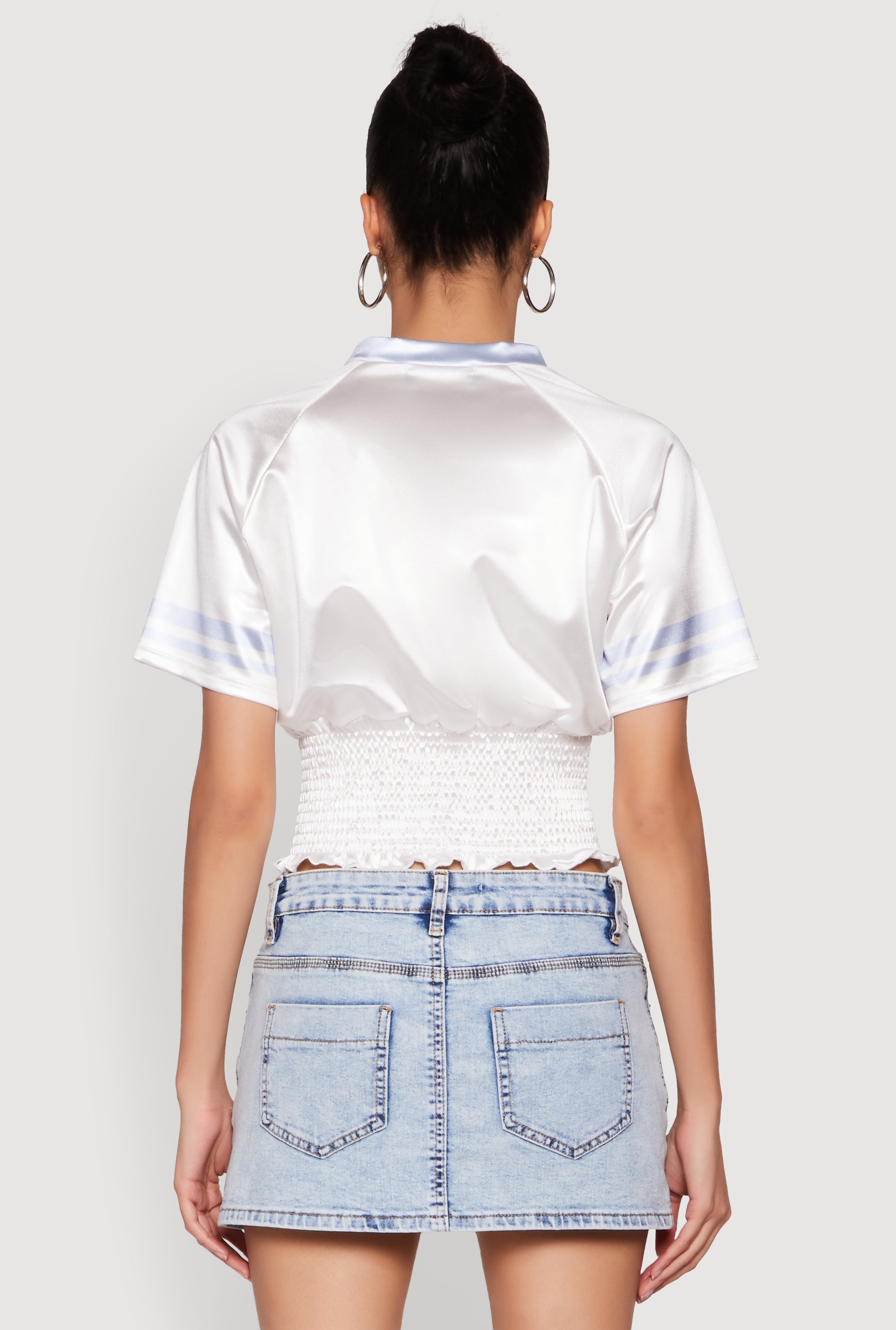 Looking for a top that combines sporty vibes with a touch of glam? The Satin Smocked 23 Football Crop Top is your new go-to for effortless style. Made from smooth satin fabric, this crop top features a classic fit with a trendy cropped hem and a flattering V-neck. Whether you're heading to a game or just want to elevate your everyday look, this piece adds a sporty-chic twist to your wardrobe. Its stretch smocked detail and varsity stripe accents make it stand out, while the short sleeves keep it cool and comfy. Perfect for those who love a timeless silhouette with a modern edge.
