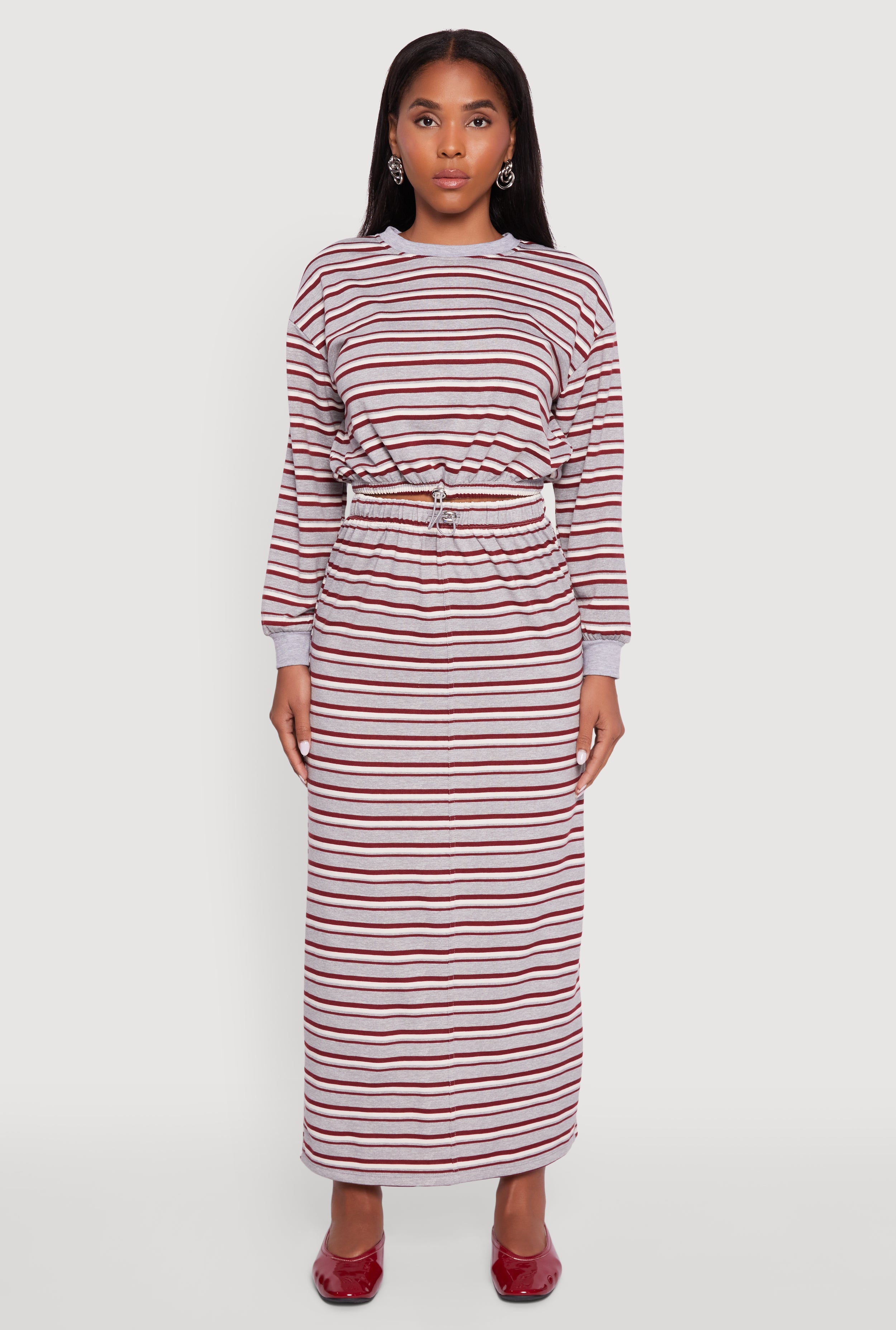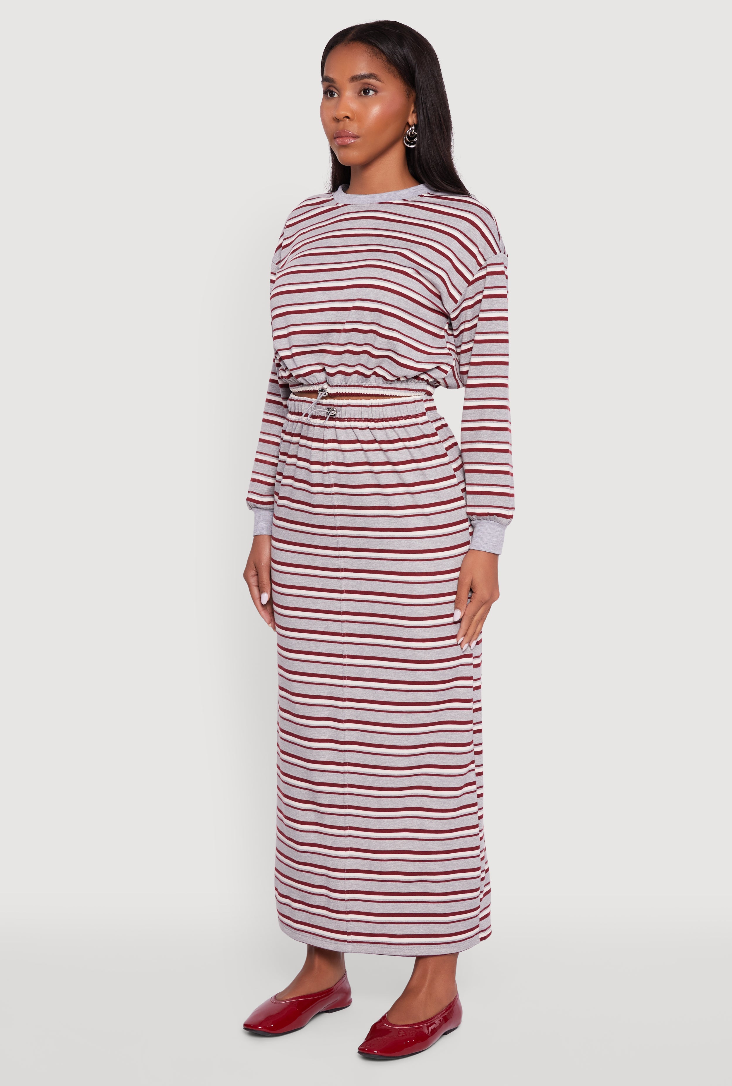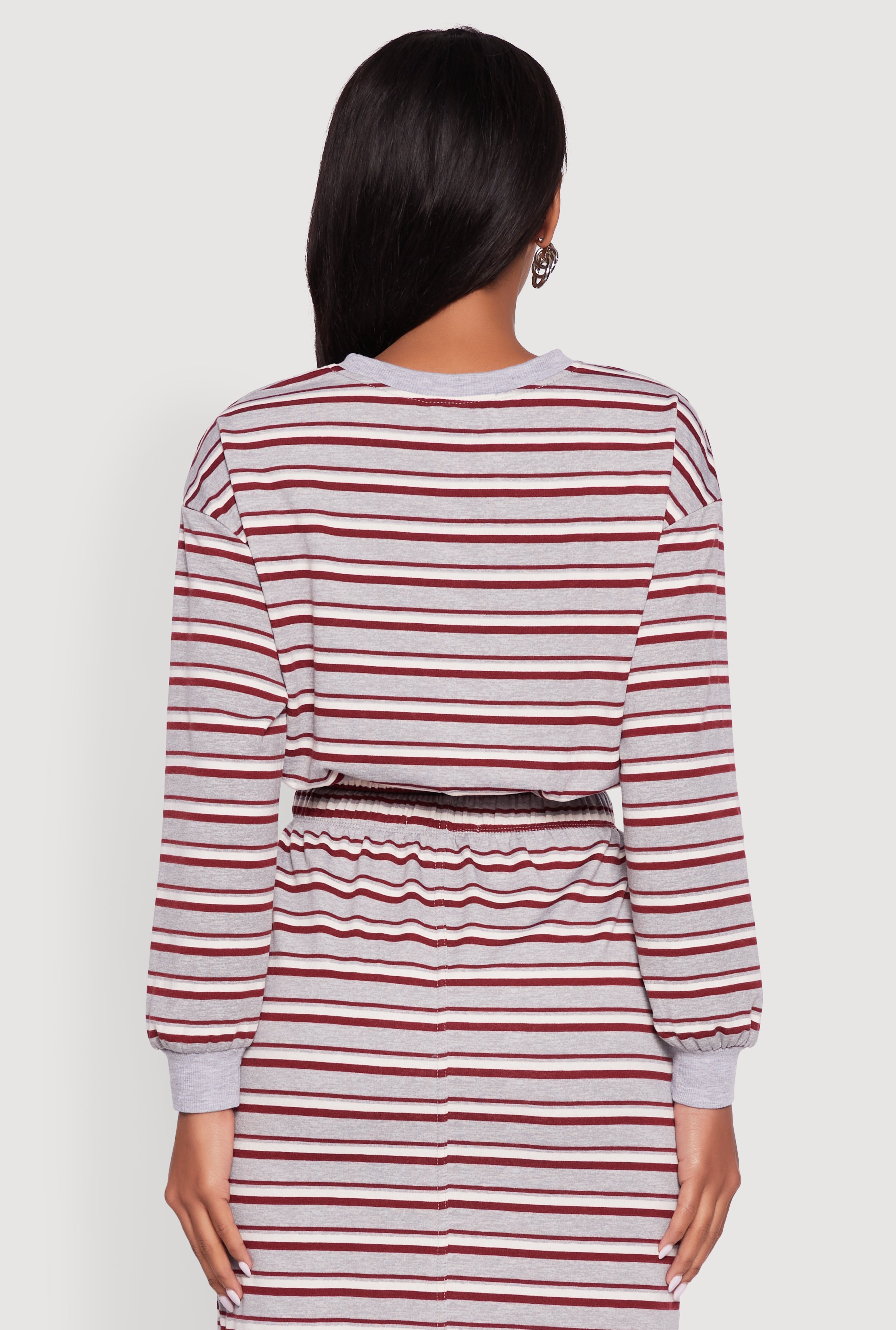Meet your new go-to for effortless cool: the Striped Cropped Toggle Drawstring Hem Sweatshirt. With its classic crew neck and playful balloon sleeves, this fleece pullover brings cozy vibes and street style flair together. The adjustable toggle drawstring hem lets you customize your fit, making it perfect for layering or rocking solo. Whether you're chilling at home or stepping out for a casual hangout, this striped crop is the ultimate mix of comfort and trend.