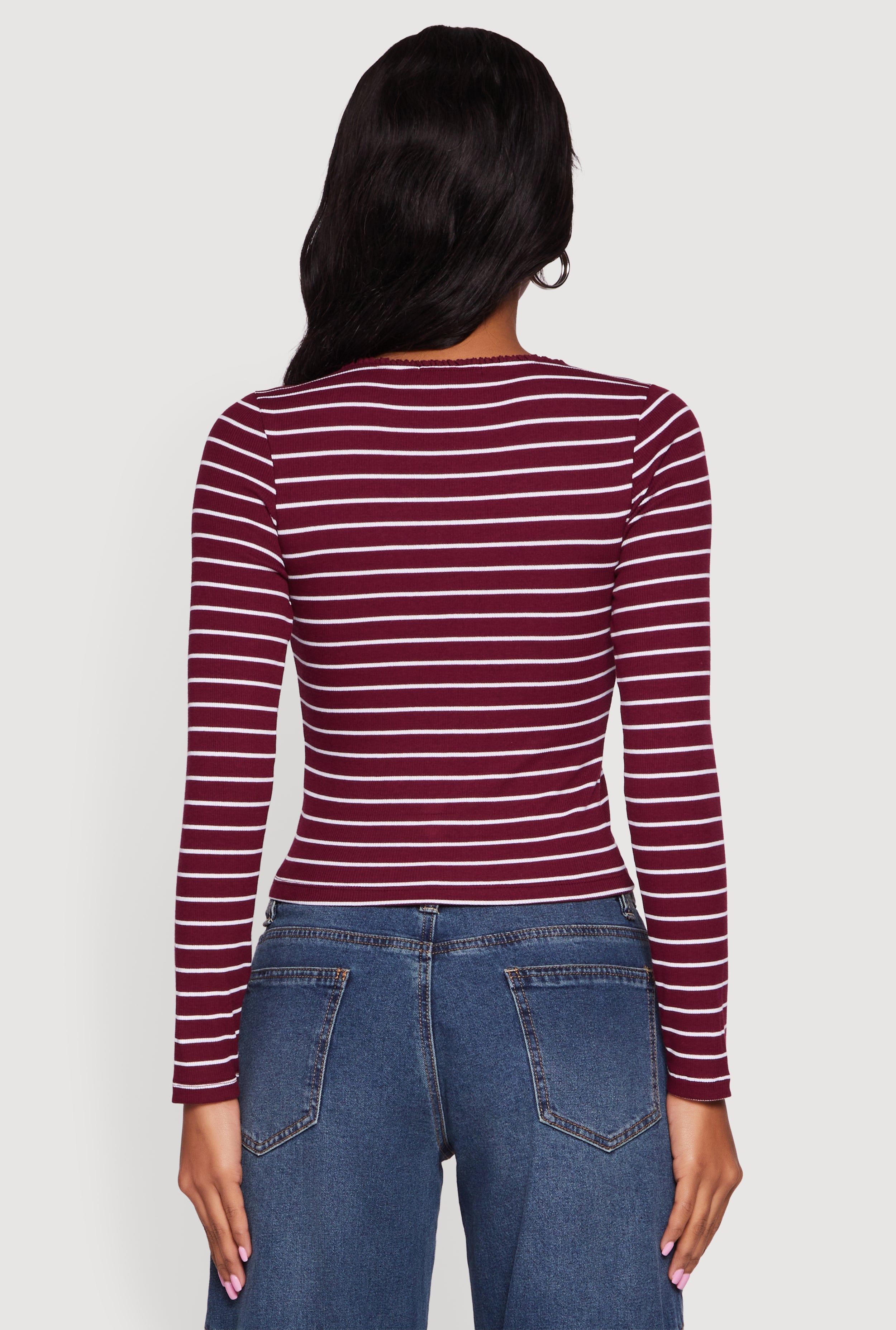 • Striped Rib Knit Cropped Long Sleeve Scoop Neck Tee