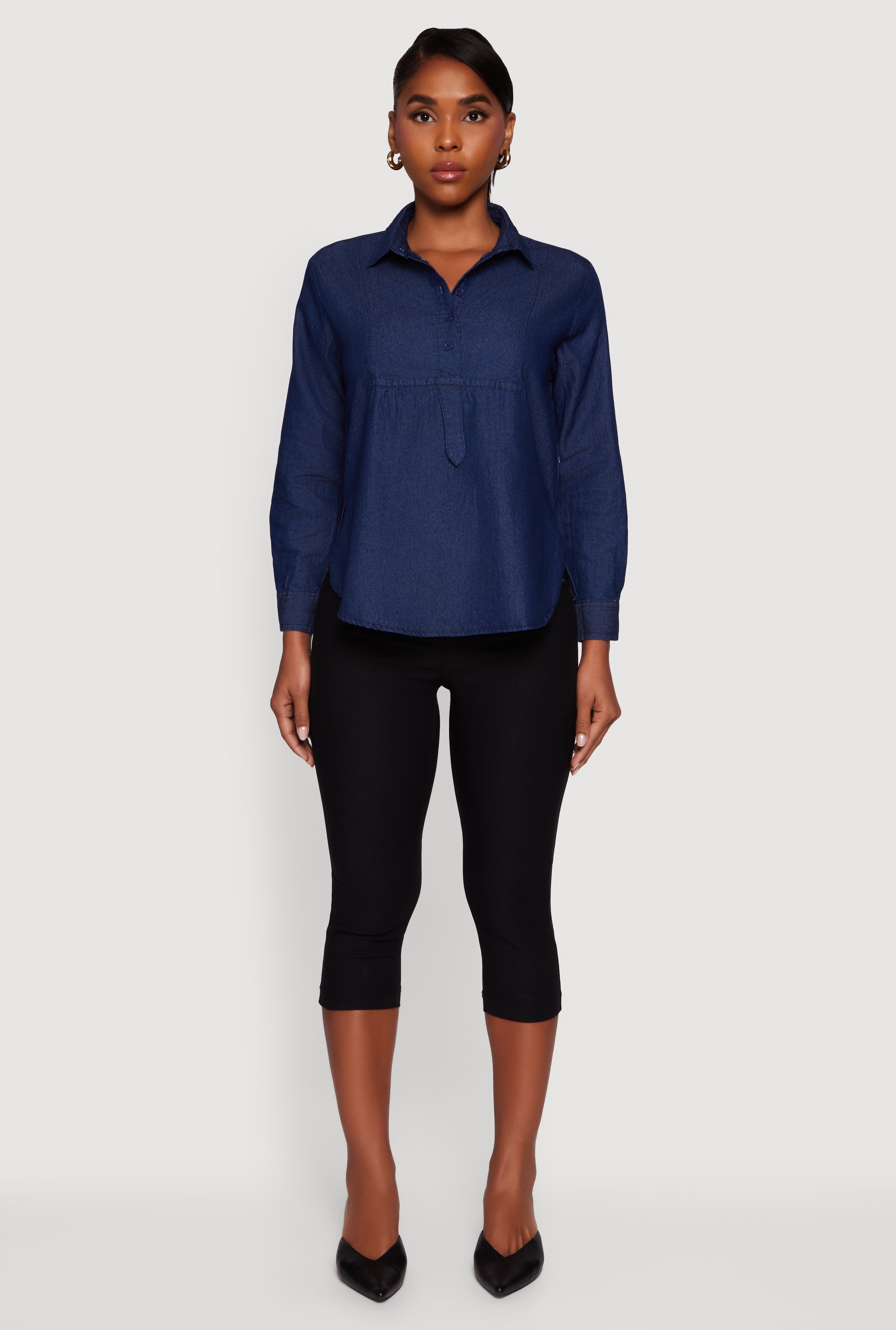 Upgrade your casual wardrobe with this Denim Long Sleeve Half Button Front Blouse. Its classic fit and timeless silhouette make it the perfect go-to for effortless style. The half button front adds a cool, laid-back vibe while the rounded hem gives it a modern twist that pairs perfectly with your favorite jeans or skirts. Whether you're heading out for brunch or just chilling with friends, this blouse brings easy, breezy denim vibes to any look.
