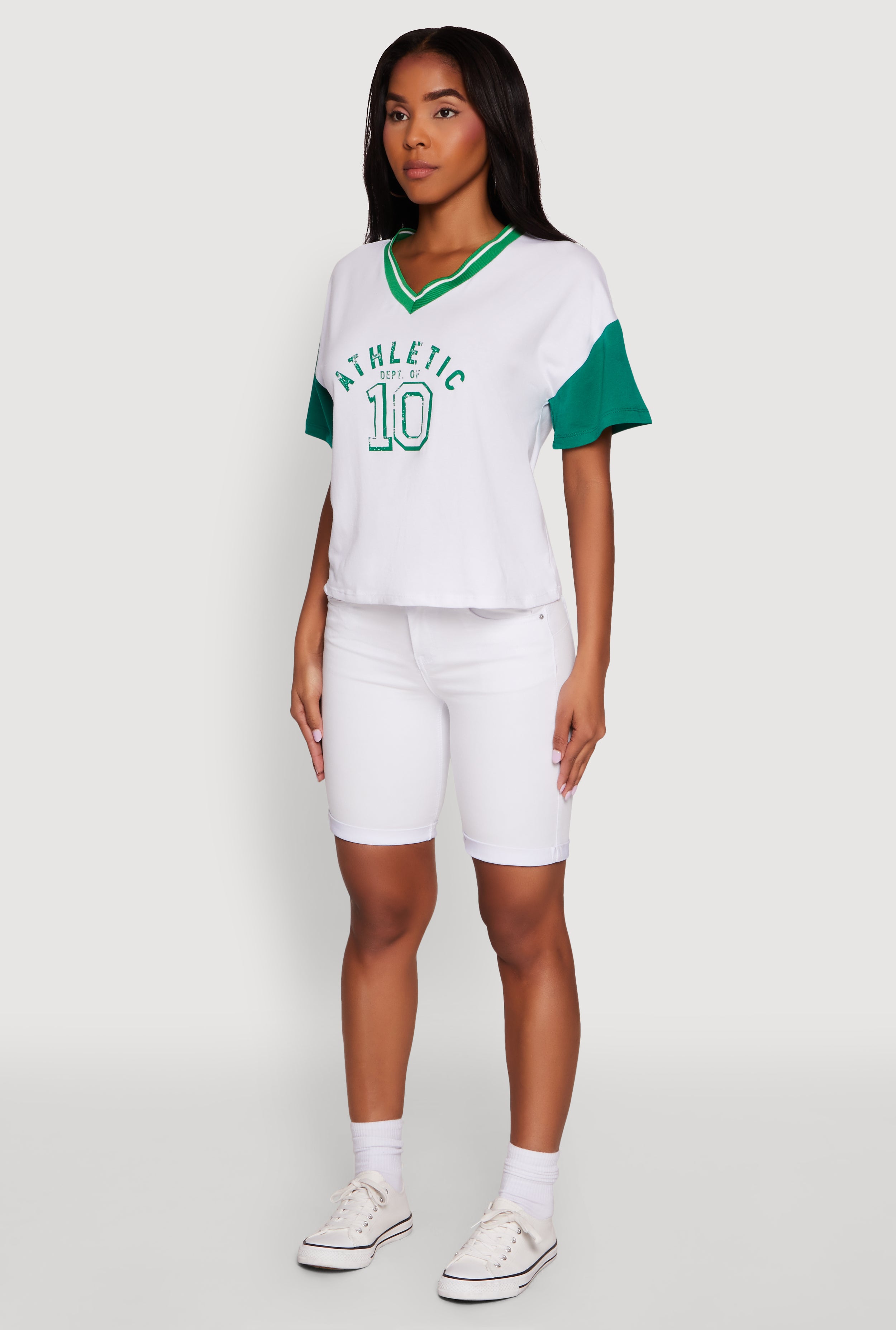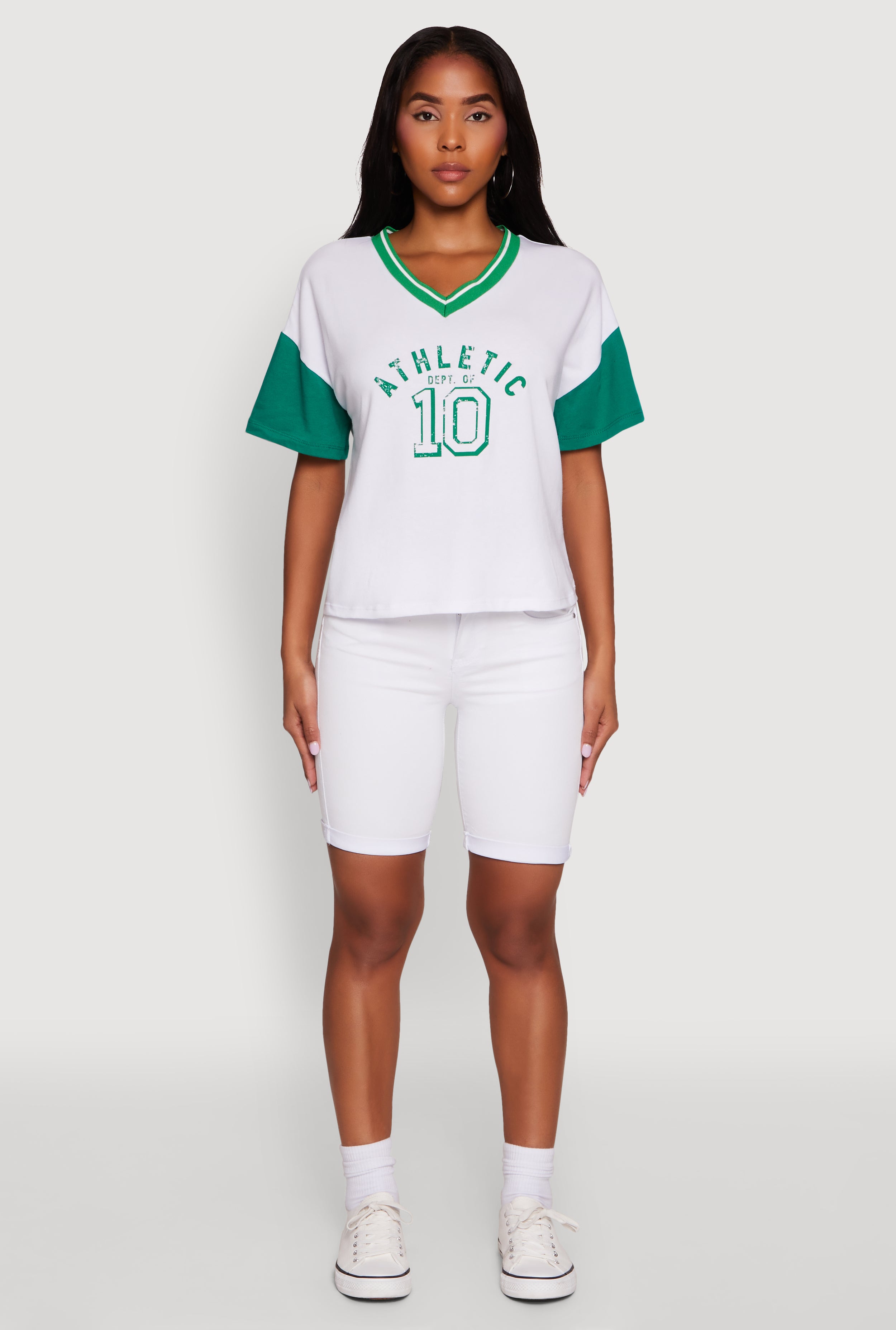 Step up your casual game with the Athletic Dept Graphic V Neck Baseball Tee. This classic fit tee features a sporty V-neck and bold Athletic Dept of 10 graphic. Whether you're hitting the streets or lounging with friends, its timeless silhouette and contrast trim details keep you looking effortlessly fresh. Perfect for those who love laid-back vibes with a touch of sporty edge.