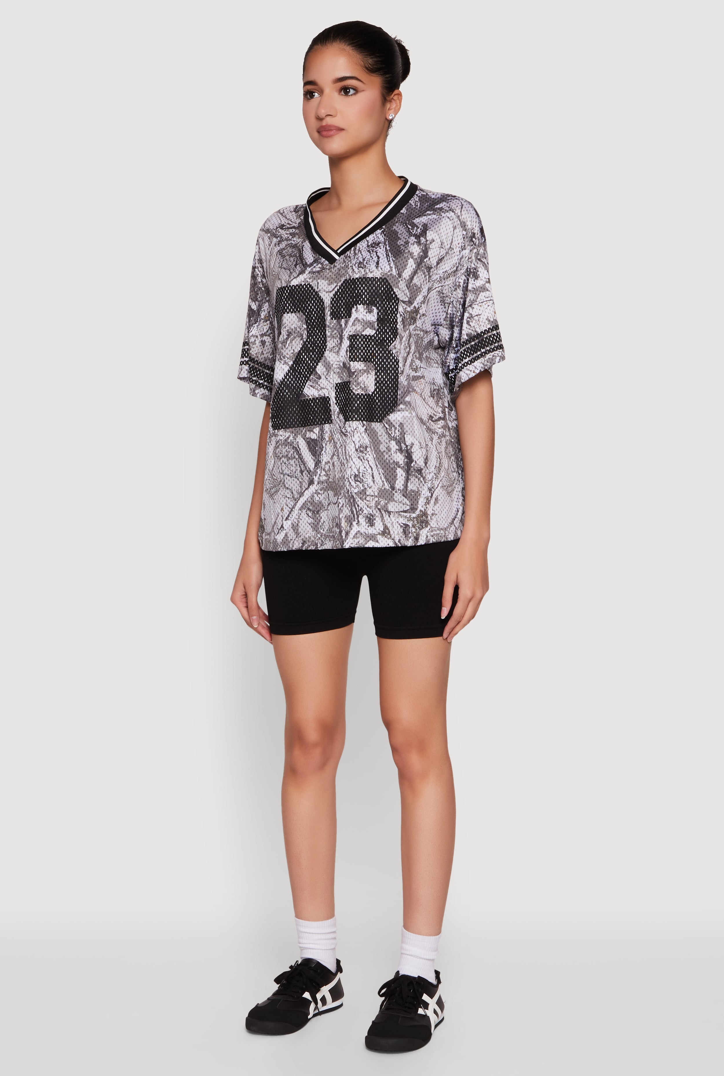 Show off your sporty side with the 23 Football Graphic Top. This stylish women’s T-shirt combines a classic fit with a bold varsity stripe detail that’s perfect for everyday wear or game day. The V-neck adds a touch of femininity, while the short sleeves keep it cool and comfortable. Whether you're hanging out with friends or cheering from the sidelines, this top is your new go-to for effortless style and comfort.