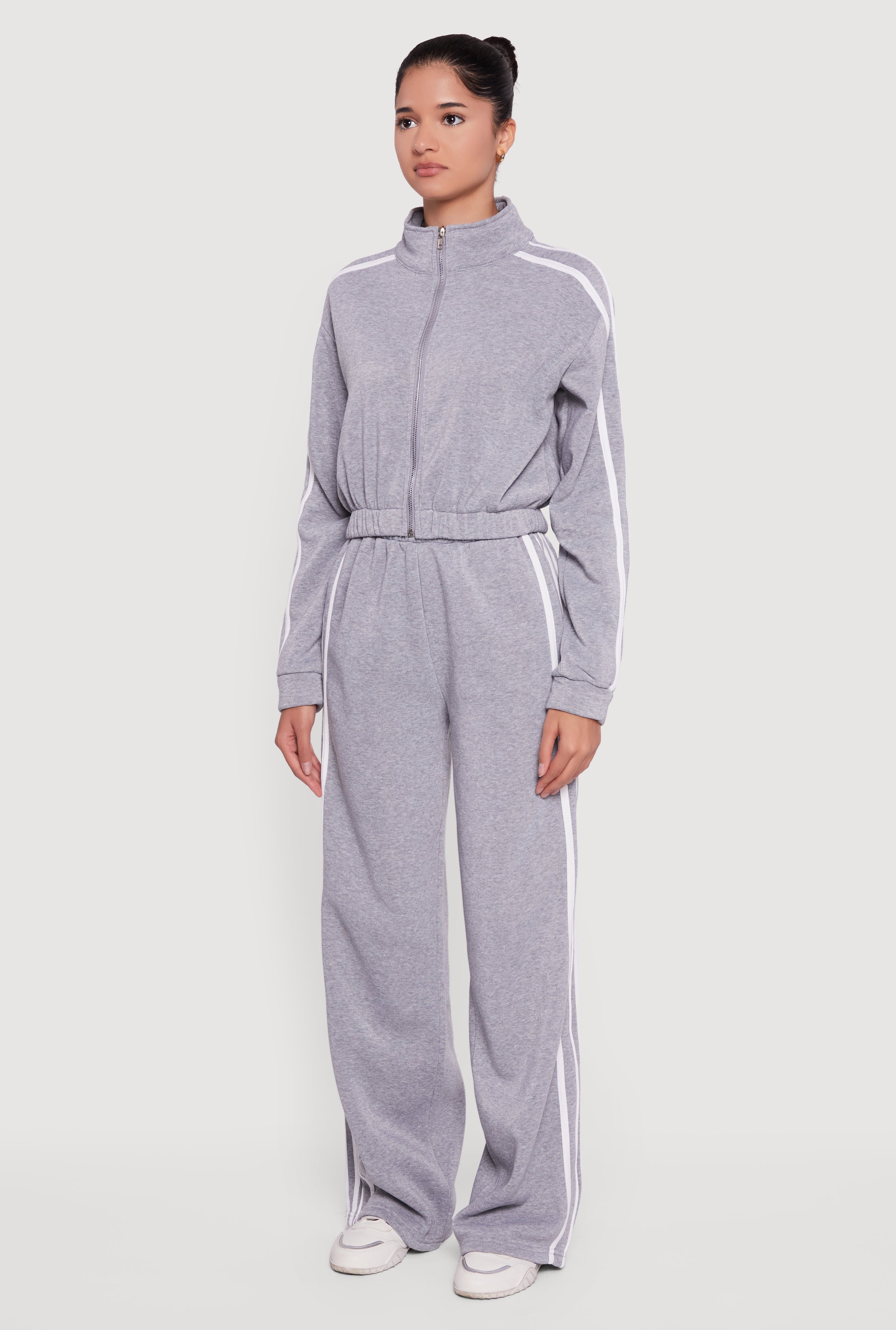 Step up your casual game with this Contrast Trim Zip Front Mock Neck Sweatshirt. Perfect for those days when you want to stay cozy without sacrificing style, this fleece-lined sweatshirt features a sleek zip front and sporty side stripes that add a pop of contrast. The mock neck and drop shoulder design bring a laid-back vibe, making it a must-have for athleisure lovers and everyday wear alike.