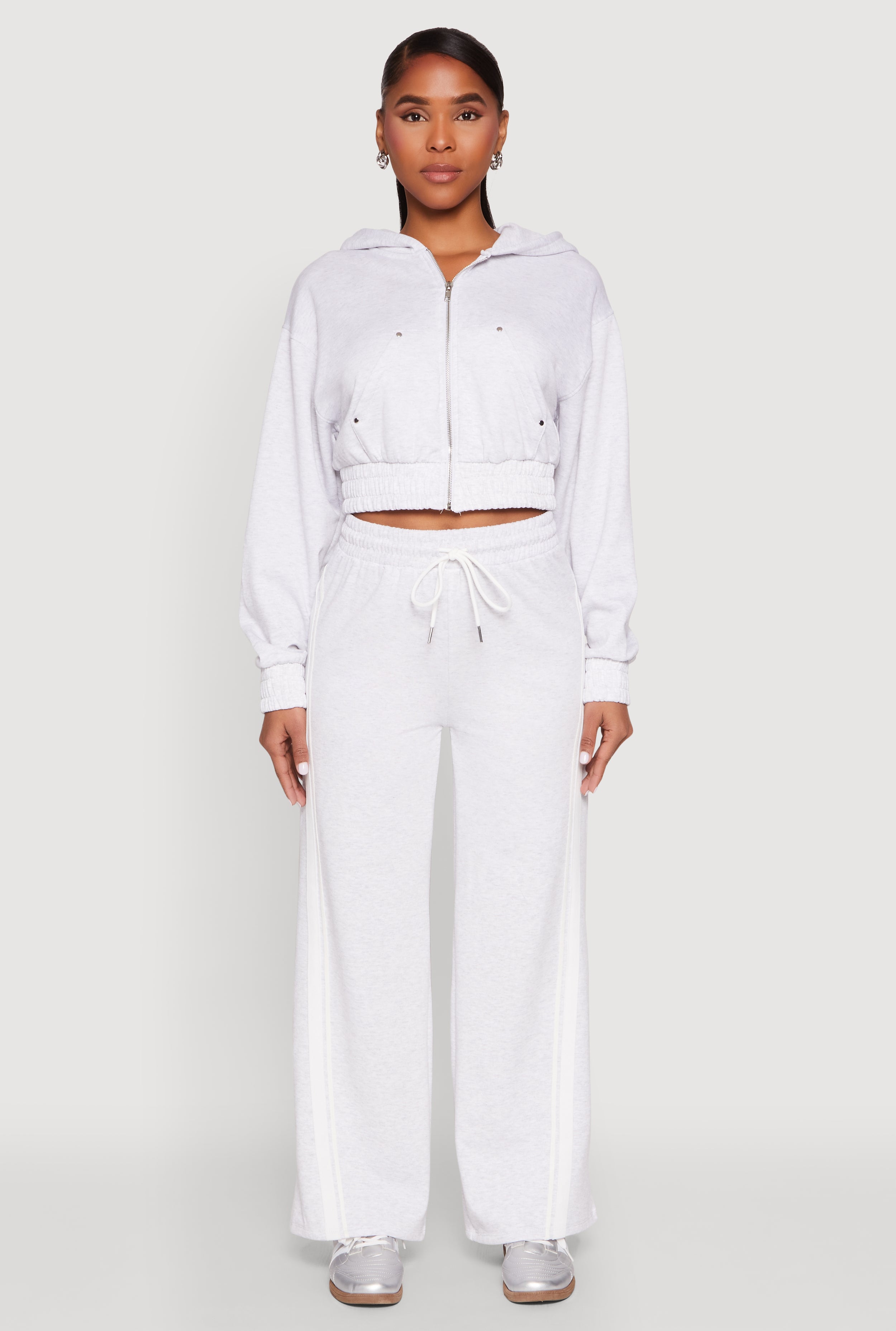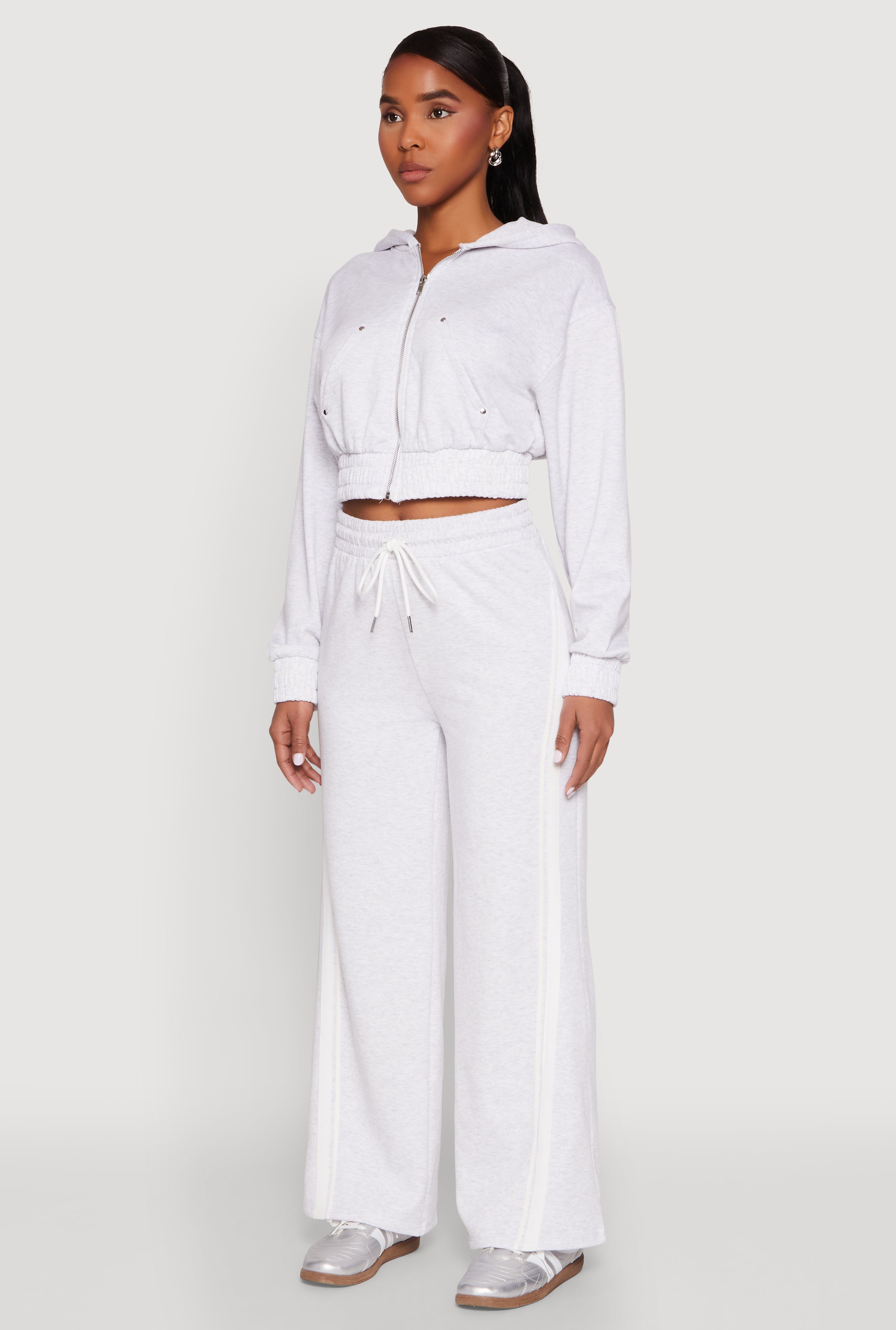 Stay cozy and effortlessly stylish with the Iris Zip Front Hoodie. Perfect for those active days or casual hangouts, this hoodie combines comfort with a touch of edge thanks to its lined, studded, and zipper details. Its classic fit and cropped hem make it a versatile piece that pairs perfectly with your favorite leggings or jeans. Whether you're hitting the gym or running errands, this sweatshirt is your new go-to for laid-back, trendy vibes.