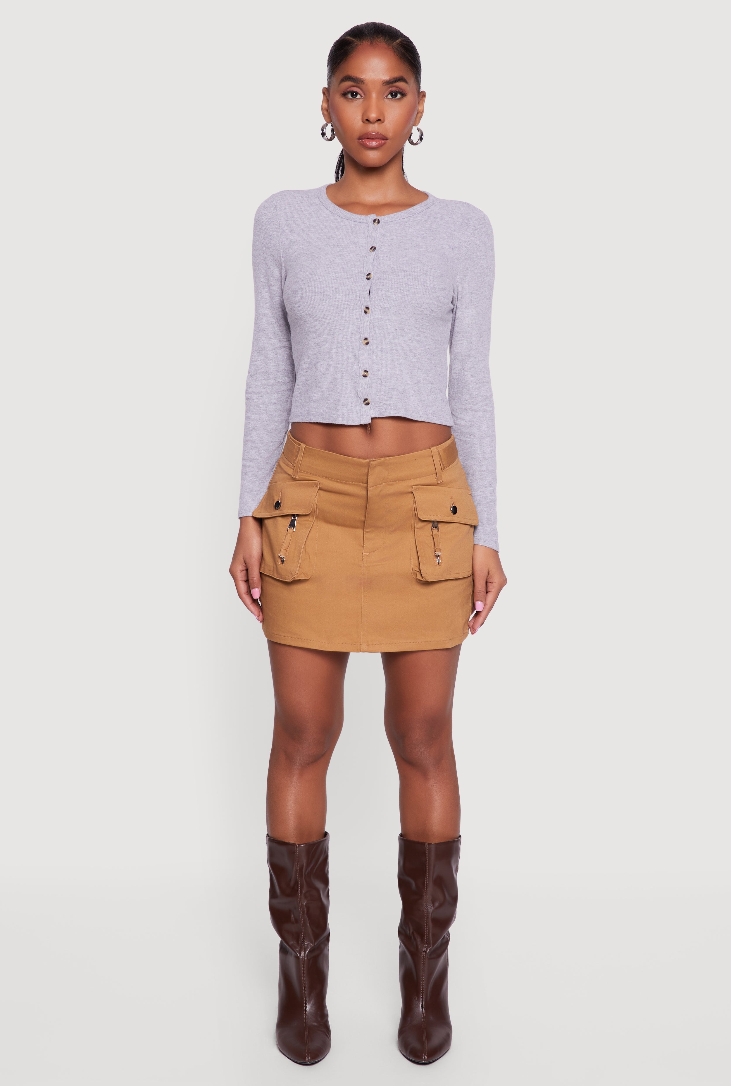• Ribbed Knit Button Front Long Sleeve Crop Top