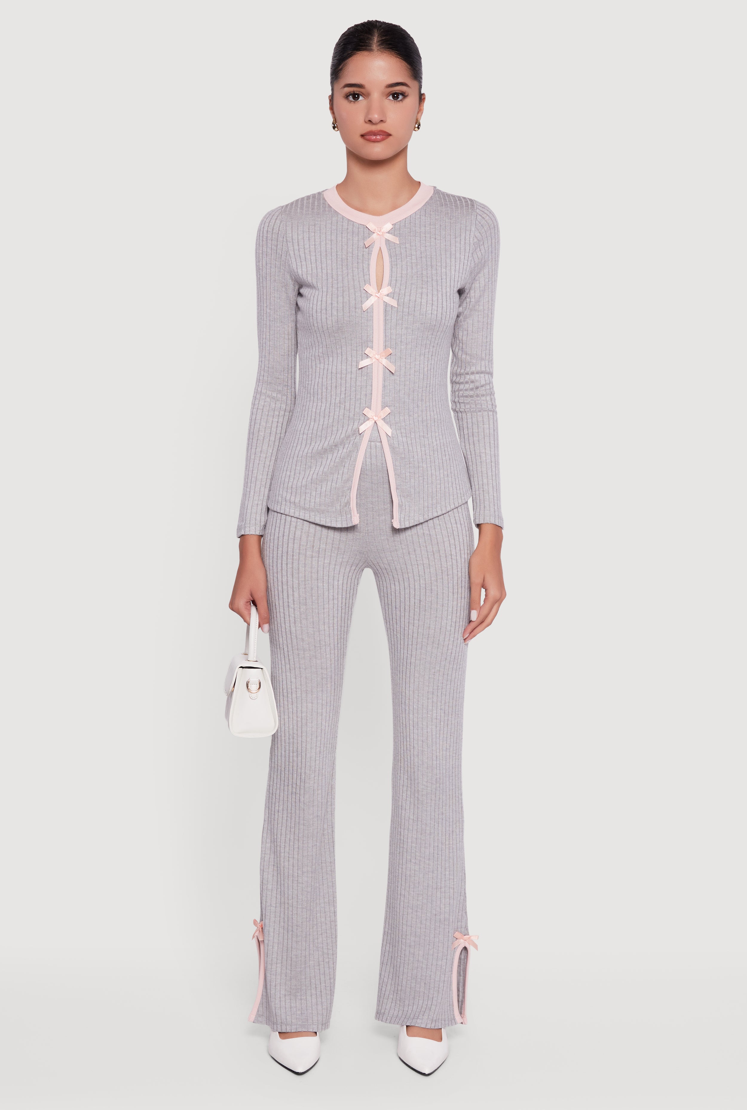 Elevate your everyday look with this Ribbed Knit Long Sleeve Crew Neck Top with Bows. Designed for effortless style and comfort, this classic-fit sweater features a cozy, ribbed knit fabric that hugs your silhouette just right. The keyhole, slit front, charming bow details, and contrast trim add a playful and feminine touch, making it perfect for casual outings or layering up on cooler days. A wardrobe essential that blends timeless design with a fun twist.