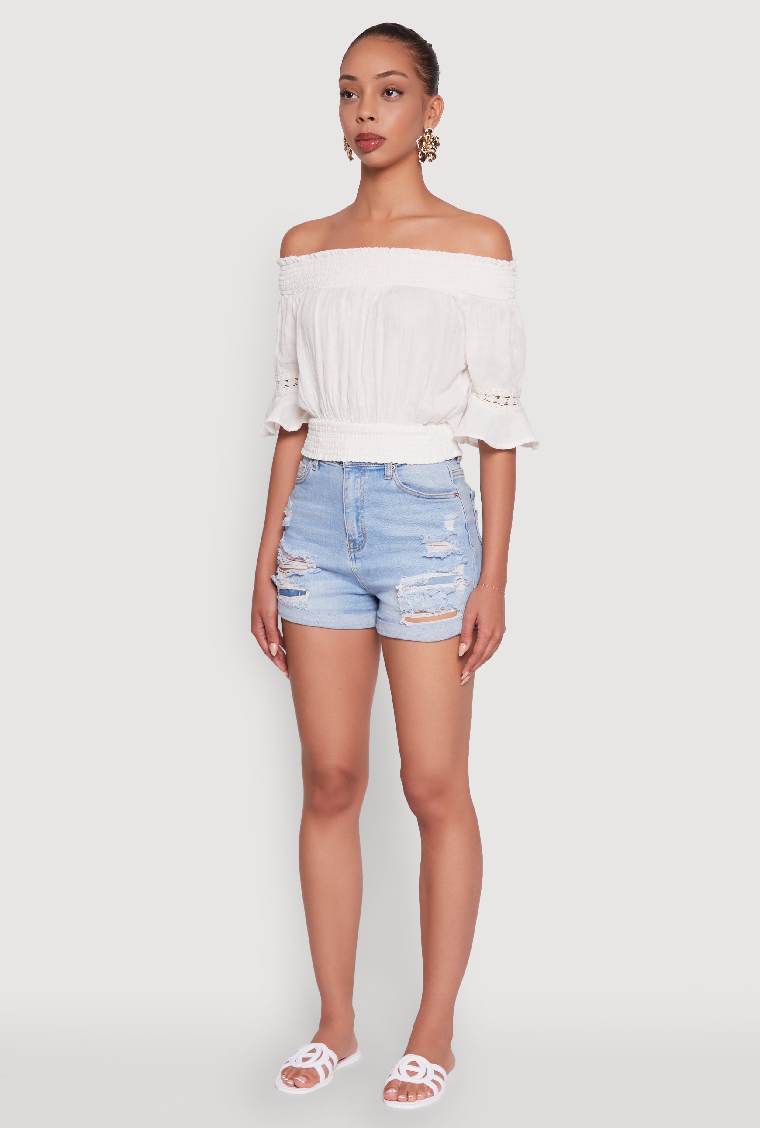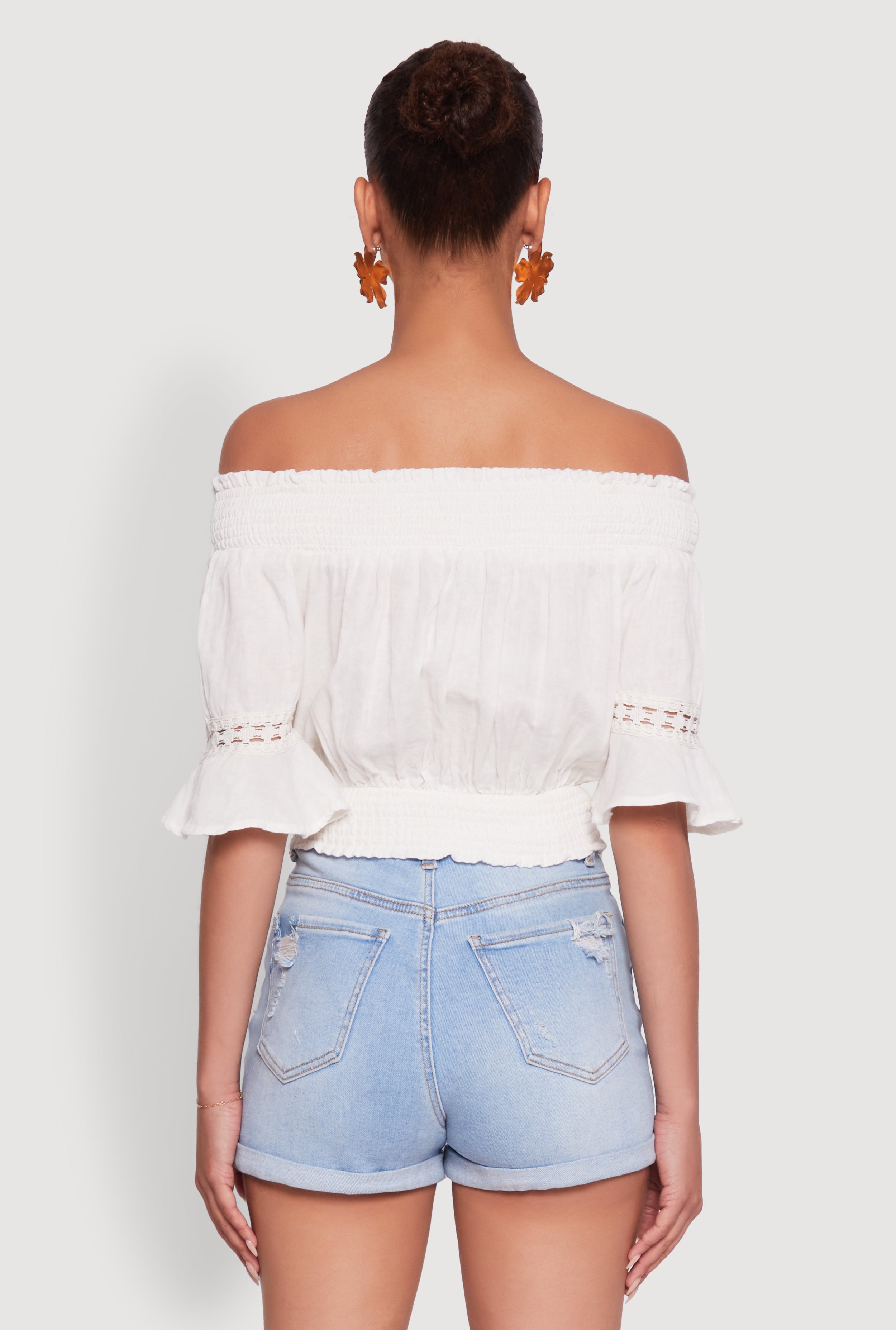 Get ready to turn heads with this Off The Shoulder Smocked Cropped Peasant Top. Its classic fit and fluttery short sleeves bring that perfect mix of timeless charm and playful vibes. The smocked waist hugs you just right, giving you a flattering silhouette that feels as good as it looks. Whether you're heading to a festival, chilling on vacation, or just keeping it casual, this solid-colored crop is your new go-to for effortless style.