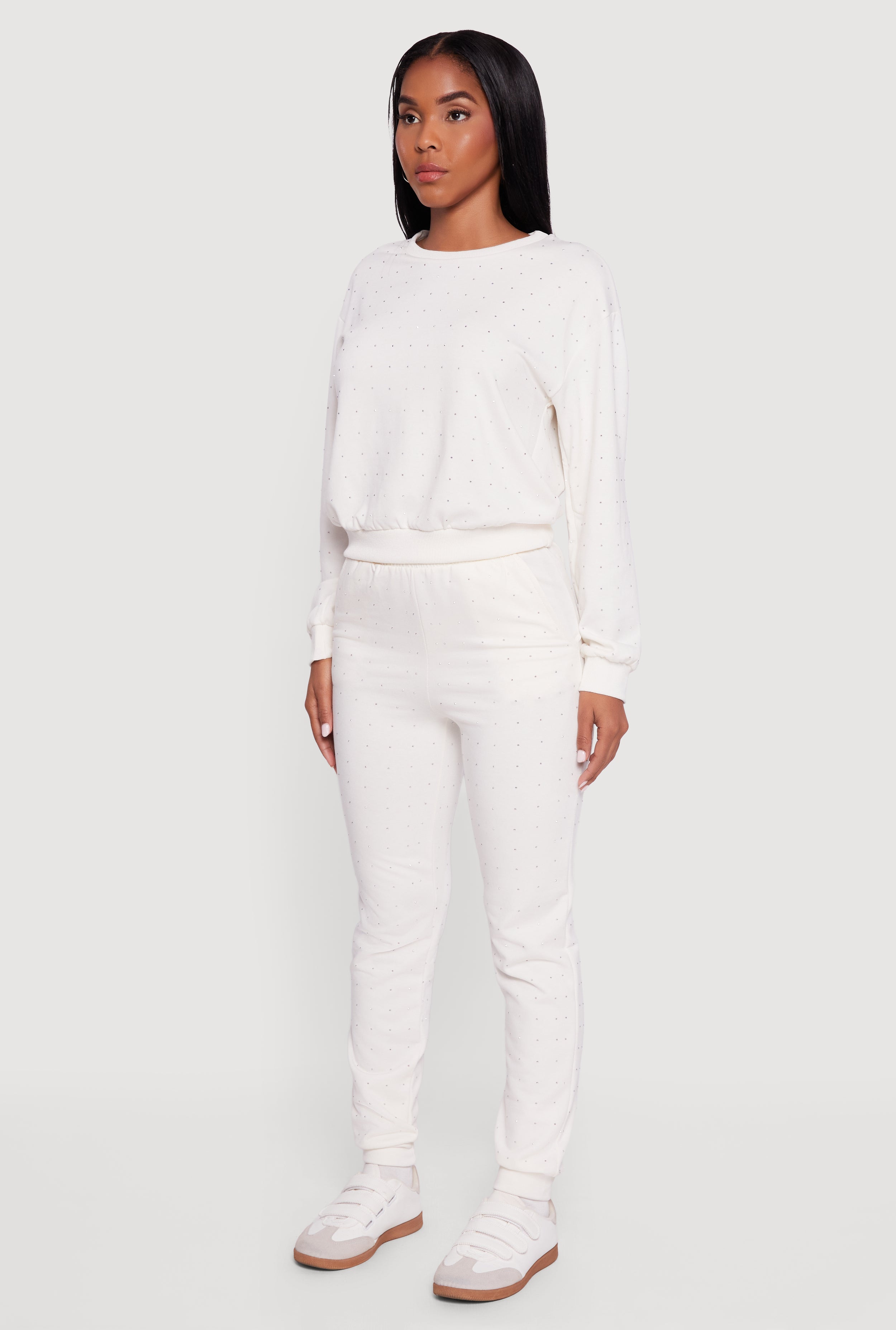 Shine bright and stay cozy in this Rhinestone Studded Long Sleeve Pullover Sweatshirt. Designed with a classic fit and a comfy crew neck, this fleece sweatshirt adds just the right amount of sparkle to your everyday look. Perfect for chill days when you want to feel stylish without sacrificing comfort.