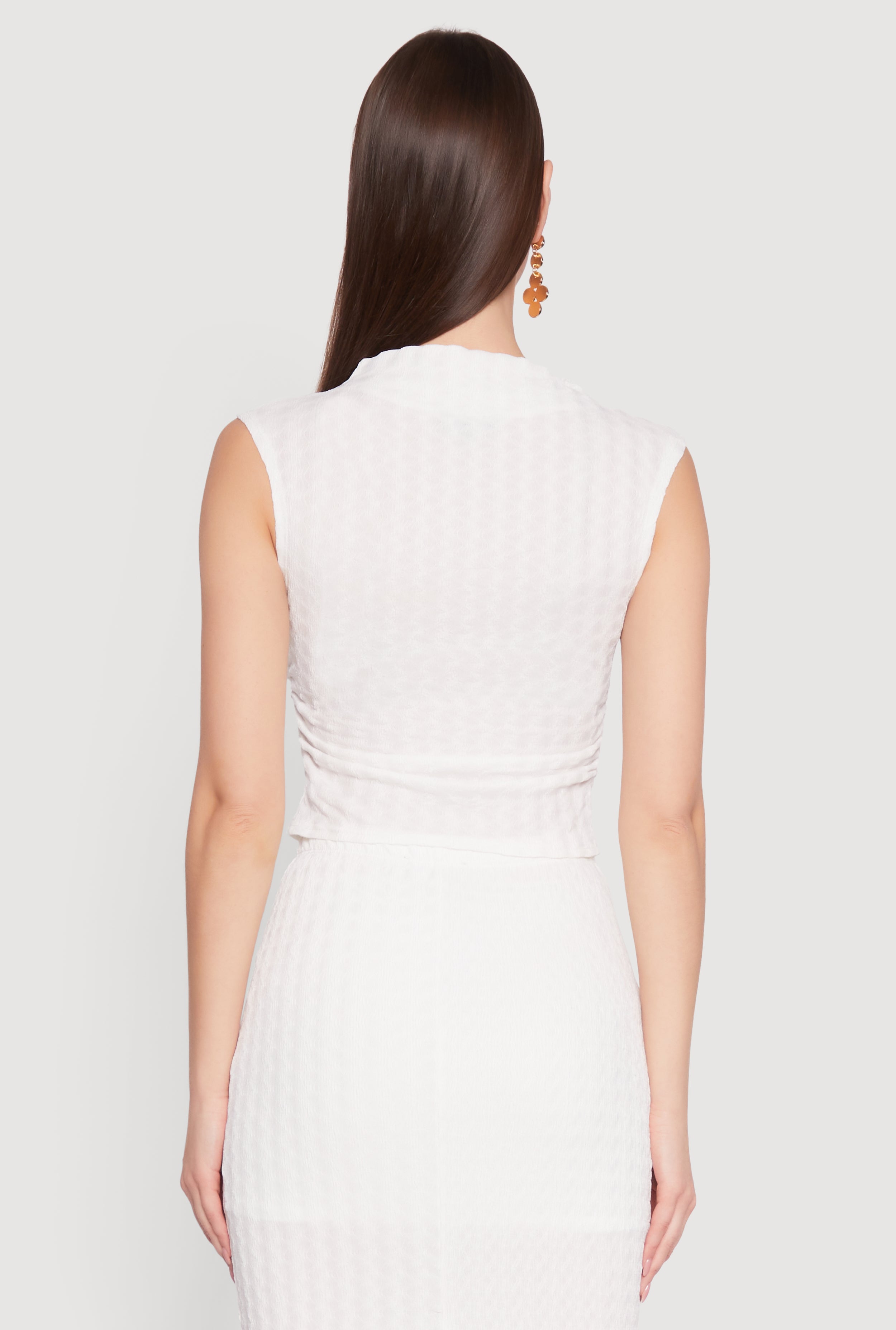 Upgrade your wardrobe with the Ruched Funnel Neck Sleeveless Top, a chic and versatile piece that effortlessly combines style and comfort. Perfect for casual days or dressing up for a night out, this blouse features a classic fit with a timeless silhouette. The textured knit material adds a touch of sophistication, while the cropped hem gives it a modern edge. Whether you're pairing it with jeans or skirts, this top is your new go-to for effortless fashion.