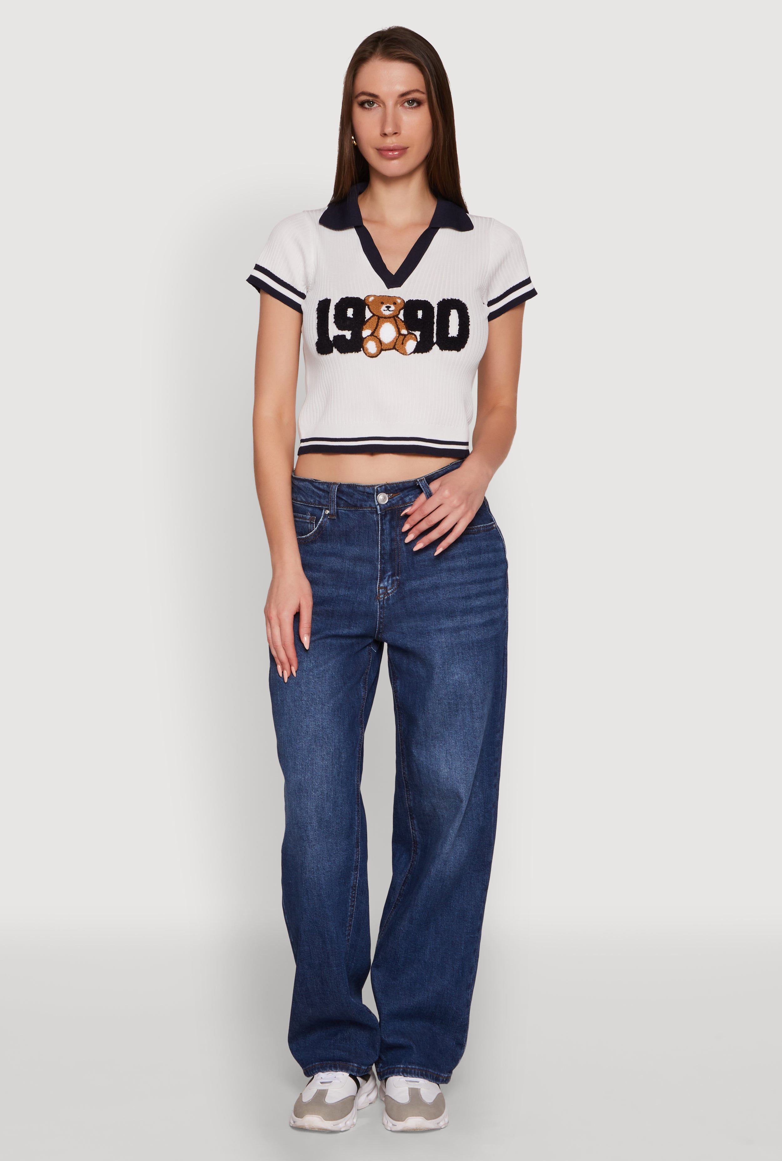 Upgrade your casual wardrobe with this fun and nostalgic Varsity Striped Embroidered 1990 Bear Graphic Polo Shirt. Perfect for adding a touch of vintage charm to your everyday look, this shirt combines classic style with playful details. Whether you're out with friends or just lounging in style, this polo is your new go-to. Its timeless silhouette and cropped hem make it a versatile piece that pairs effortlessly with jeans or skirts. Feel confident, look cute, and embrace your unique vibe with this must-have top.