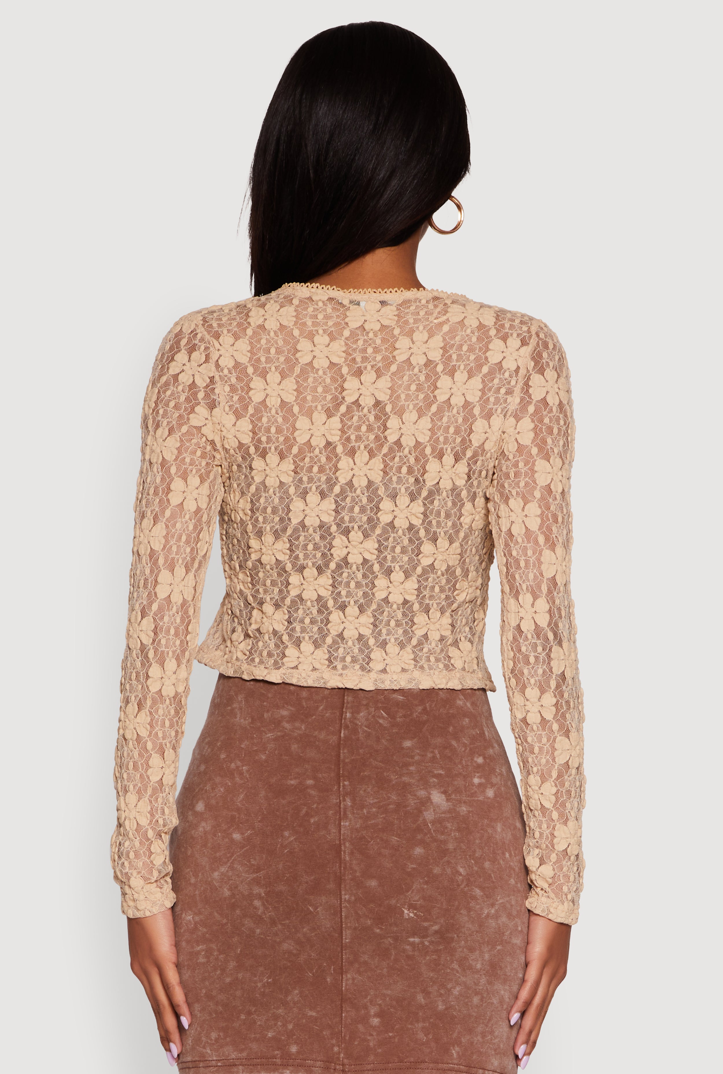 Step into effortless style with the Haute Monde Floral Lace Tie Front Crop Top. This long-sleeve, classic-fit piece features a delicate floral lace design and a flattering V-neckline that highlights your natural silhouette. The tie front hem adds a playful touch, making it perfect for casual days or vacation vibes. Lightweight and sheer, it’s a must-have layering staple that brings a fresh, feminine edge to your wardrobe.