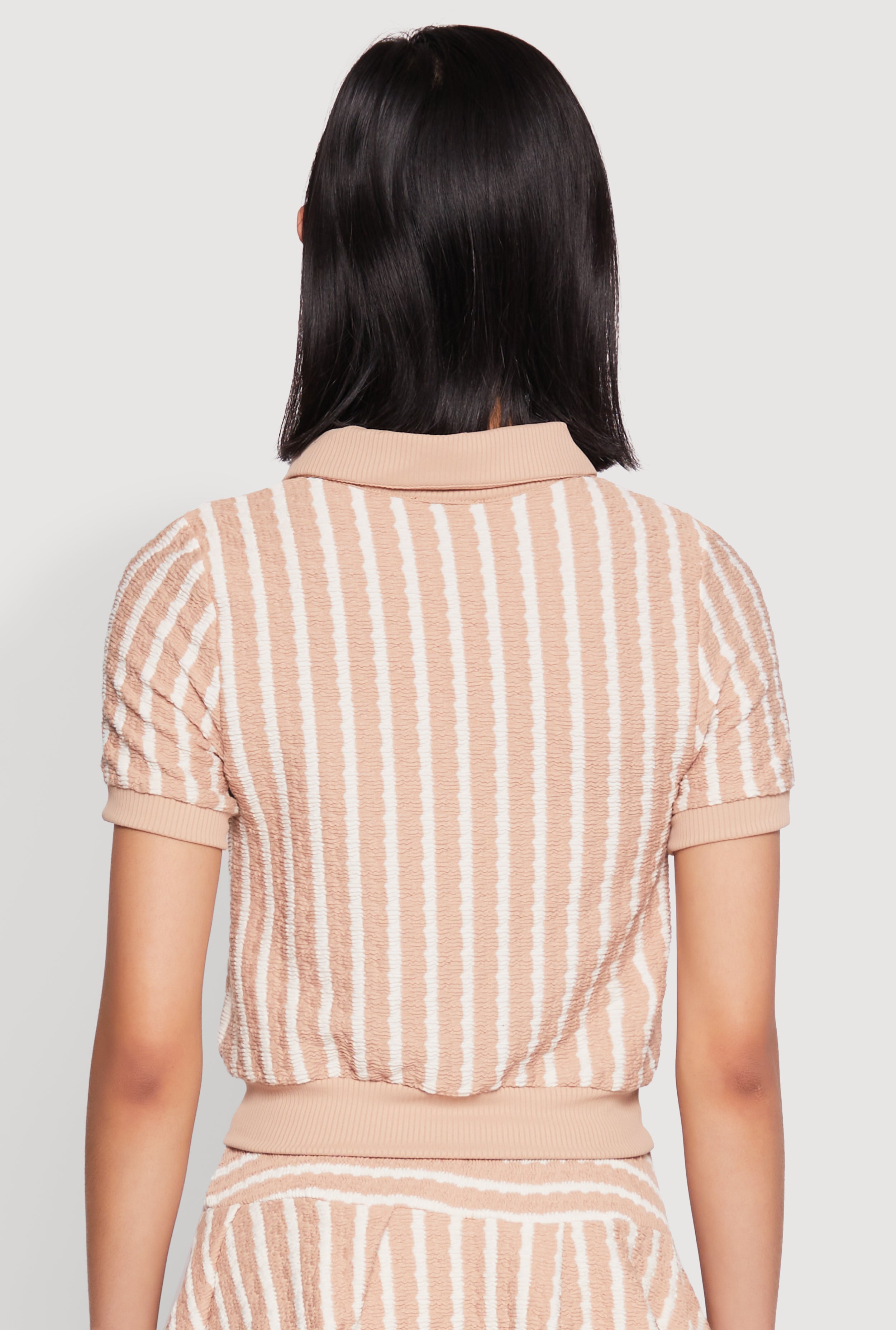 Upgrade your casual wardrobe with our Textured Knit Striped Polo Shirt, the perfect blend of comfort and style. Featuring a classic fit and timeless silhouette, this polo shirt is your go-to for effortless chic. The textured knit fabric adds a unique touch, while the contrast trim details give it a trendy edge. With short sleeves and a cropped hem, it’s ideal for those sunny days or layered looks. Whether you're dressing up or down, this versatile piece will keep you looking fresh and feeling confident all day long.