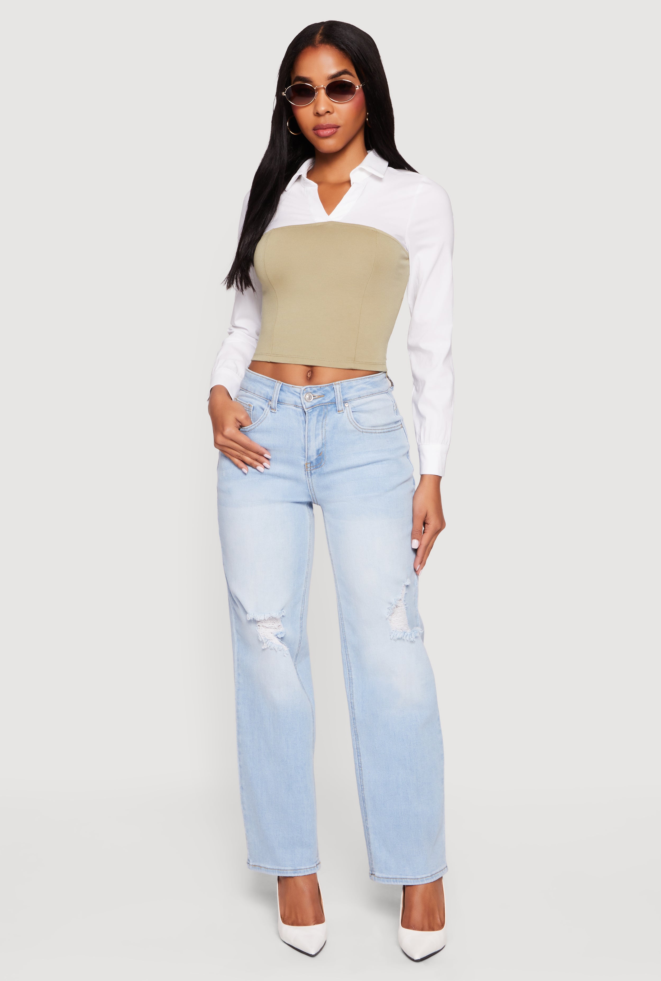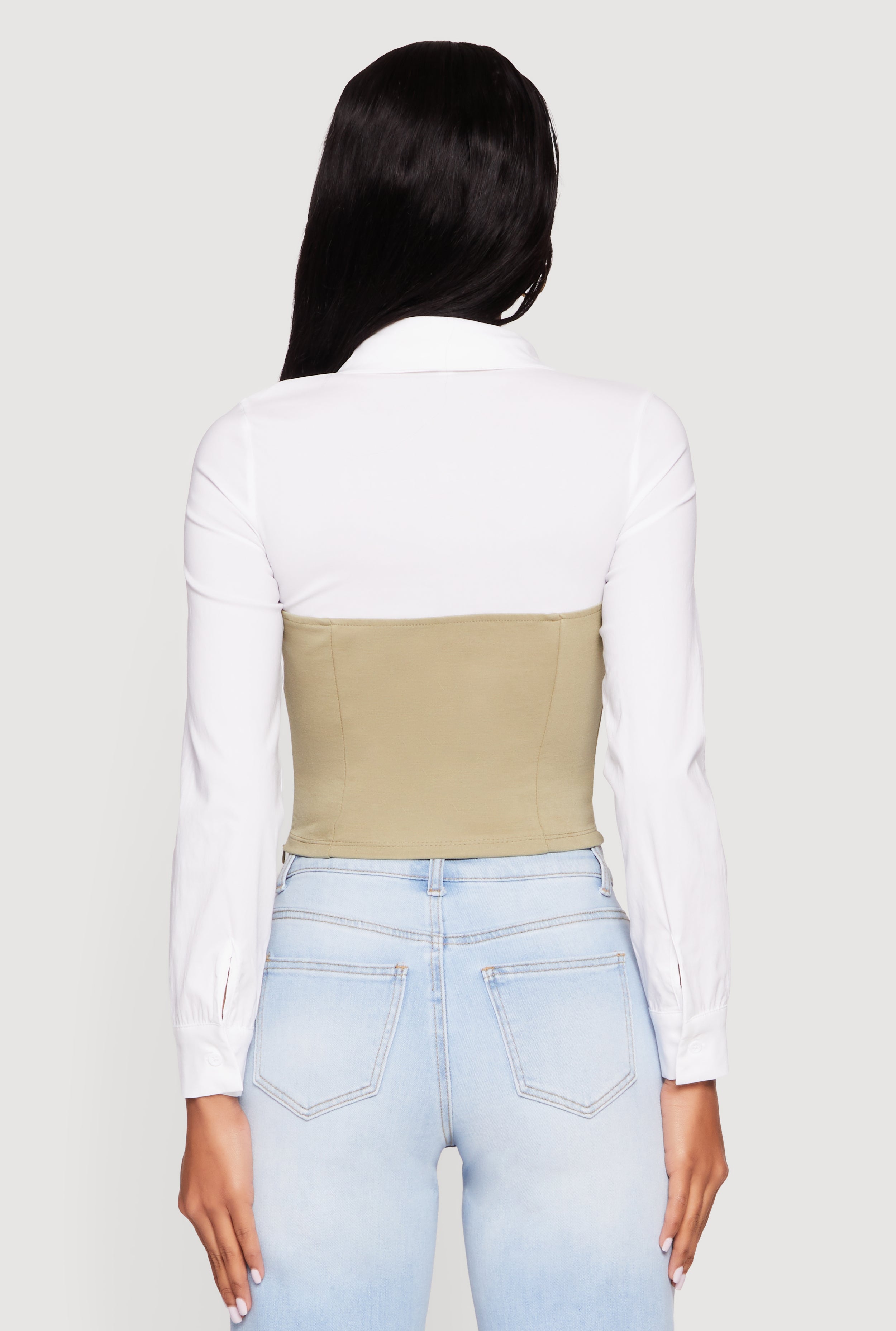 Step up your style game with the Layered Look Cropped Corset Top from Blâshe. This curve-hugging, color-blocked crop top features a sleek collared neckline and long sleeves for a chic, casual vibe. Made from soft crepe knit, it offers a comfortable fit while the zipper closure adds a modern edge. Perfect for turning heads whether you’re out with friends or just vibing on a casual day.