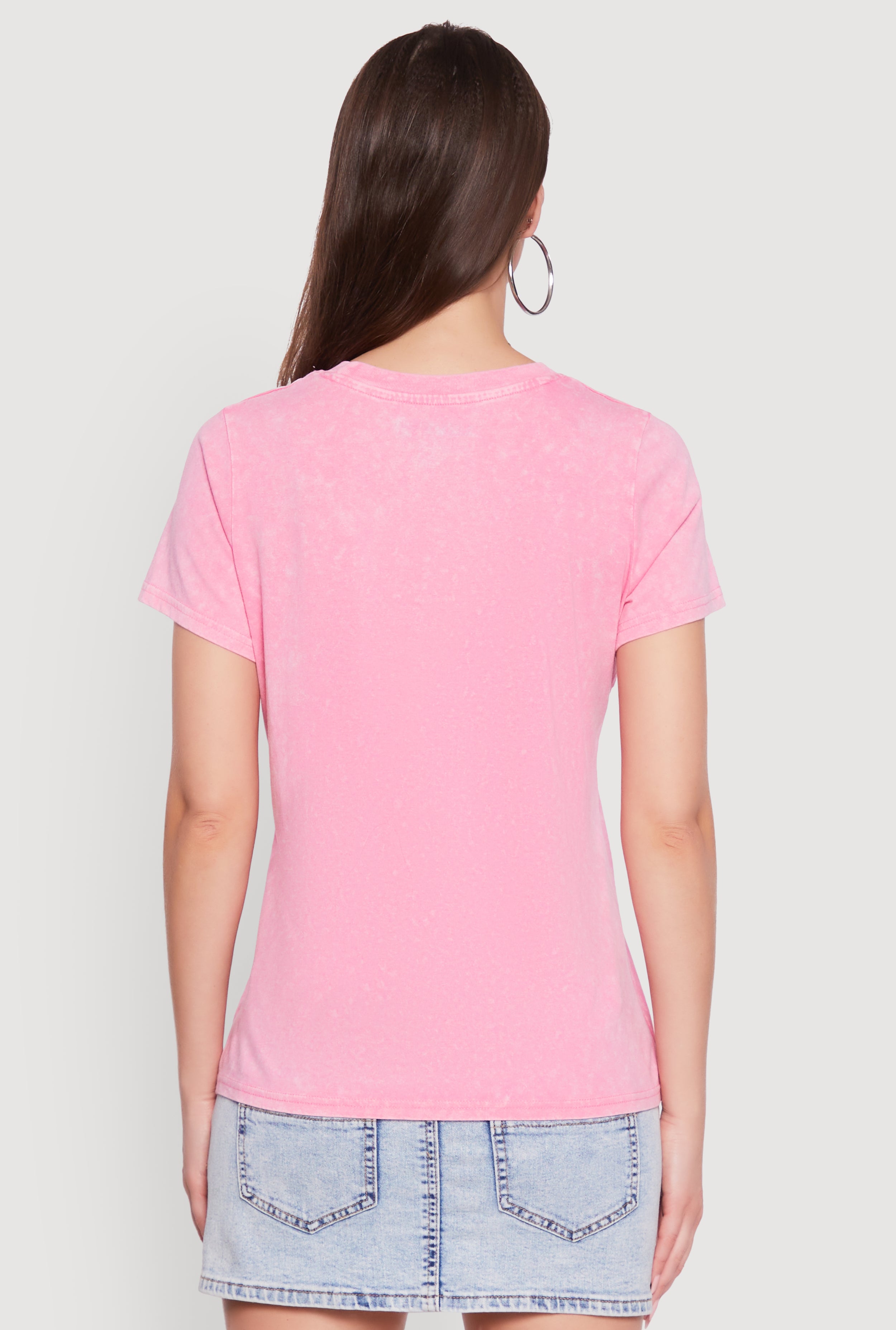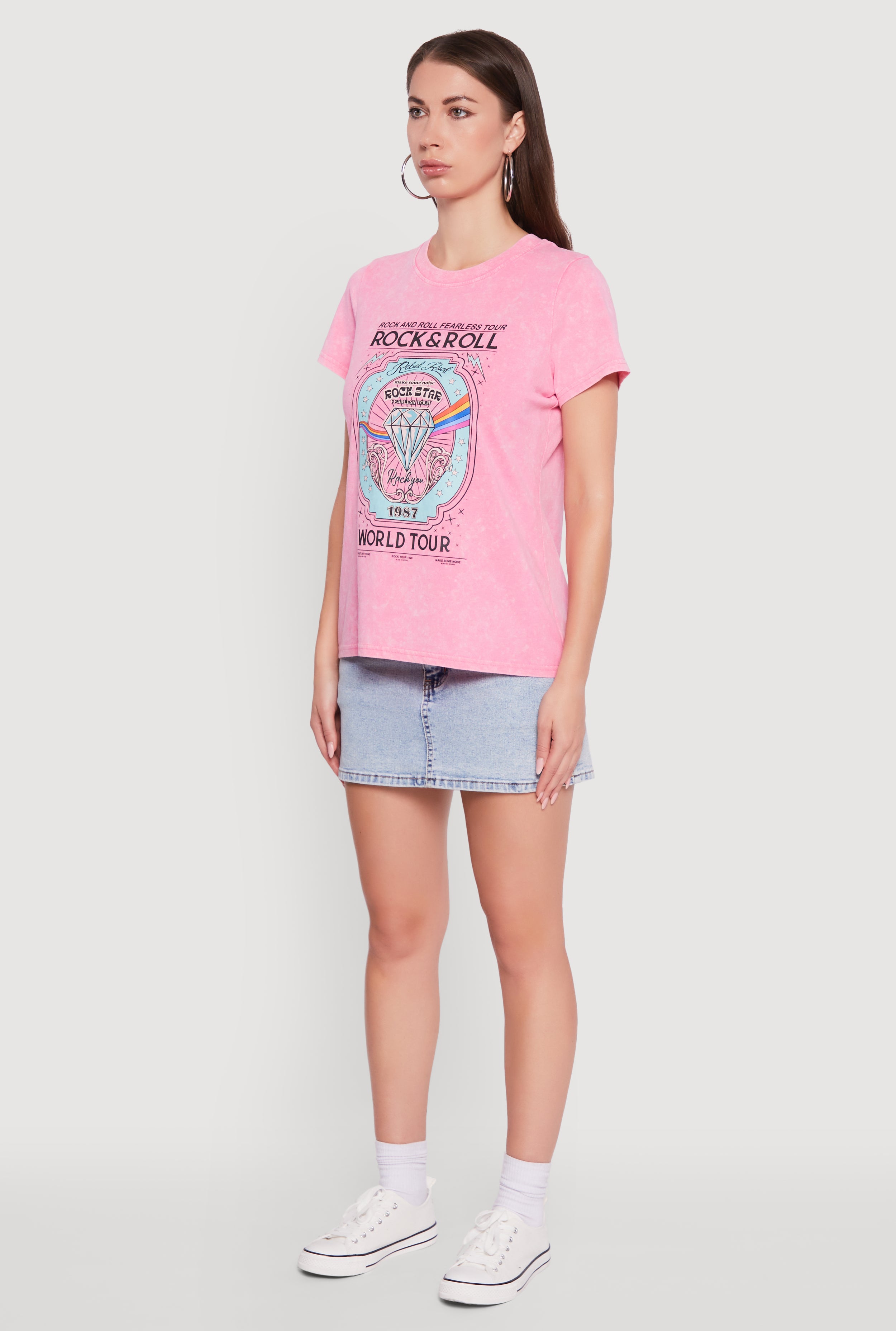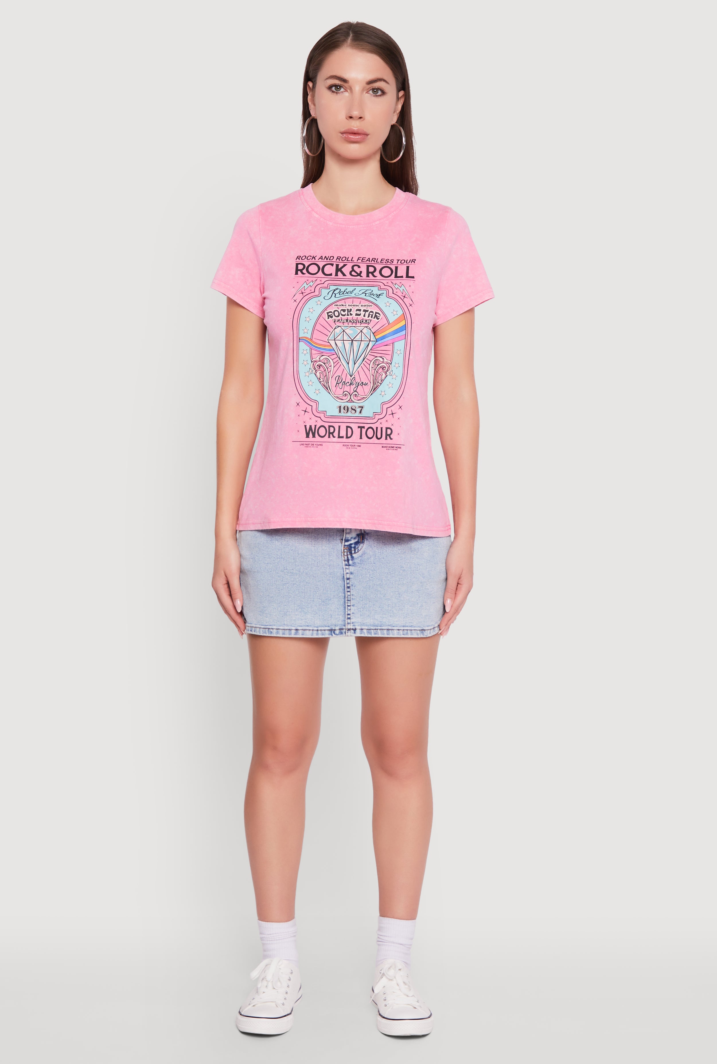- Eye-catching acid wash fabric with bold rock and roll graphics