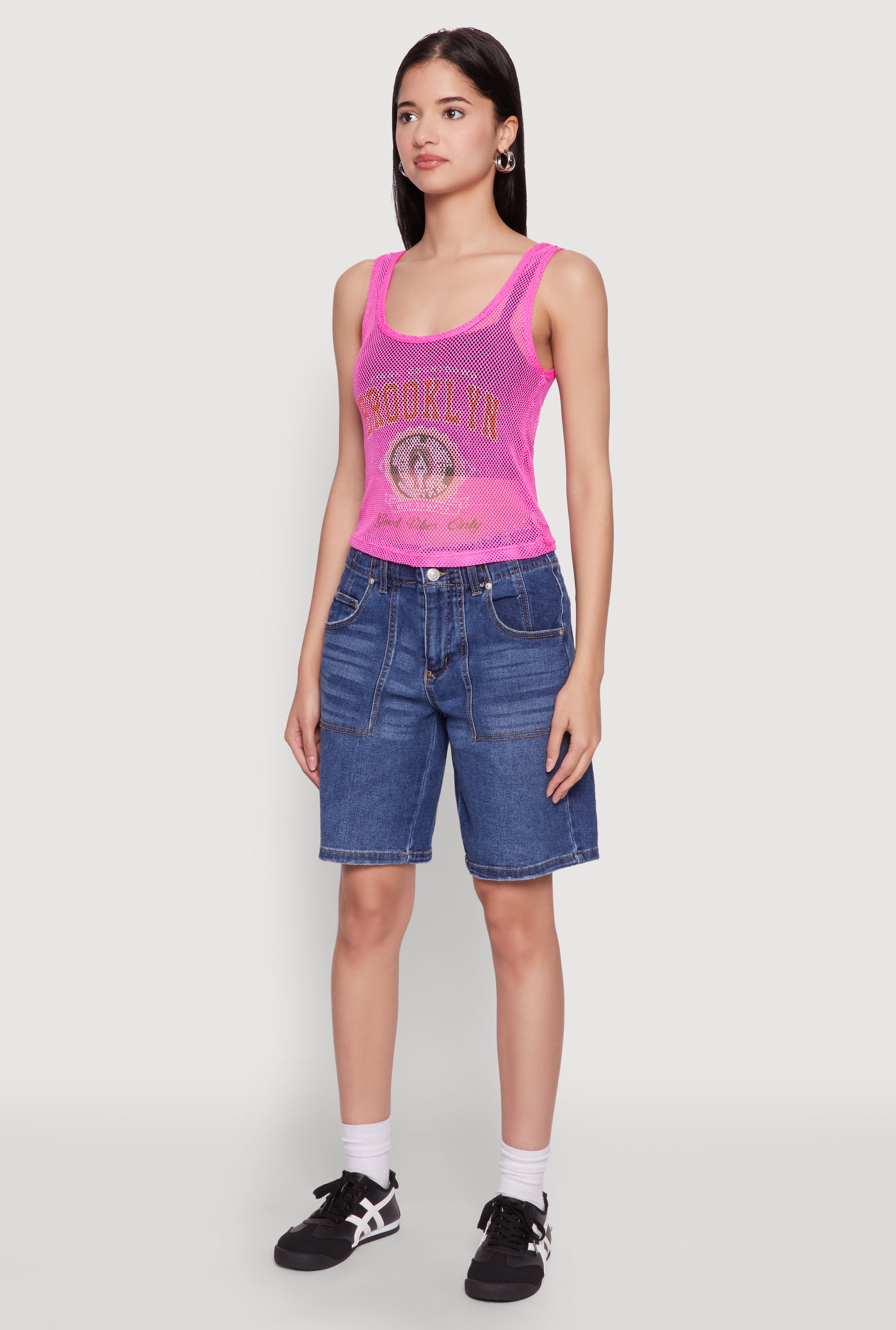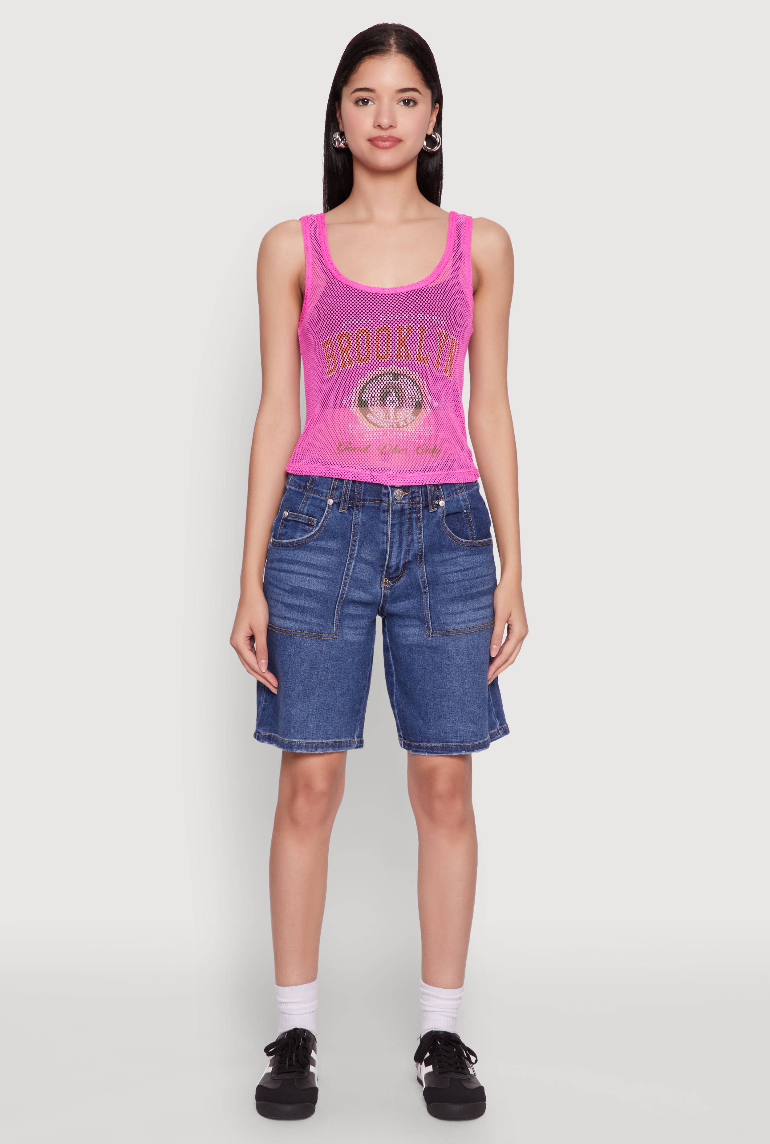 Step up your style game with the Brooklyn Graphic Fishnet Tank Top. This bold and edgy piece is perfect for making a statement while staying effortlessly cool. Its classic fit and timeless scoop neck make it a versatile addition to your wardrobe, whether you're heading out with friends or just want to elevate your everyday look. The sheer fishnet material adds a daring touch that’s sure to turn heads. Pair it with your favorite layers and accessories for a look that’s uniquely you.