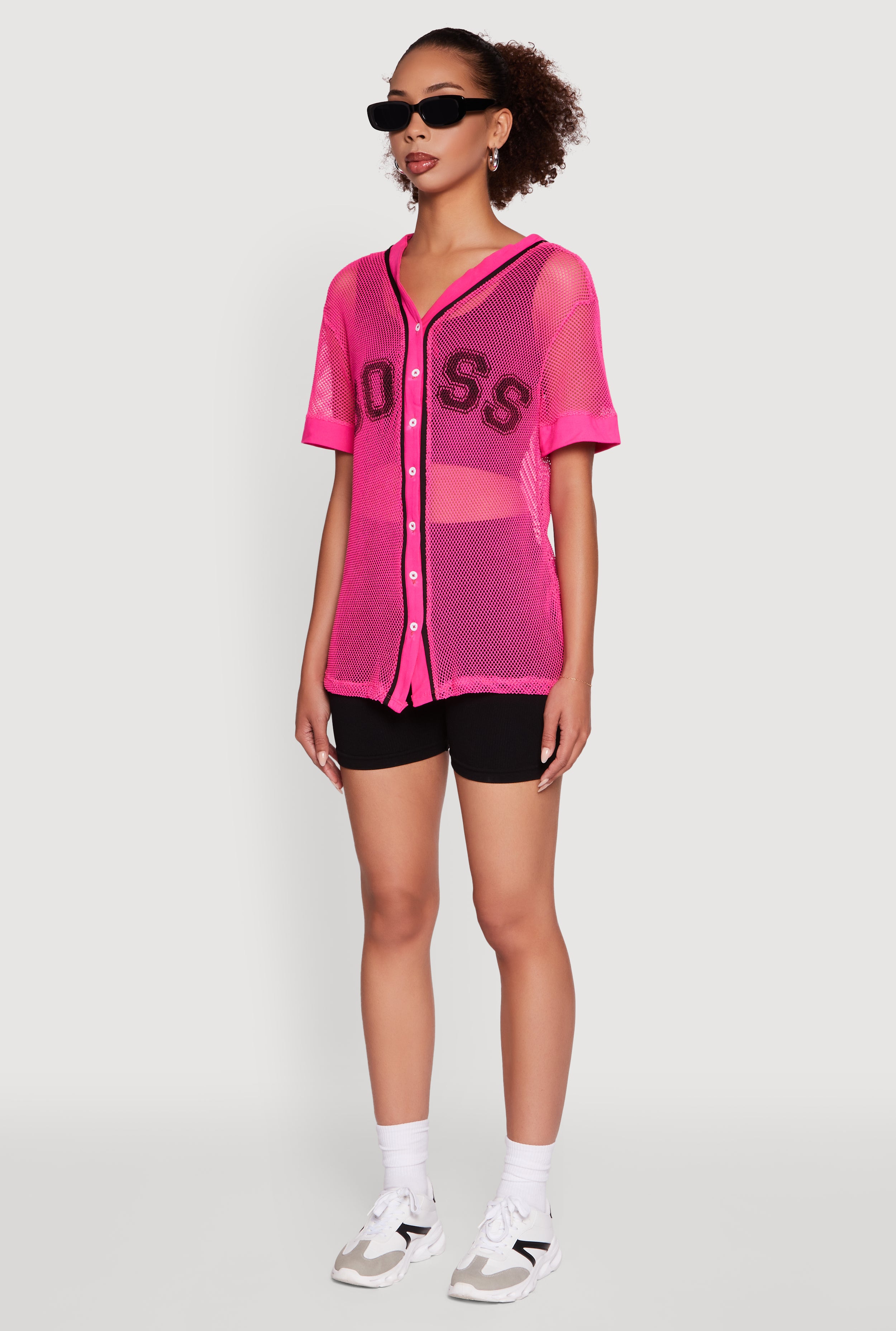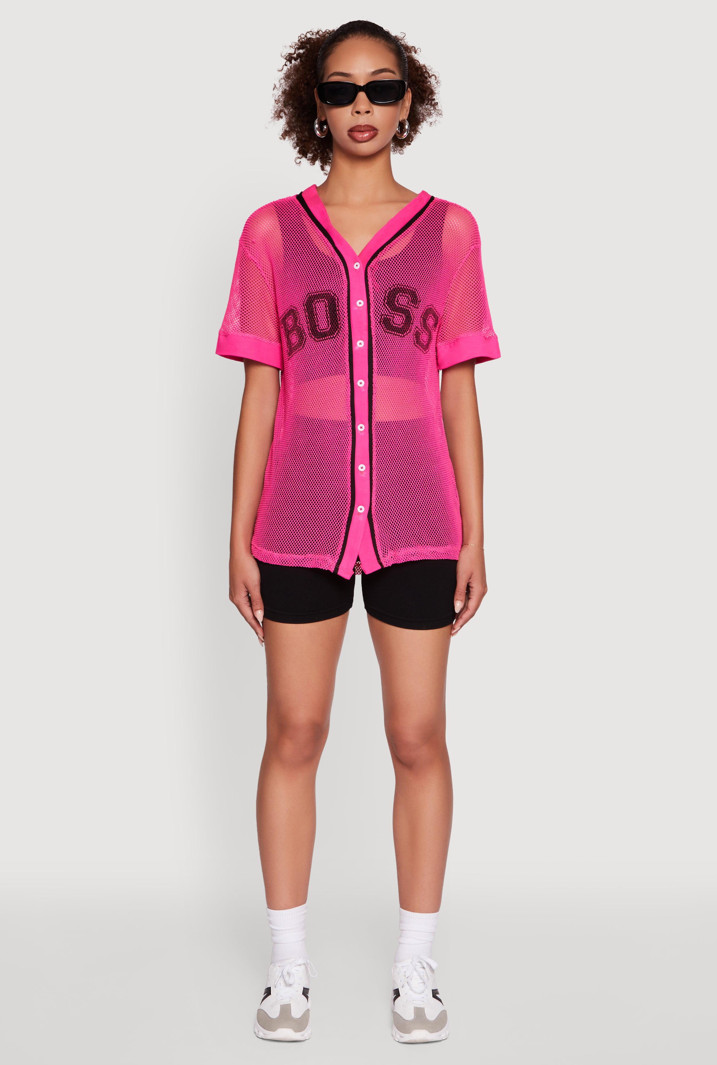 Step up your style game with the Fishnet Boss Graphic Baseball Shirt. This classic fit, short sleeve top blends sporty vibes with edgy fishnet fabric for a look that's equal parts bold and breathable. Featuring a striking "Boss" graphic and a button front, it’s perfect for those who want to flex confidence without trying too hard. Pair it with your fave jeans or layer over a bralette to own every casual outing like the true boss you are.