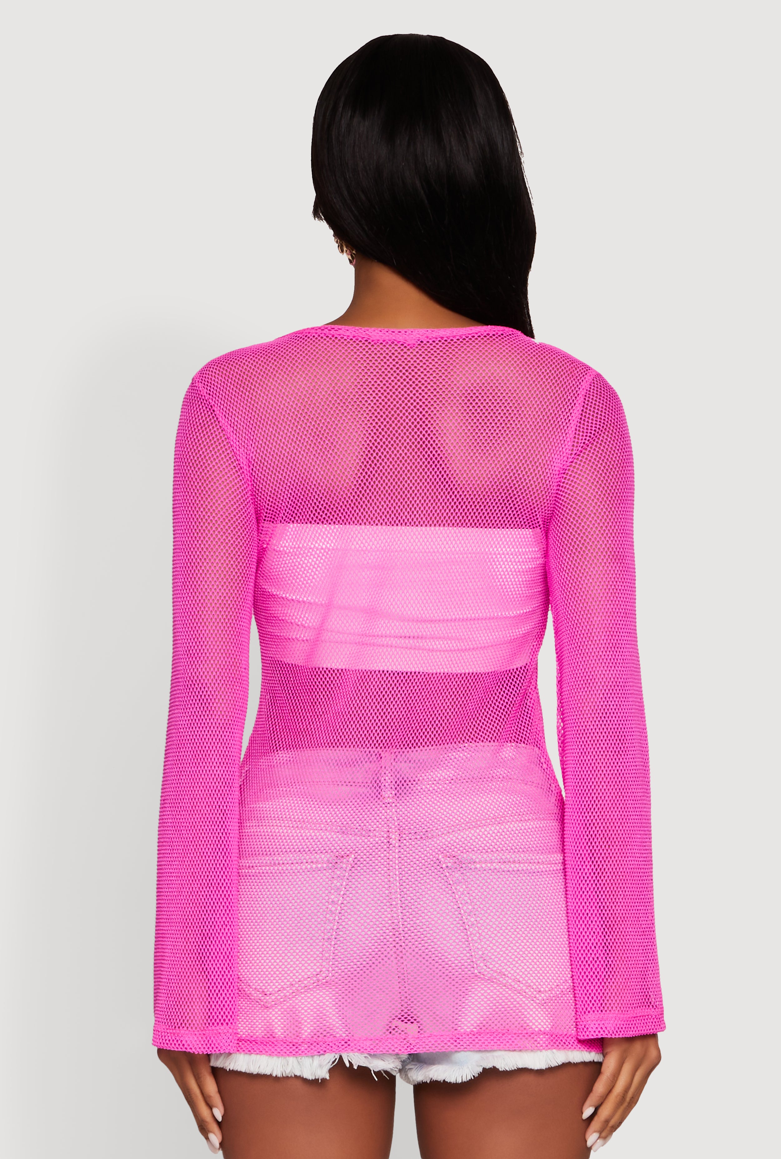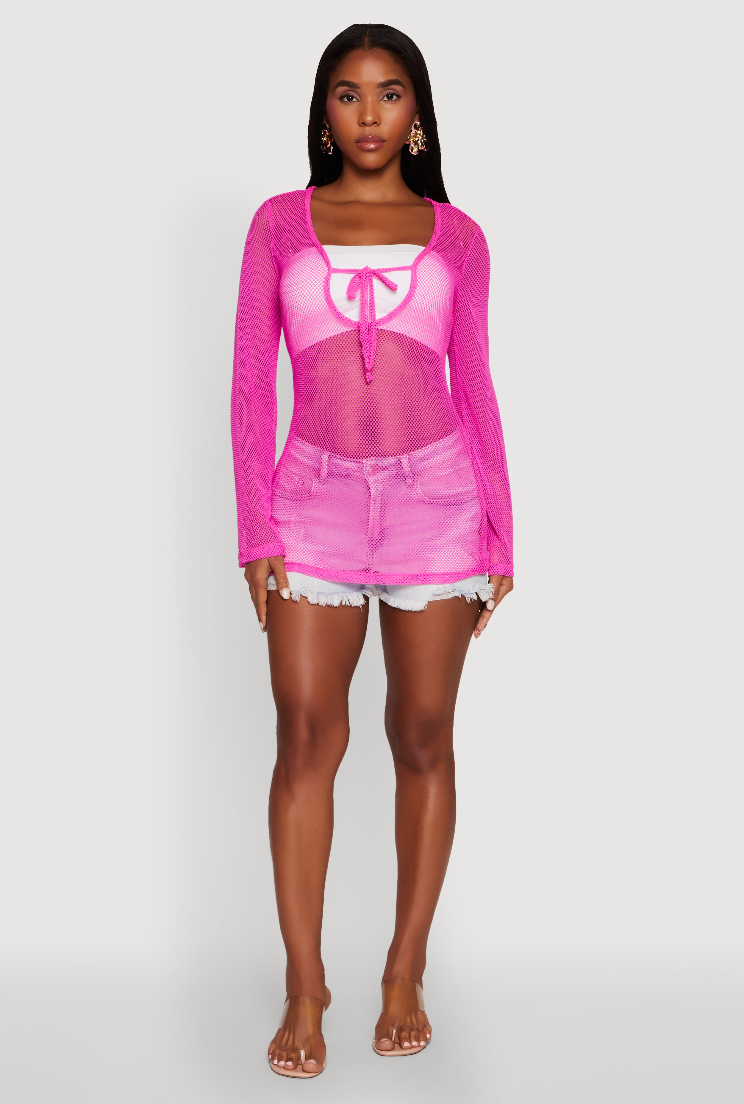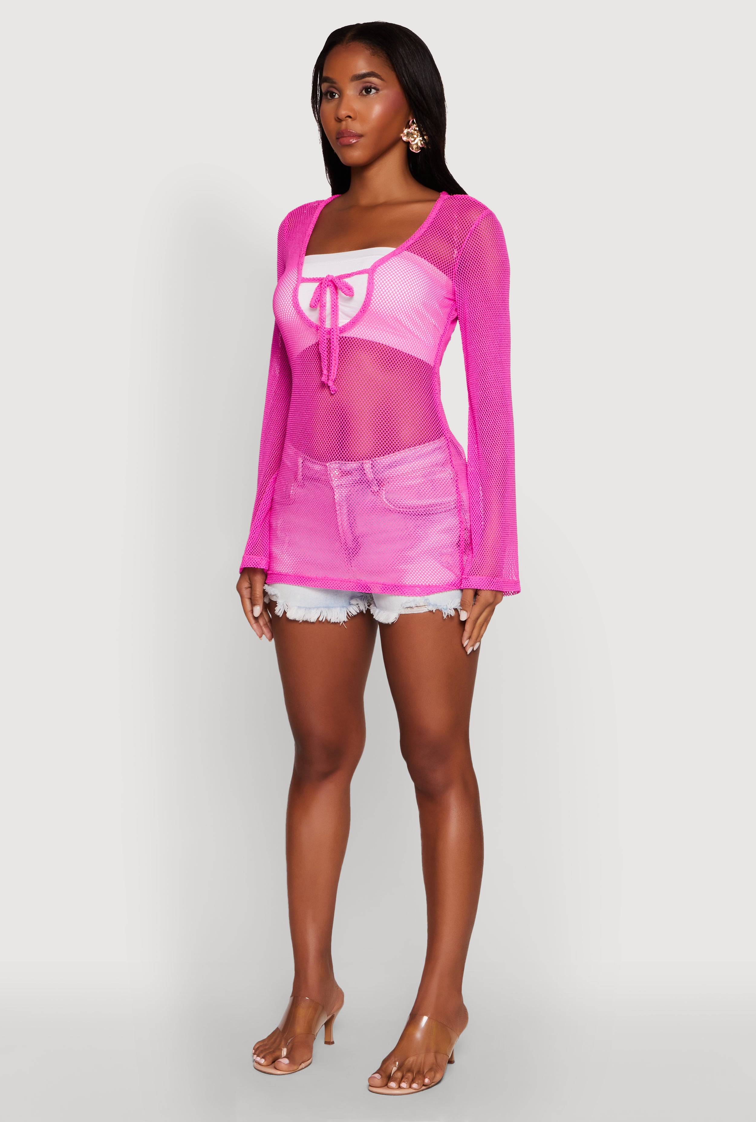 • Fishnet Tie Front Keyhole Long Sleeve Top
