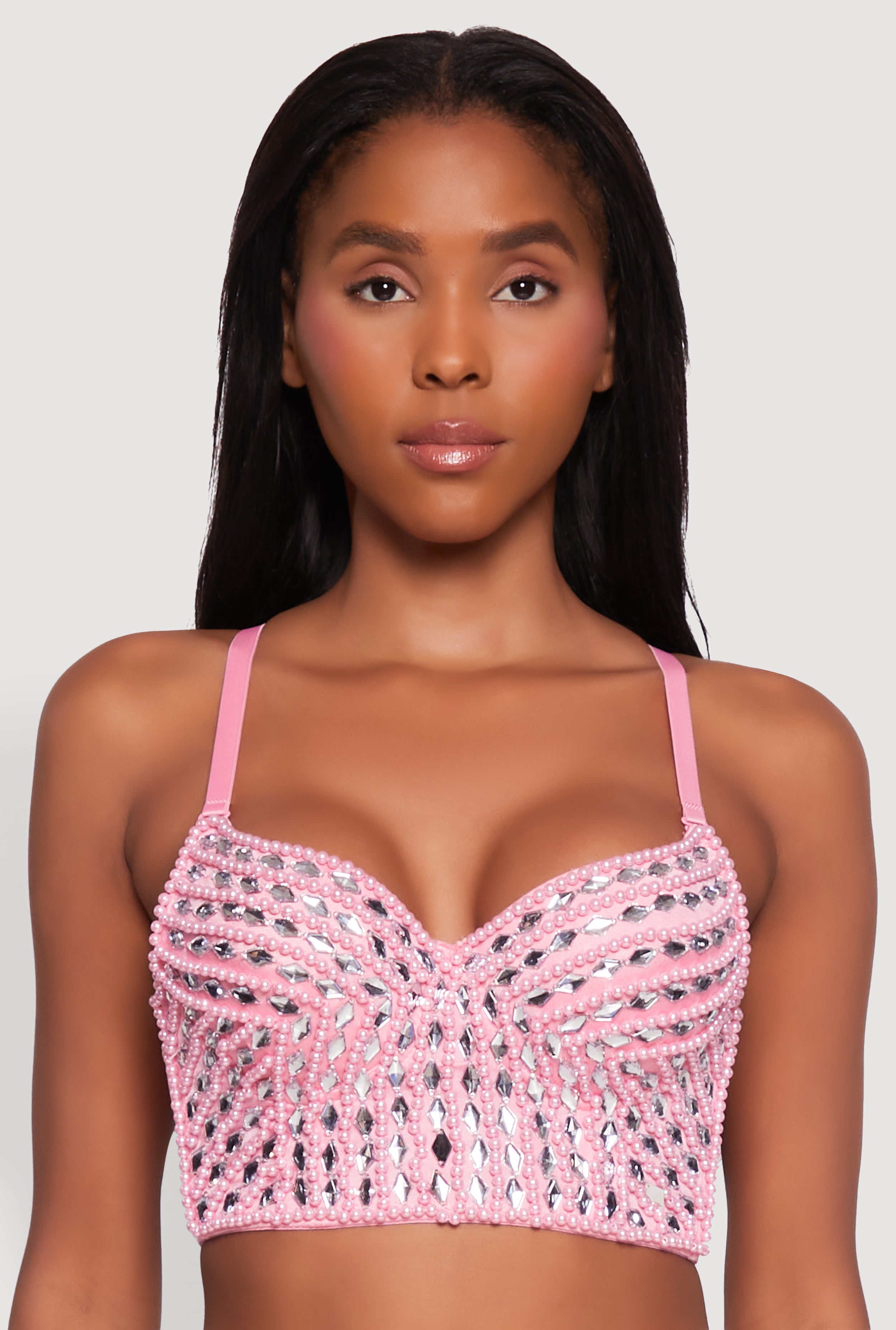 Turn heads and sparkle all night long in the Gemstone Faux Pearl Beaded Bustier Top. This curve-hugging crop is designed to elevate your party and festival looks with its dazzling rhinestone and faux pearl embellishments. The sweetheart neckline and boning create a flattering silhouette while the convertible, padded underwire bra ensures you stay comfy and supported. Whether you wear it with straps or go strapless, this top is your new go-to for effortless glam.