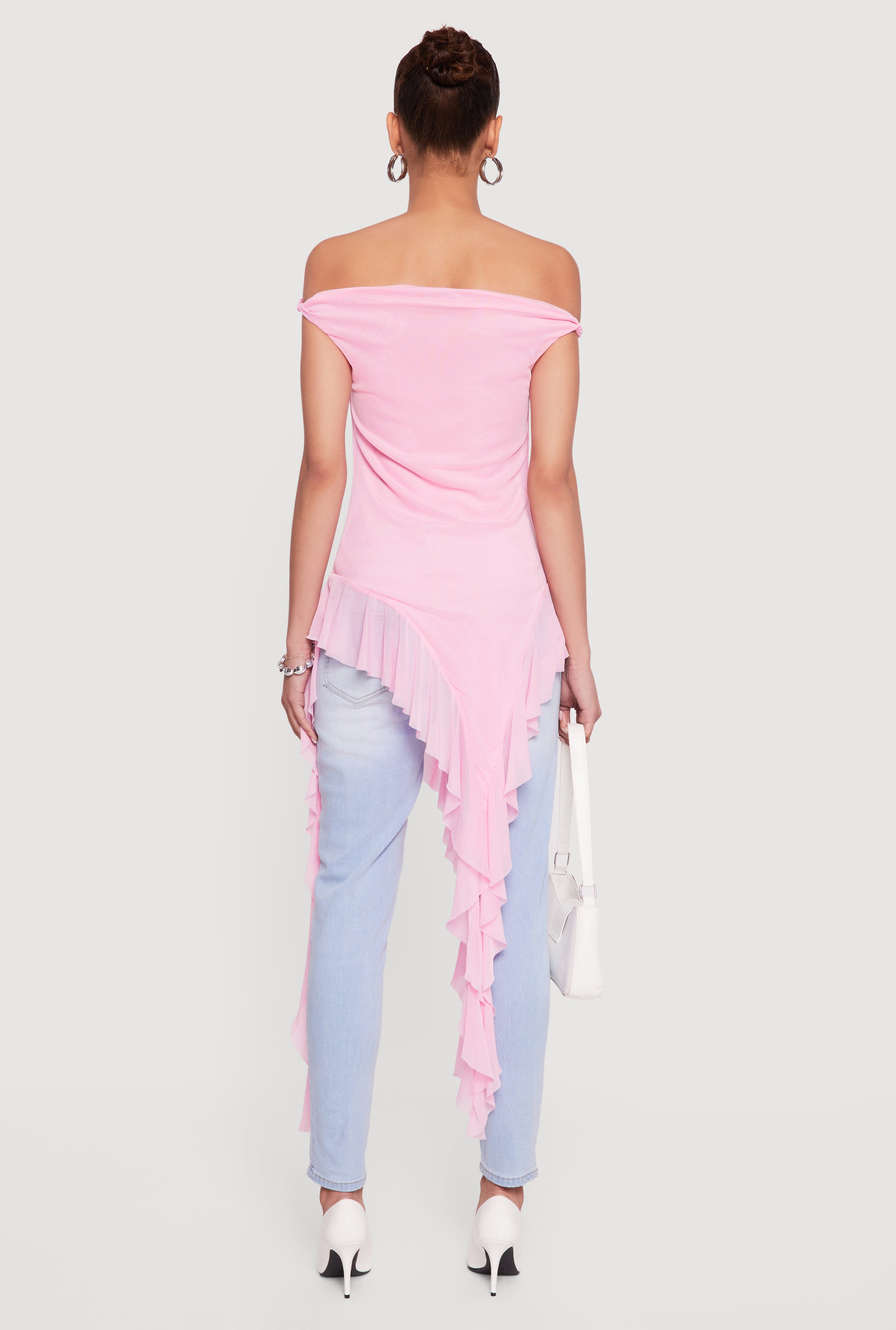 Step up your style game with this Off Shoulder Twist Sleeve Ruffle Mesh Blouse designed to turn heads wherever you go. Featuring a flirty off-the-shoulder neckline and delicate ruffle details, this blouse combines playful charm with a classic fit that flatters every body type. The twist sleeves add a unique touch, while the breathable mesh fabric keeps you cool and comfortable whether you're out for a casual day or hitting the party scene.