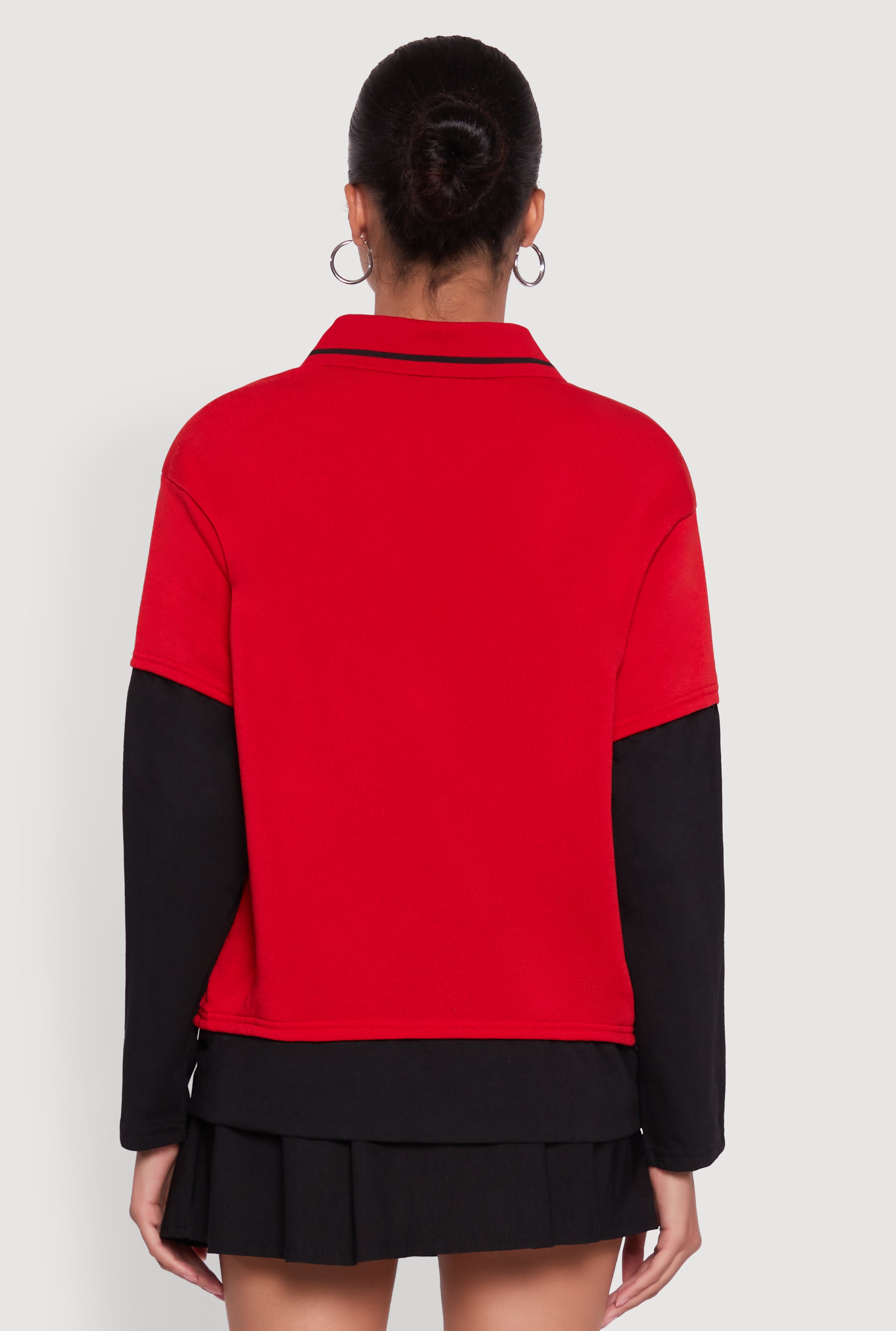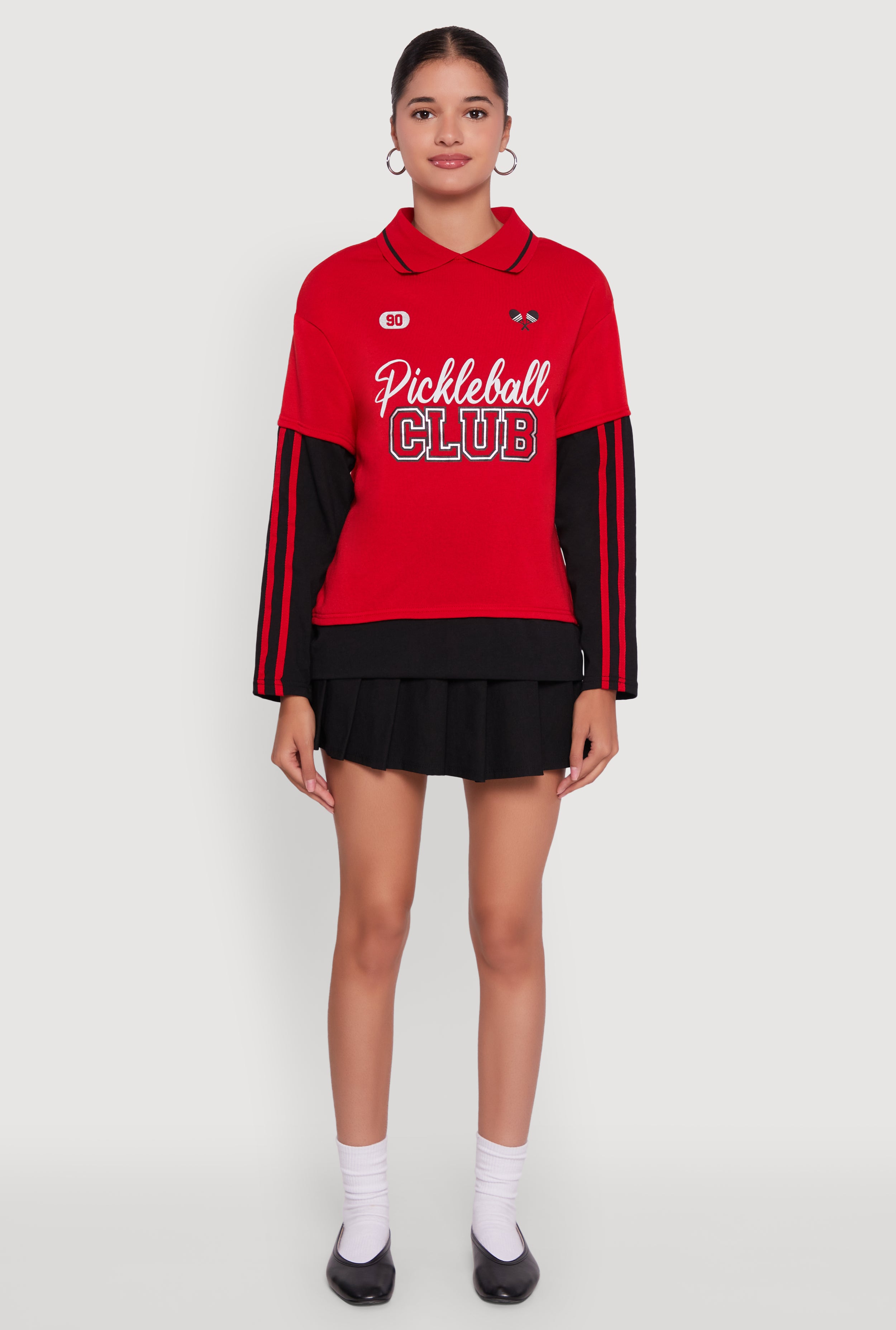 Step up your casual game with this Varsity Stripe Foil Screen Graphic Layered Look Sweatshirt. Designed with a classic fit and a polo collar, it combines sporty vibes with a touch of shine thanks to the foil screen details. The layered look adds effortless style, while the fleece material keeps you cozy during cooler days. Perfect for athleisure lovers who want comfort without sacrificing trendy flair.
