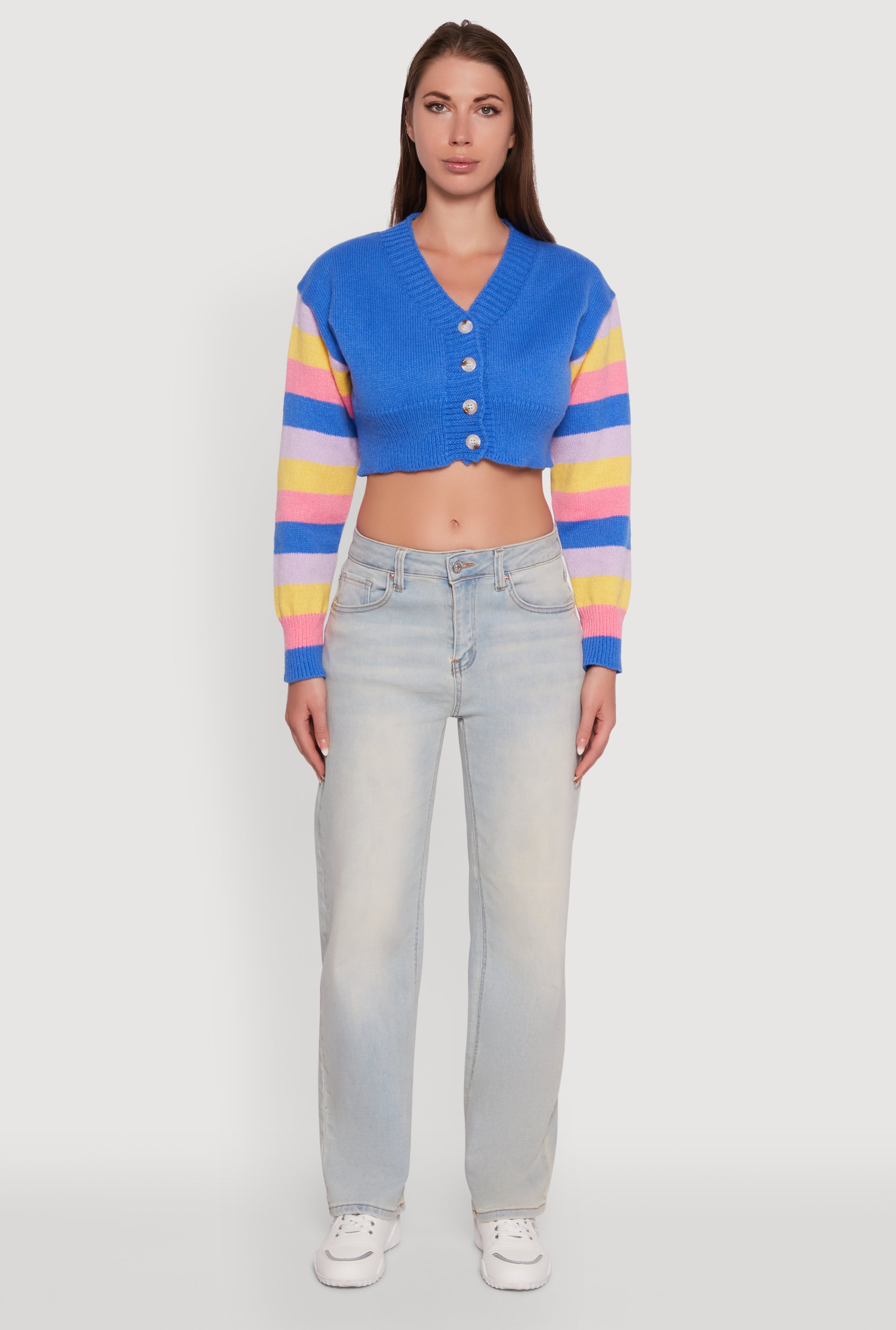 Step up your casual game with the Daisy Color Blocked Striped Sleeve Cropped Cardigan. This classic fit cardigan features a flattering V-neck and a fun button front that makes layering effortless. The eye-catching color blocked and striped sleeves bring a playful vibe perfect for back-to-school days or chill weekends. Made from cozy brushed knit, it’s the ultimate go-to piece to keep you comfy and stylish without breaking the bank.