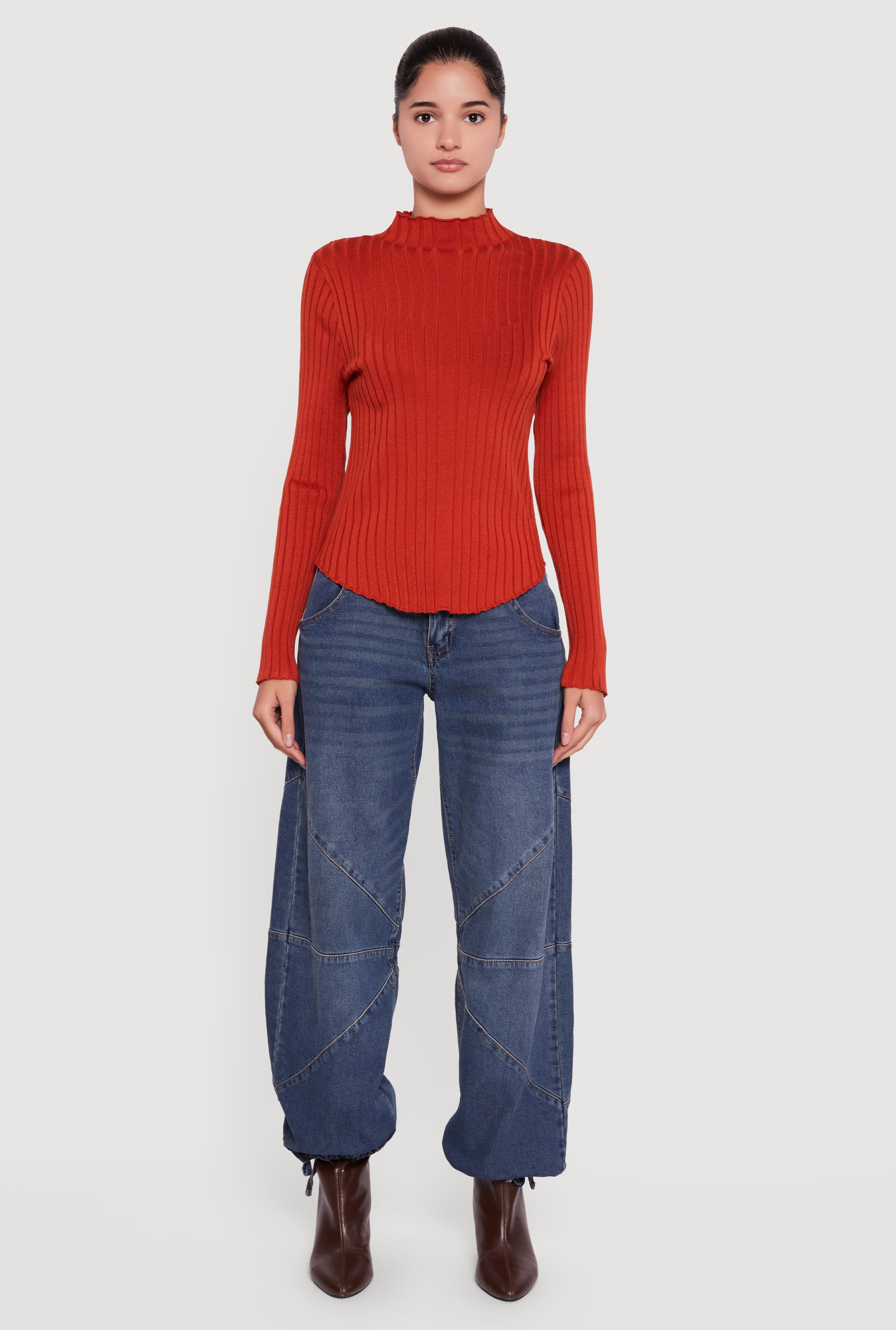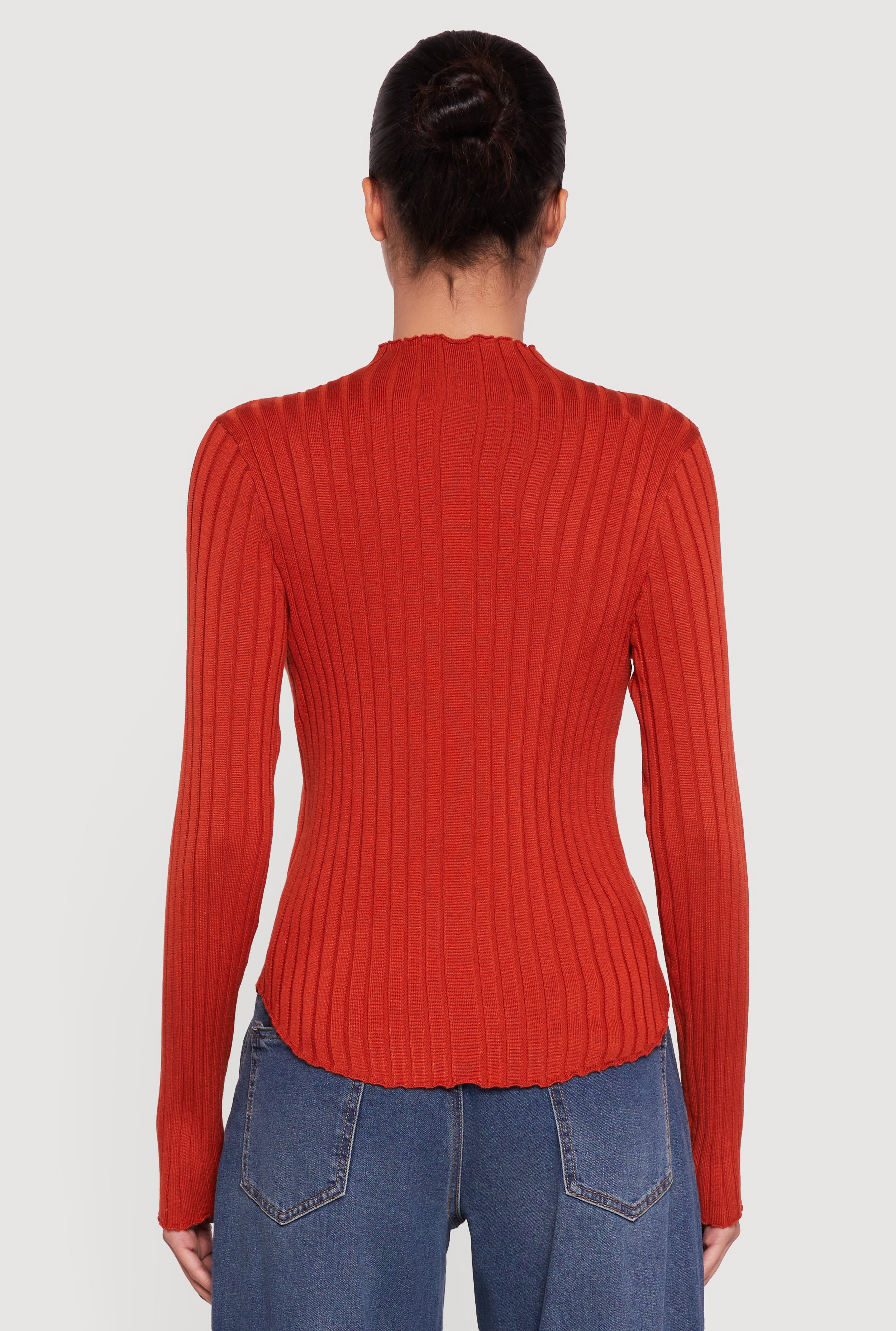 Stay cozy and effortlessly chic in this Rib Knit Long Sleeve Mock Neck Sweater. Designed with a classic fit and a flattering rounded hem, it’s your go-to for casual days when you want to look put together without trying too hard. The soft ribbed knit fabric hugs your silhouette while the mock neck adds a touch of sophistication that’s perfect for layering or wearing solo.