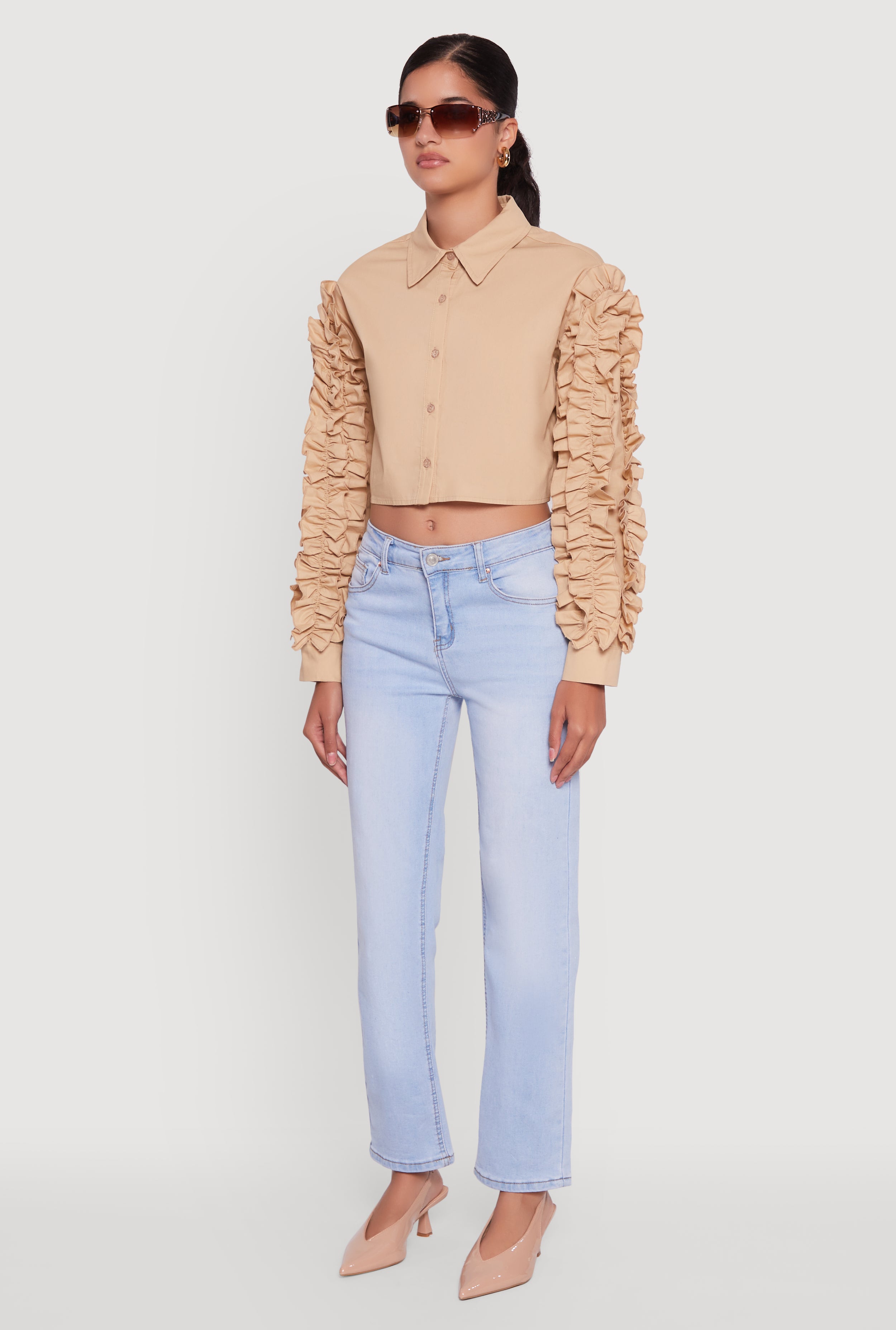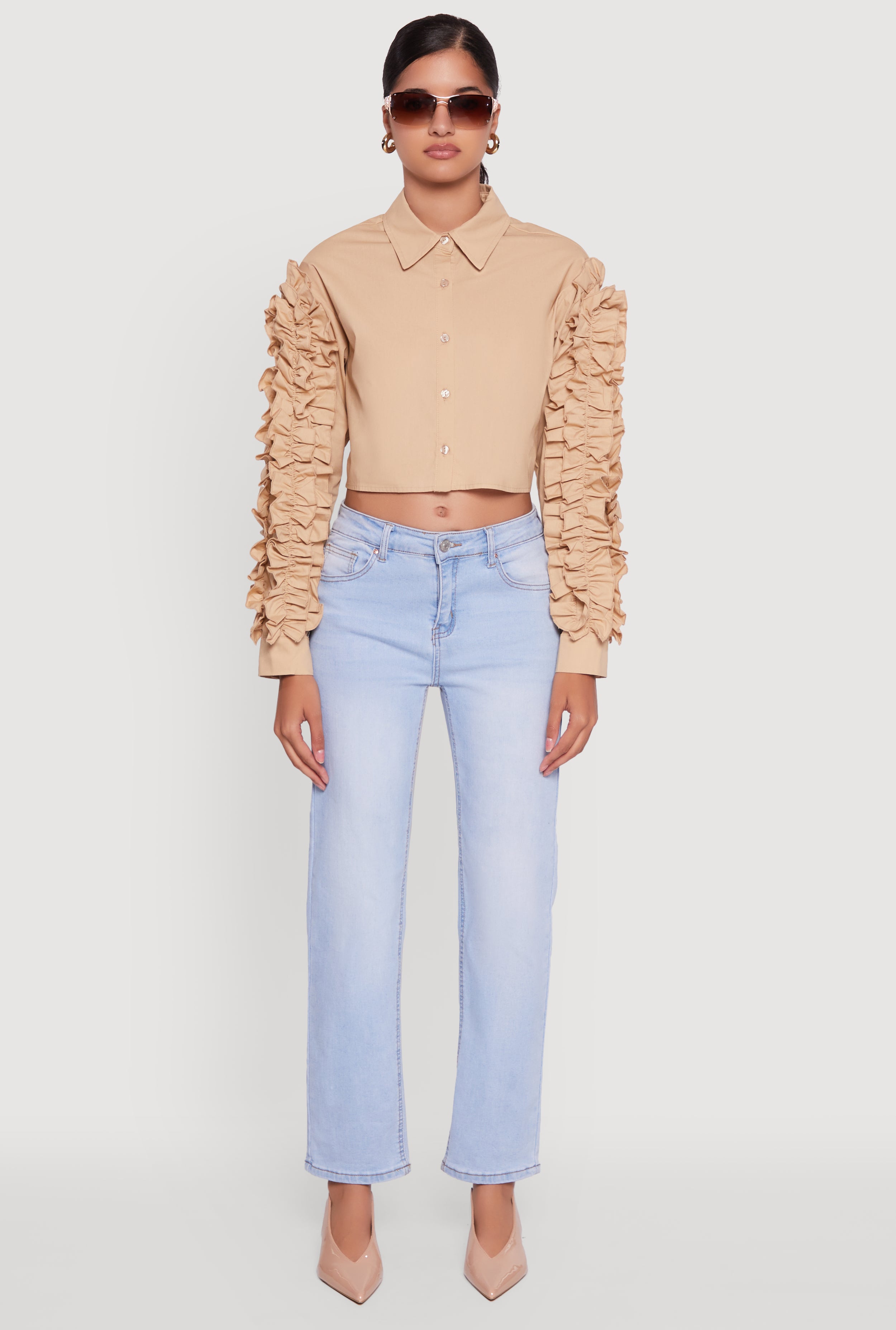 • Ruffle Trim Sleeve Cropped Button Front Shirt