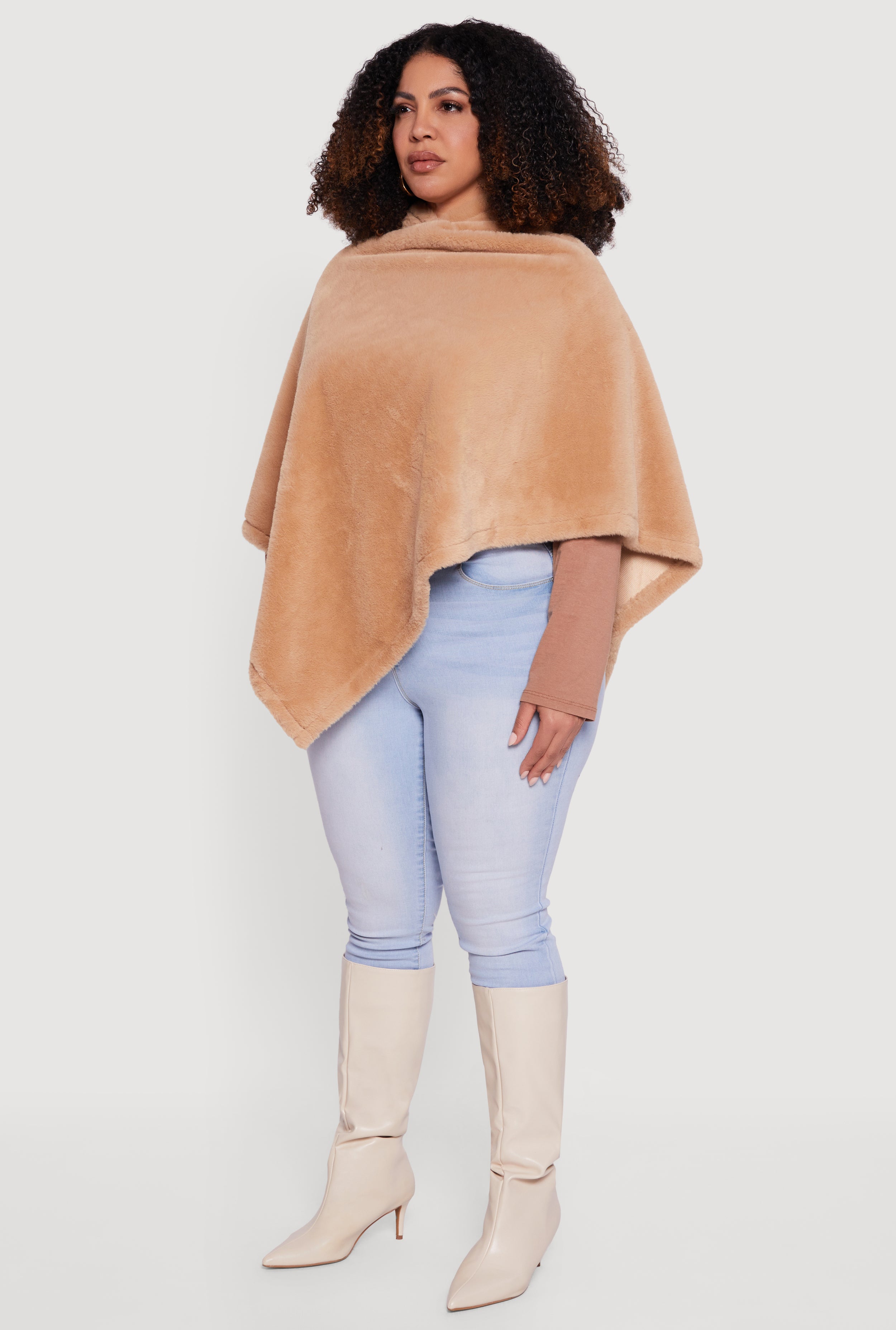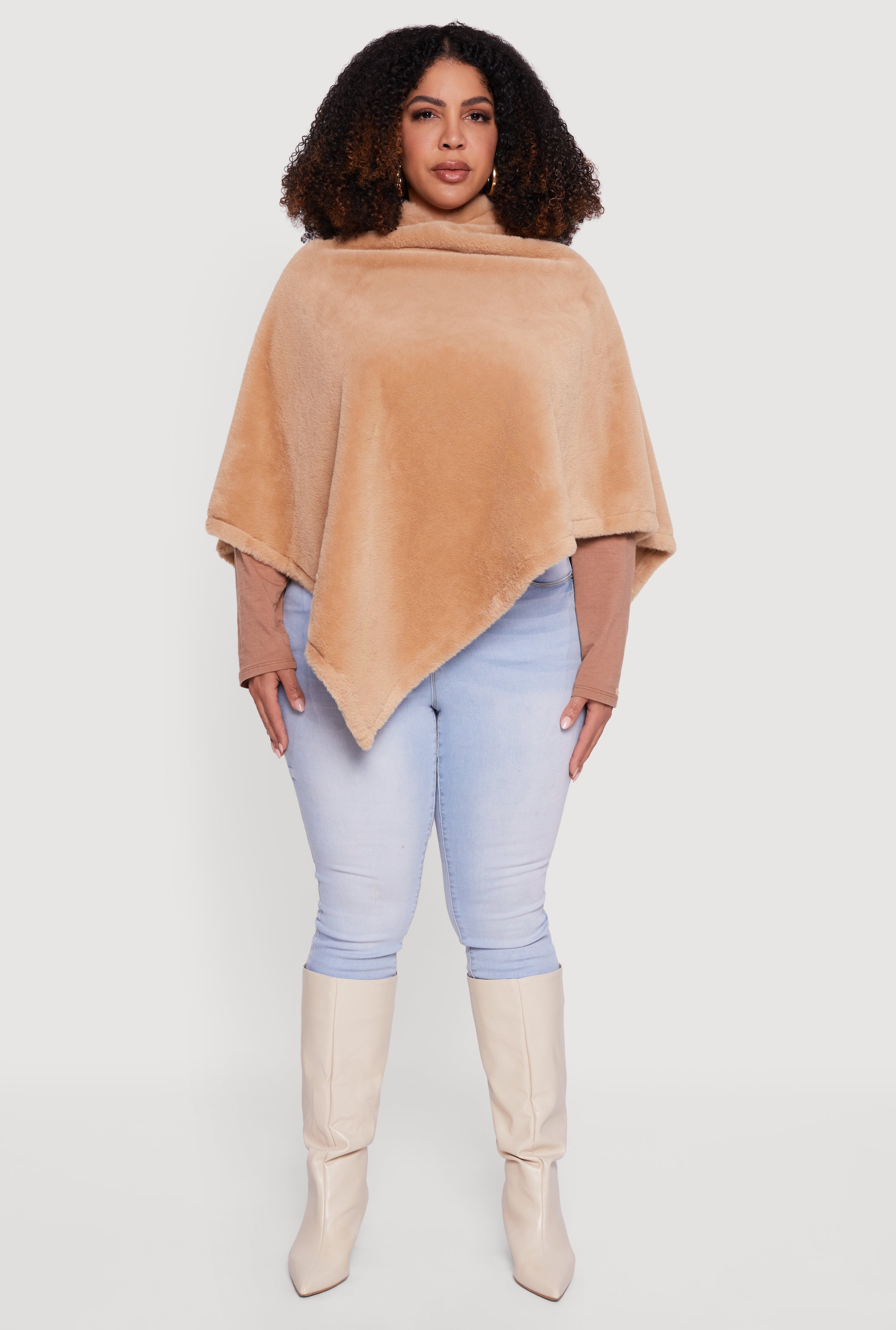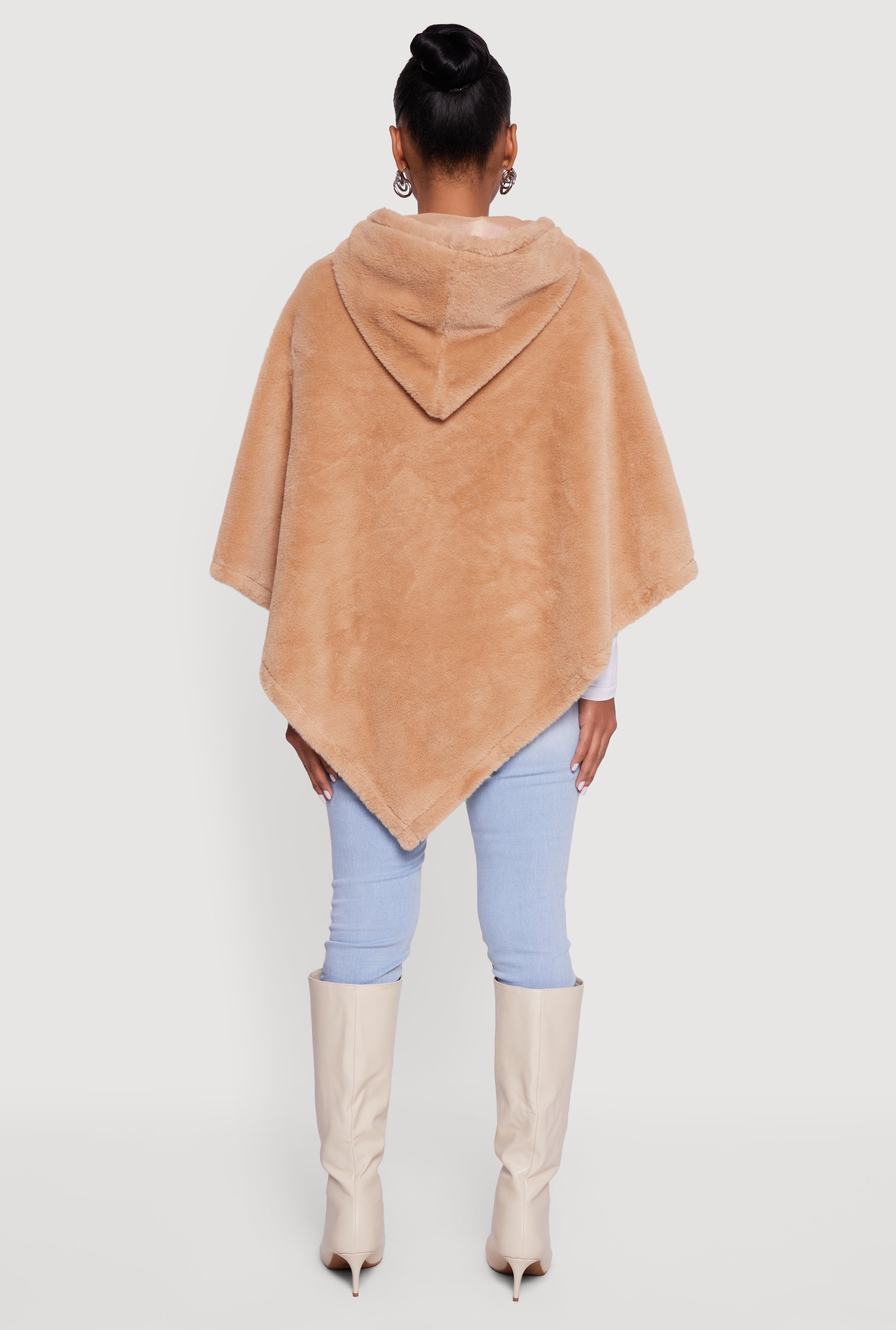 Cozy meets cool in this Solid Faux Fur Hooded Poncho designed to keep you stylishly snug all season long. Its relaxed fit and short sleeves make it perfect for layering over your favorite outfits, while the plush faux fur adds a touch of luxe without breaking the bank. Whether you're heading out for a casual day or dressing up for a night out, this poncho is your go-to for effortless warmth and fashion-forward vibes.