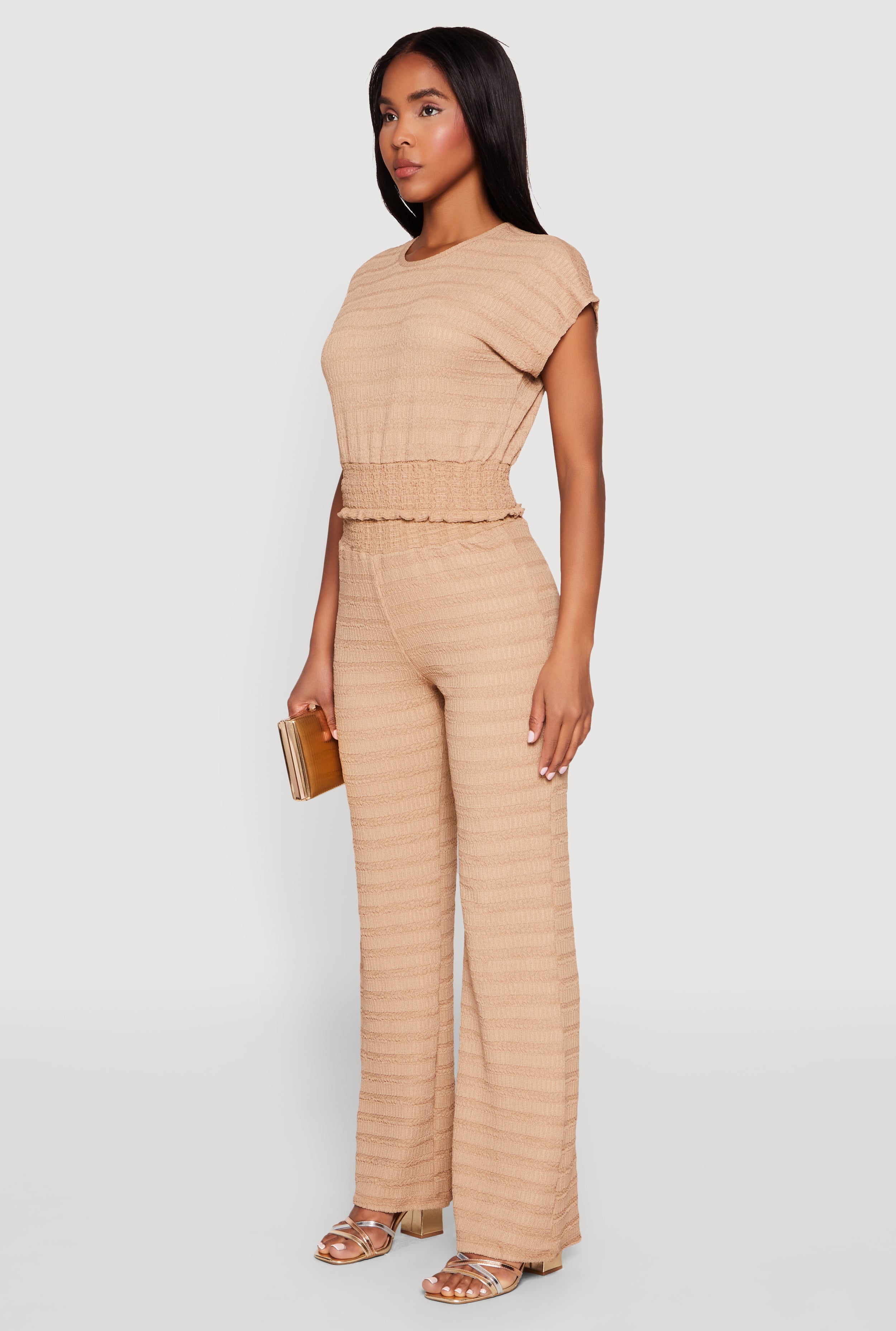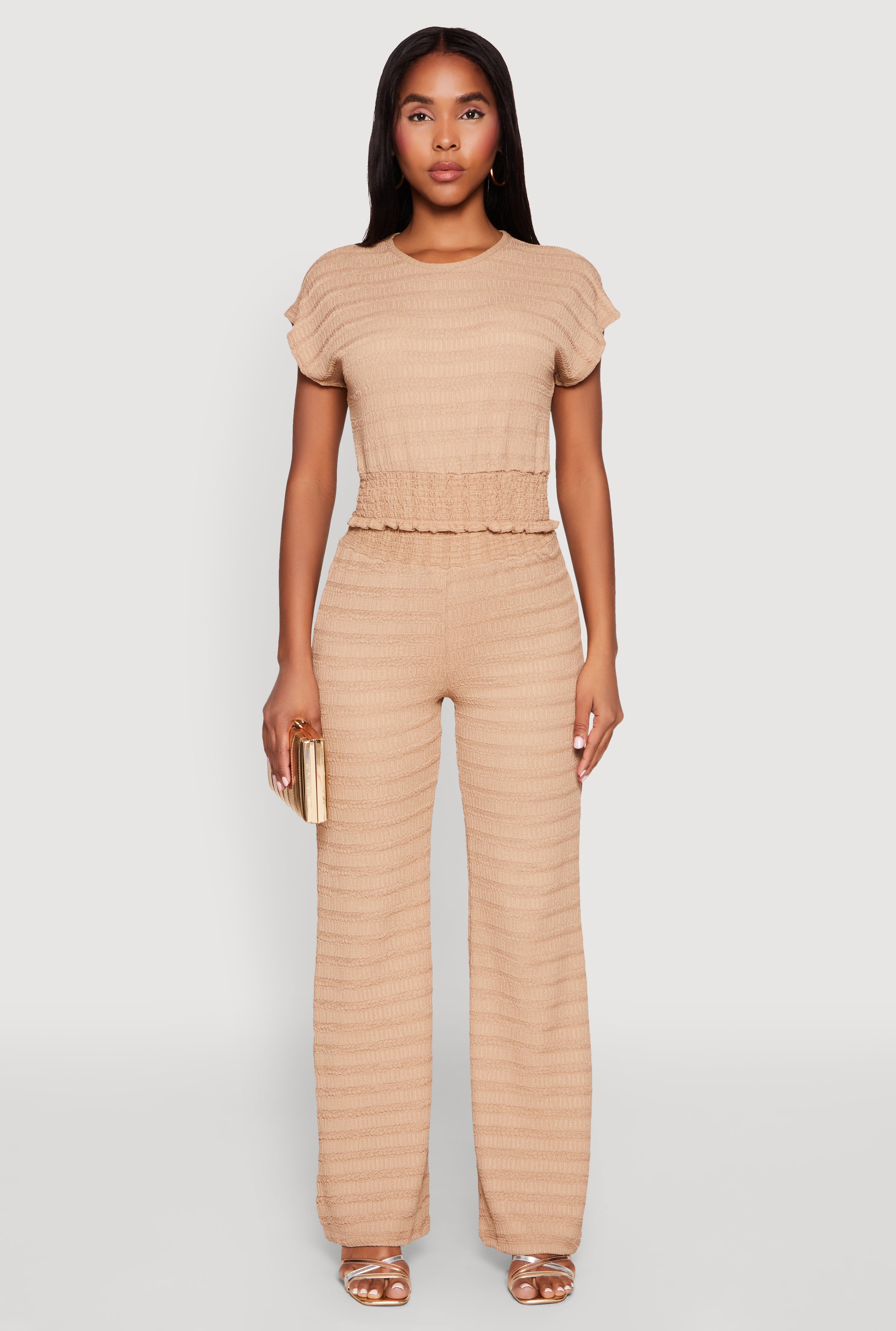 Upgrade your wardrobe with the Textured Knit Smocked Waist Top, a perfect blend of comfort and style that keeps you looking effortlessly chic. Featuring a classic fit and timeless silhouette, this blouse is designed to flatter every body type. The cropped hem and lettuce edge details add a trendy touch, while the cap and dolman sleeves offer a relaxed vibe. Whether you're dressing up for a casual day out or layering for a night with friends, this top is your new go-to for versatile, everyday fashion.