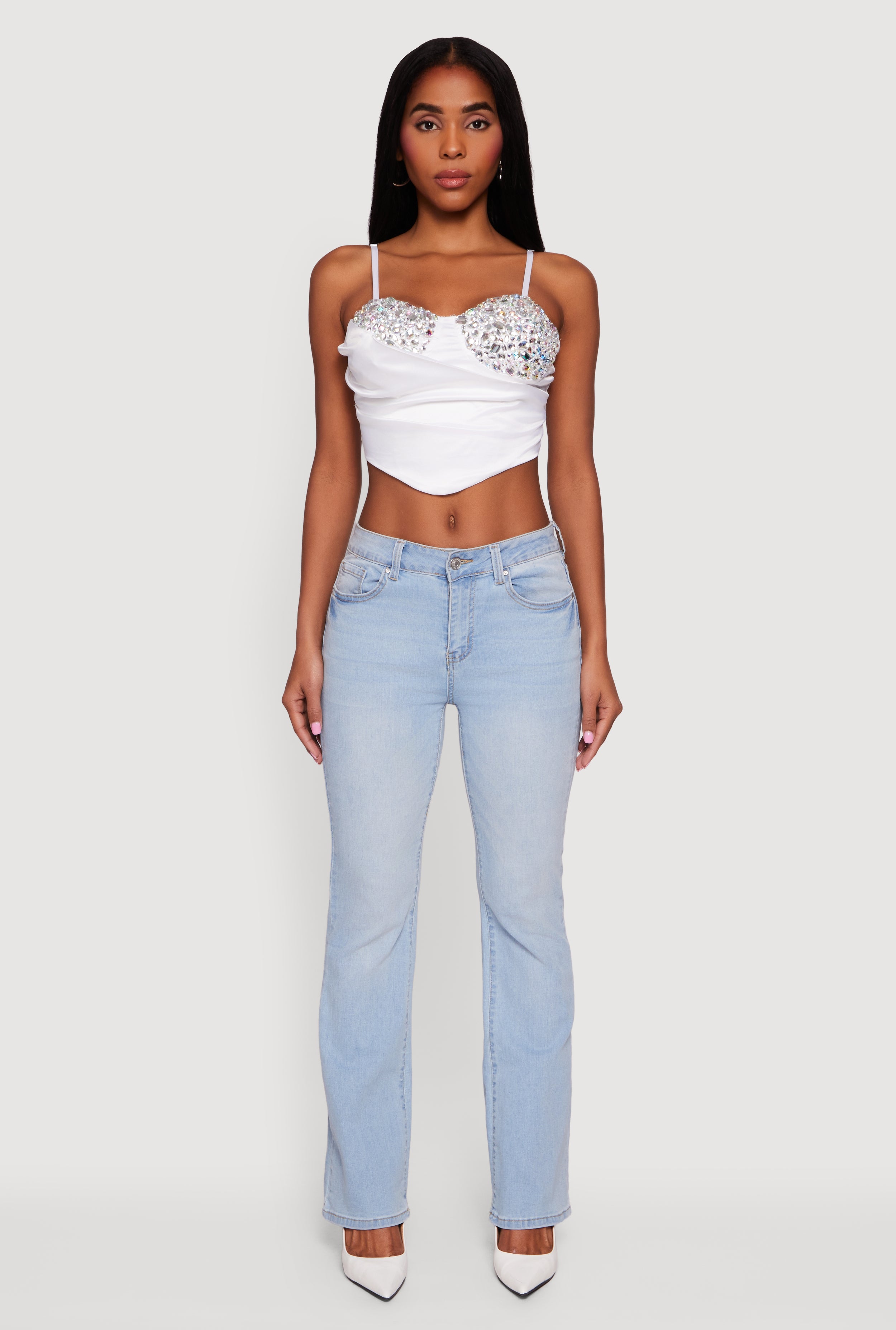 Turn heads and sparkle all night long with this Asymmetrical Rhinestone Cropped Bustier. Designed to hug your curves perfectly, it features a chic sweetheart neckline and a unique hanky hem for that extra edge. Whether you're hitting a festival, party, or night out, this strapless, open-back top with padded cups and a sleek zipper closure will keep you feeling confident and stylish.