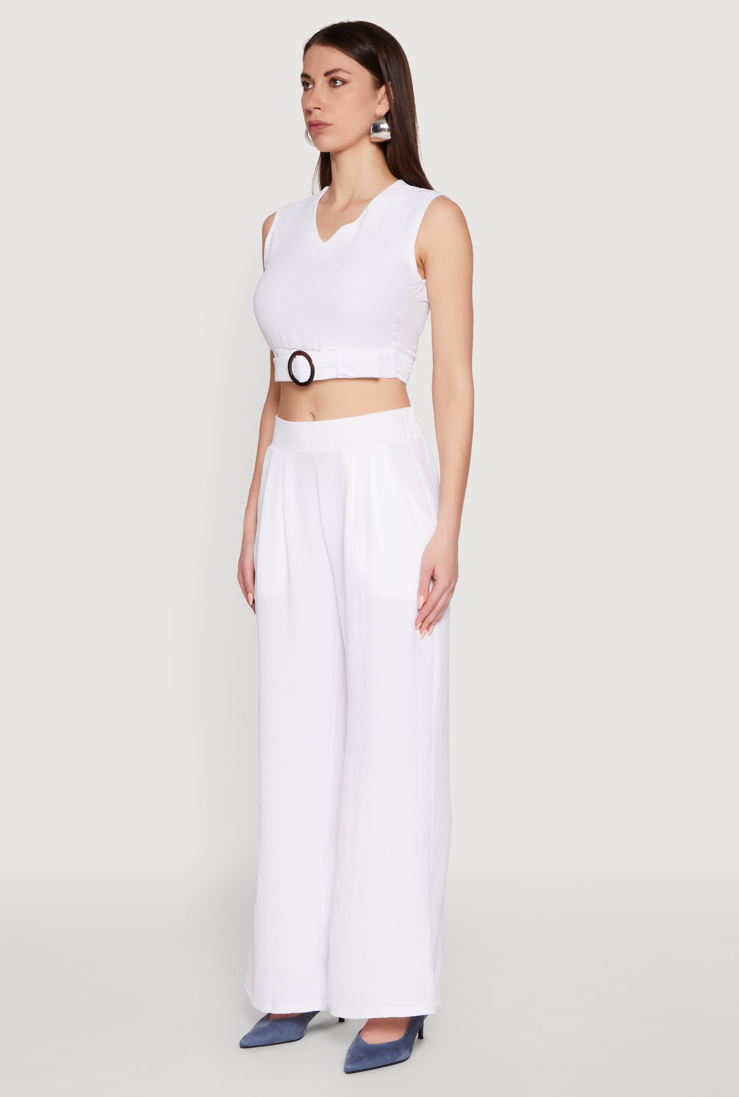 Chic Crepe Knit V Neck Sleeveless Crop Top with Belted Front
