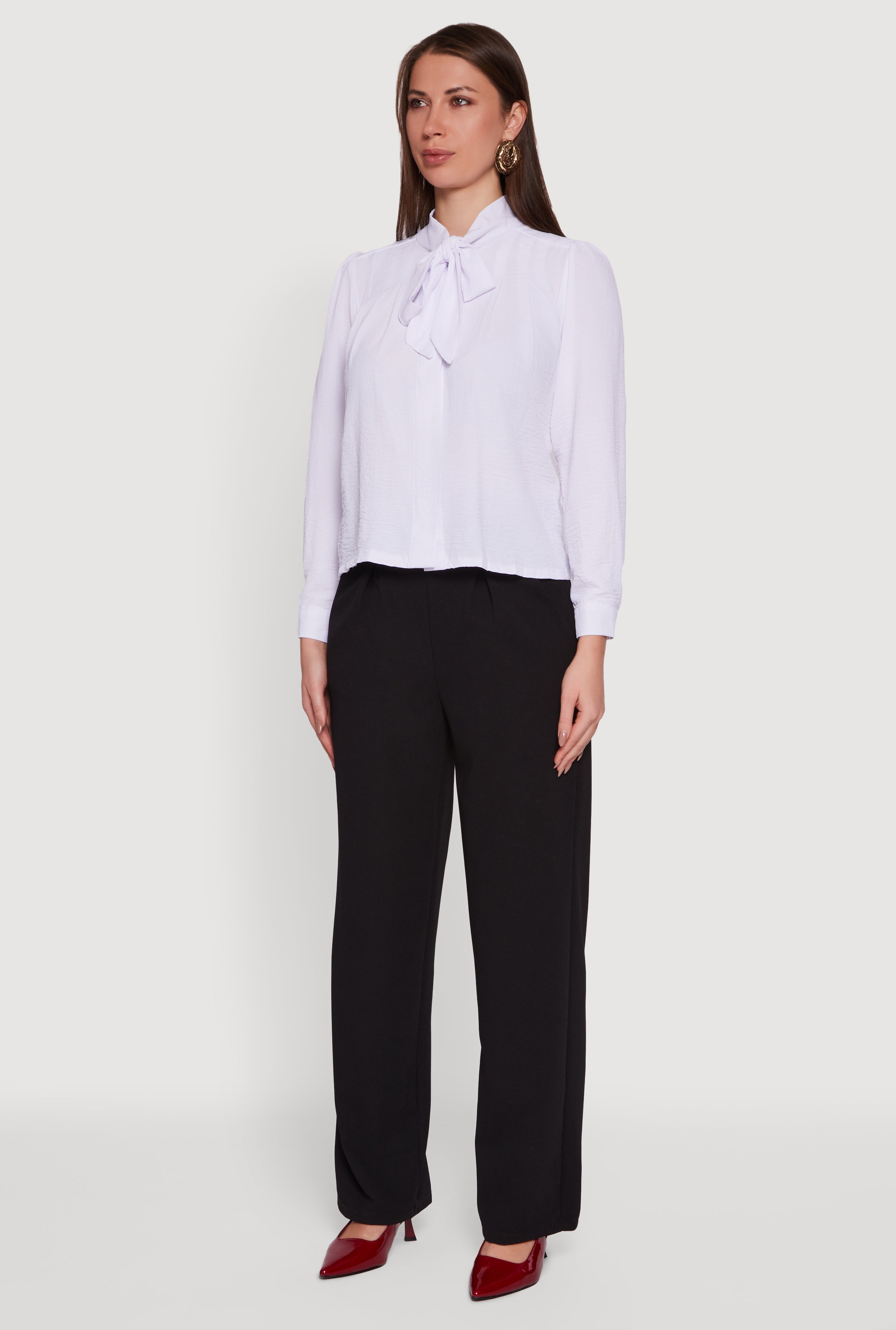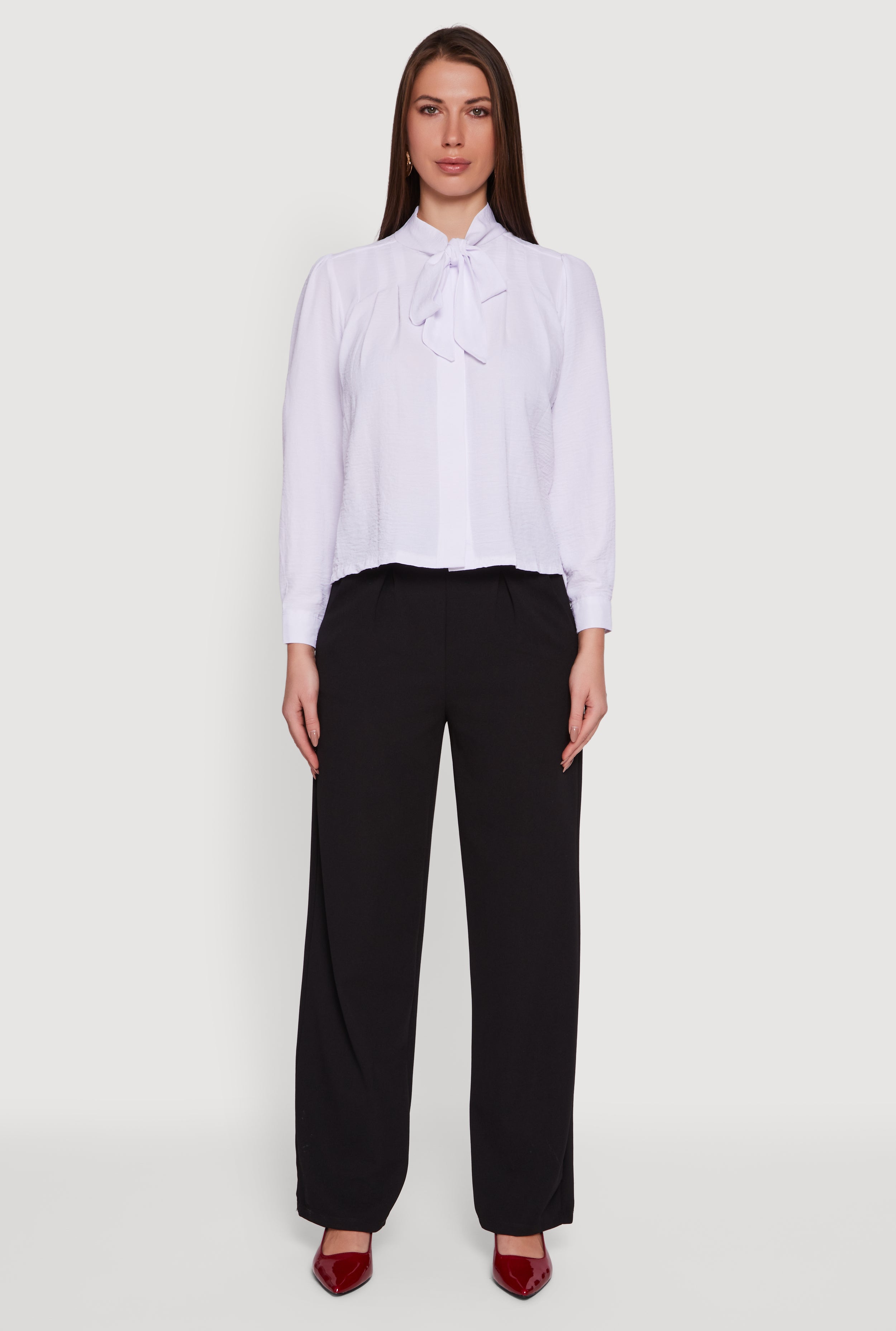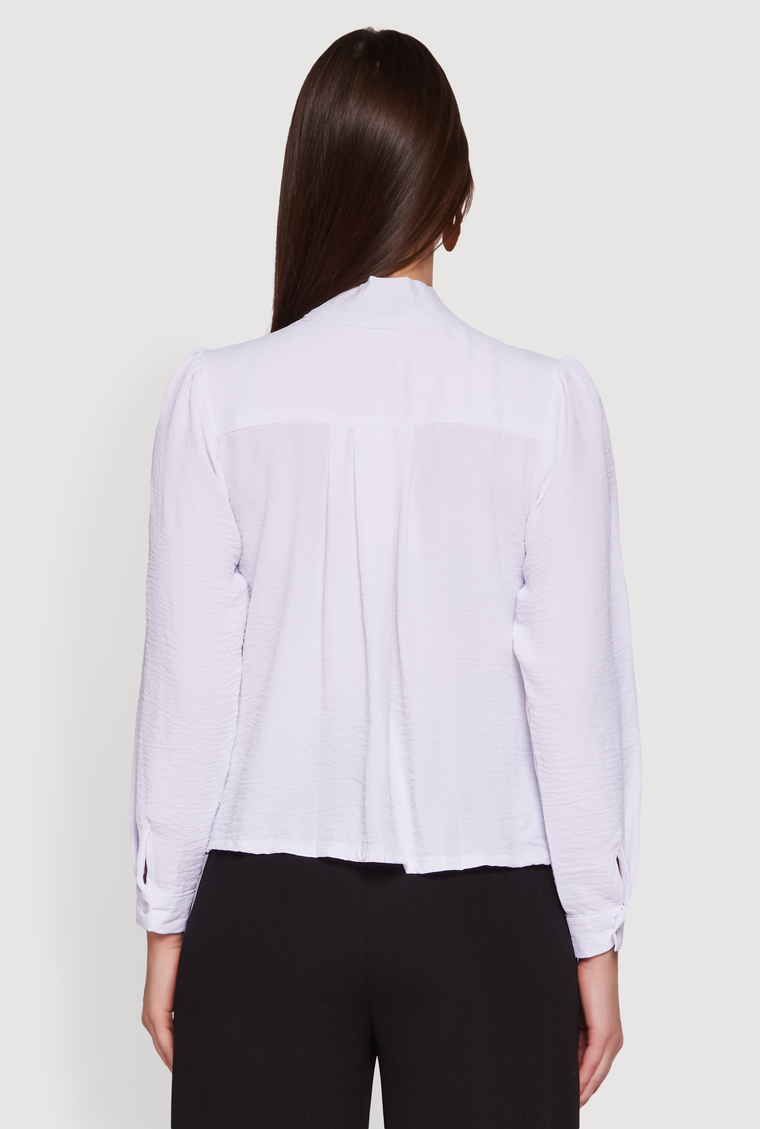 Step up your officewear game with this Crepe Knit Tie Neck Button Front Shirt. Designed with a classic fit and a timeless silhouette, it features a chic tie neck detail and button front closure that add a touch of sophistication to your everyday look. The long sleeves and shirt collar create a polished vibe perfect for meetings or casual days at work. Made from soft crepe knit fabric, this shirt offers comfort and style without breaking the bank.