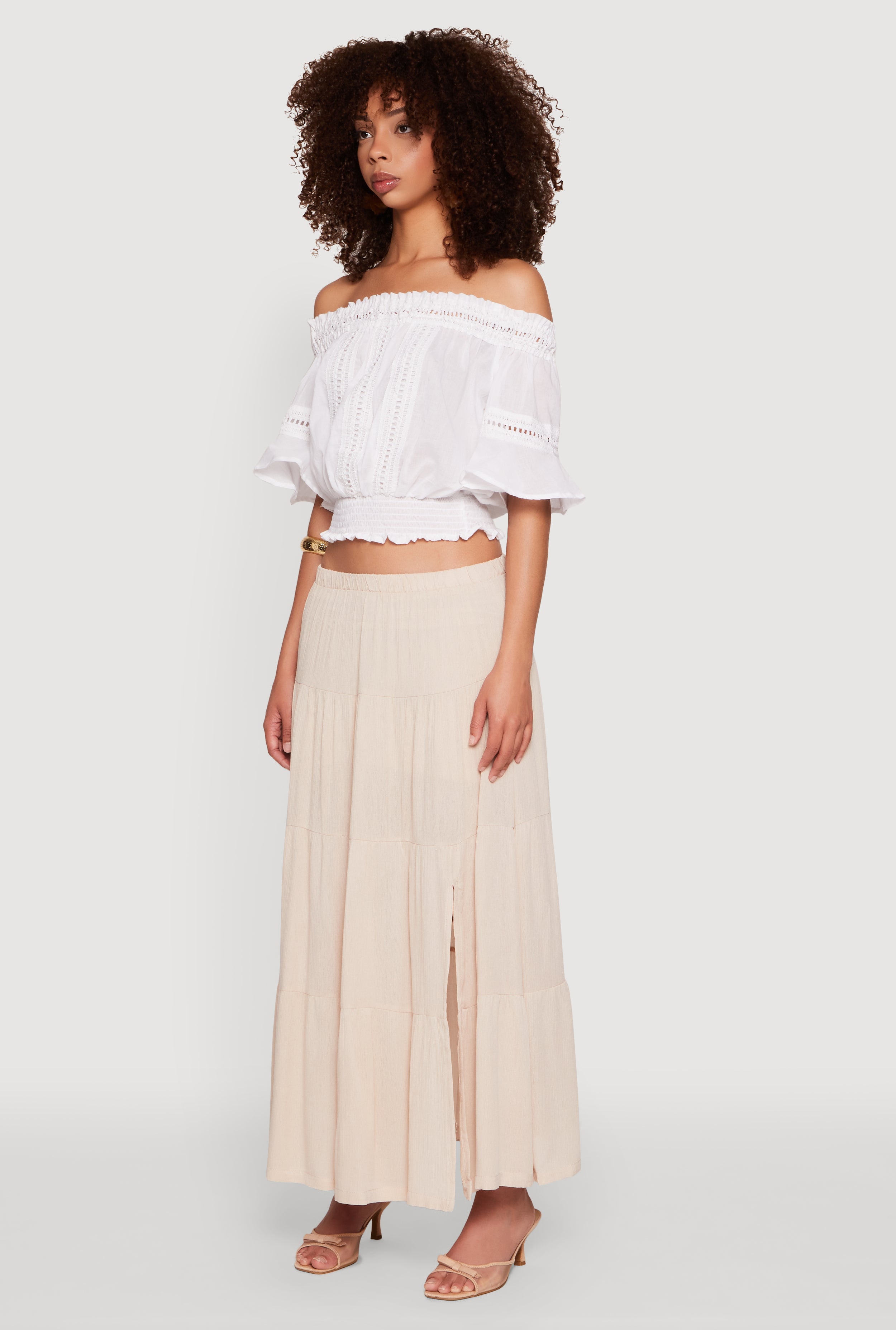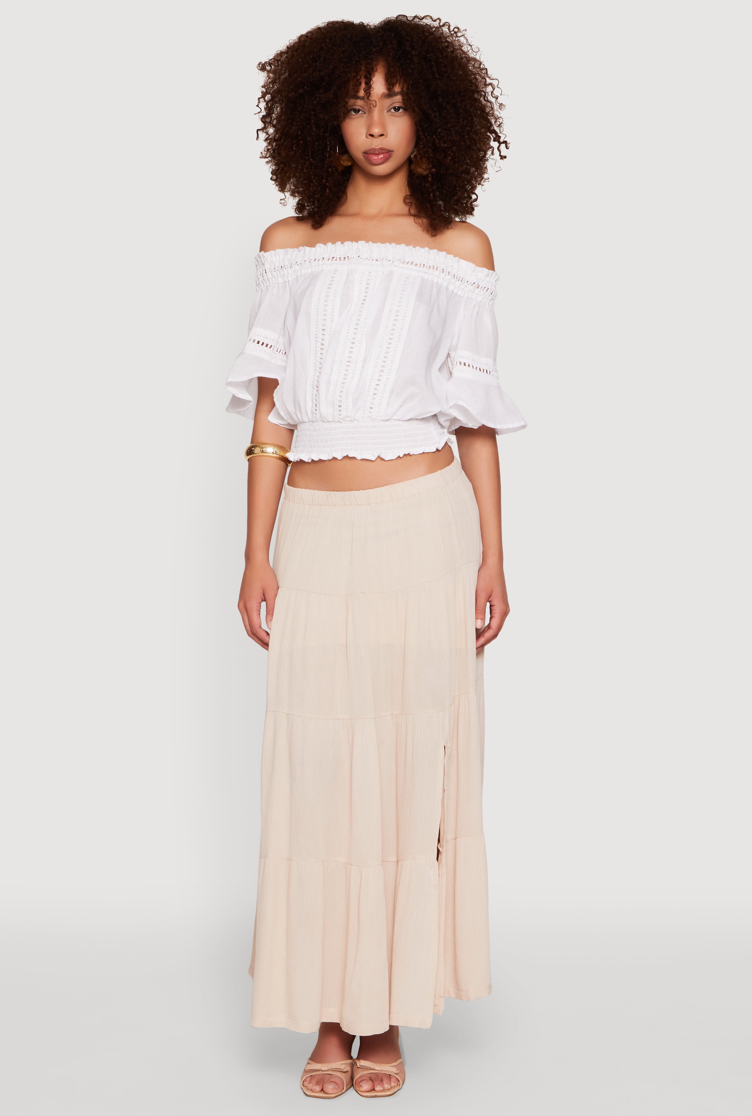 • Off the shoulder neckline adds a flirty, feminine touch