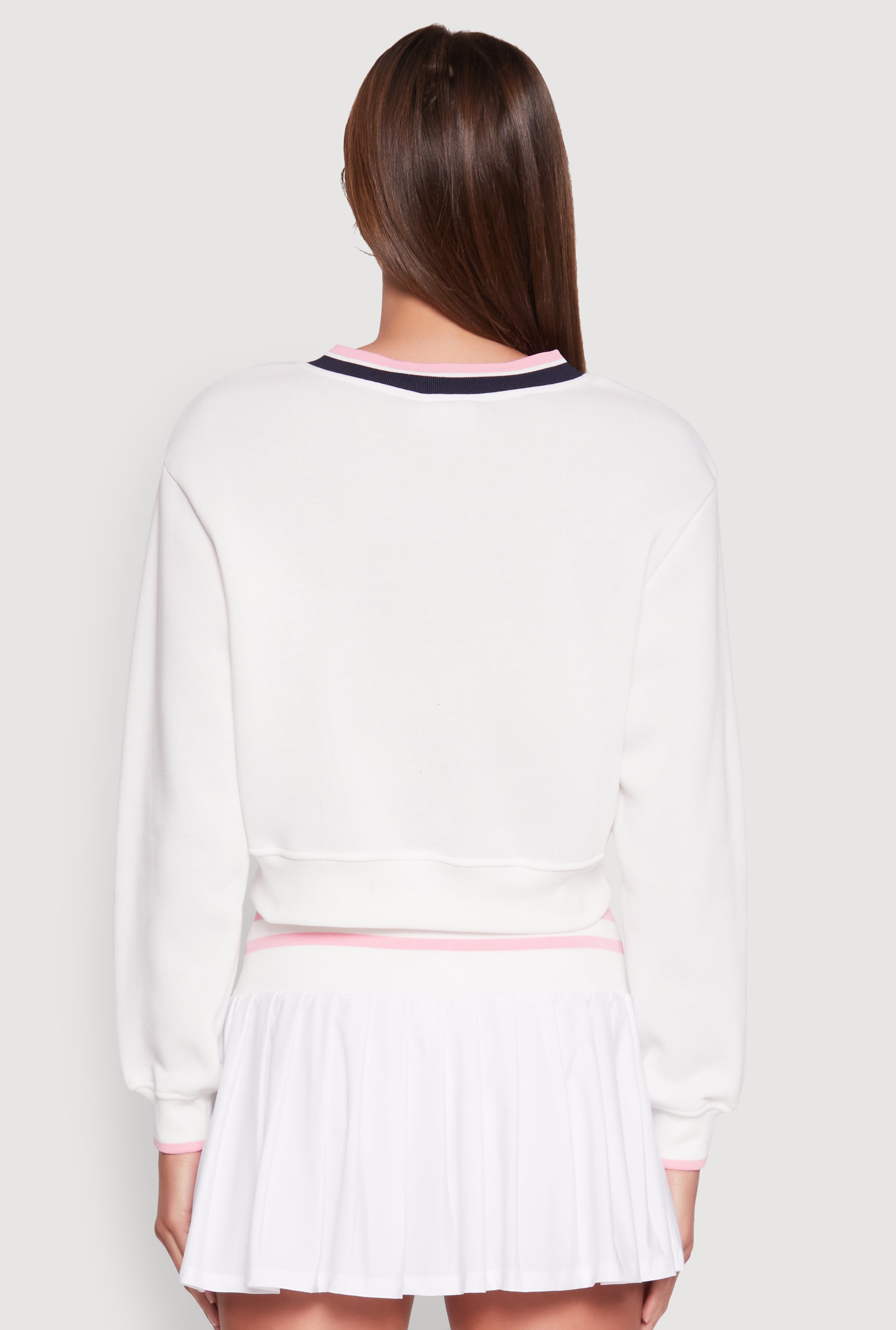 - Features a stylish V-neck design with embroidery and varsity stripe detail