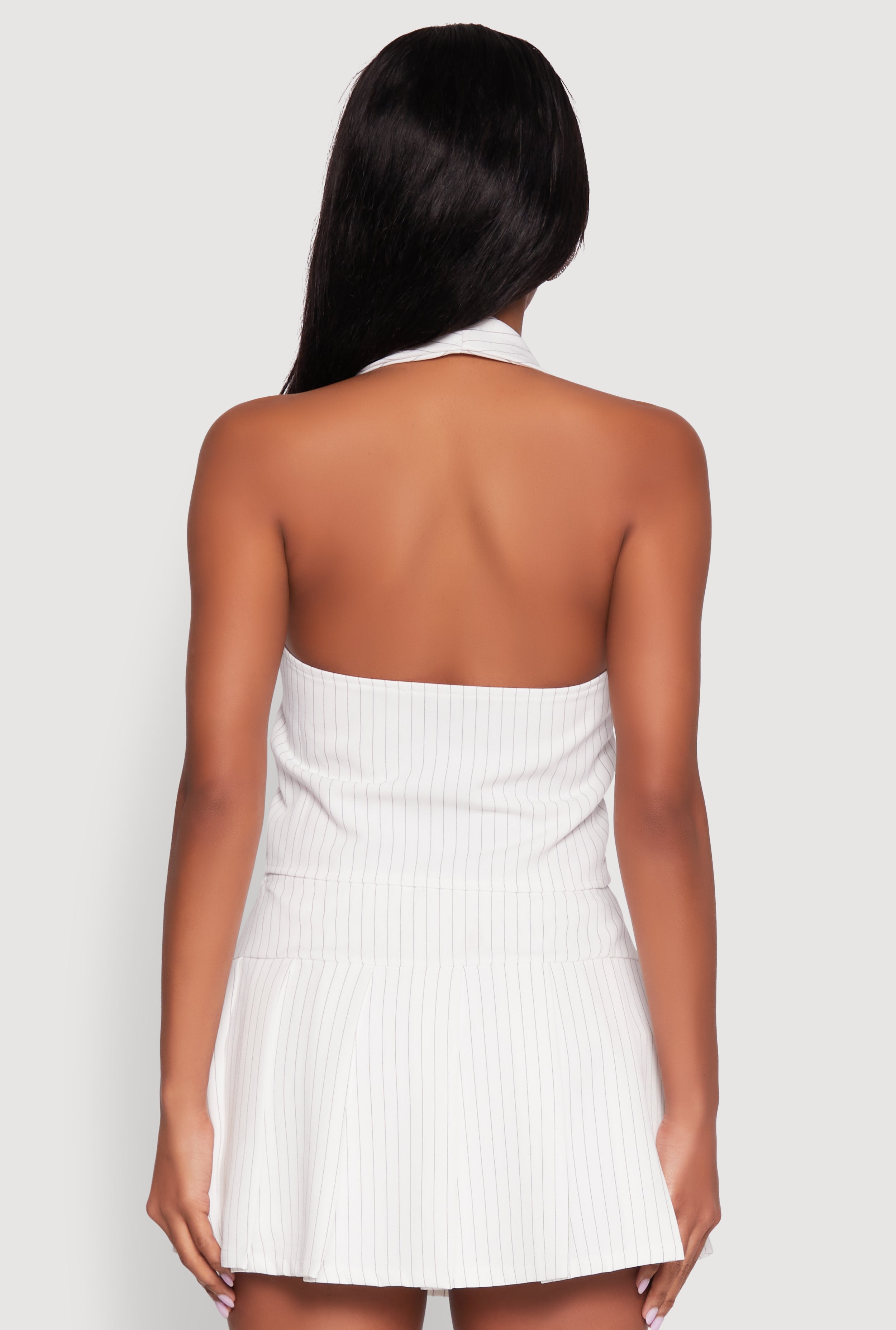 Step up your style game with the Iris Pinstripe Zip Front Collared Halter Top. This sleek sleeveless piece features a classic pinstripe pattern and a cropped hem that’s perfect for showing off your favorite high-waisted jeans or skirts. The zip front adds an edgy twist while the halter neckline and open back keep things flirty and fresh. Whether you’re heading out for a casual day or a night out, this top has got your back—and your front—in style.