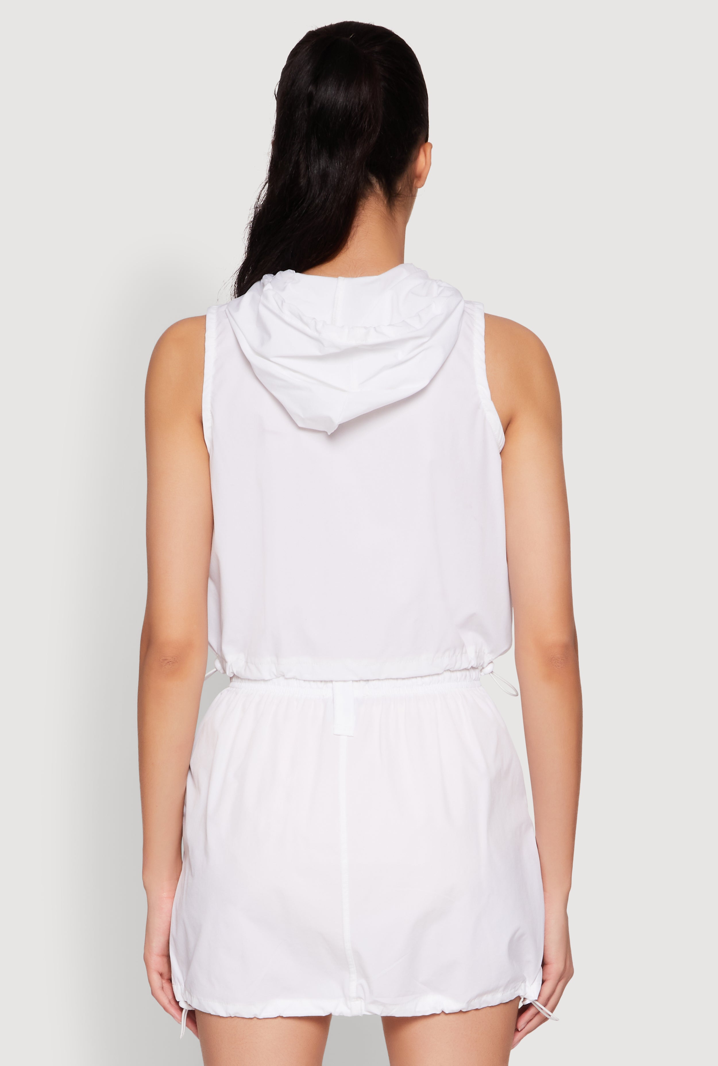 Upgrade your casual wardrobe with our Nylon Utility Zip Front Hooded Top. Perfect for those on-the-go days, this sleeveless piece combines style and function effortlessly. Featuring a sleek zip front, a cozy hoodie, and a toggle drawstring for a customizable fit, it’s your new go-to for laid-back looks. The cropped hem adds a trendy touch, making it easy to pair with your favorite high-waisted jeans or shorts. Whether you're running errands or hanging out with friends, this top keeps you looking cool and feeling comfortable all day long.