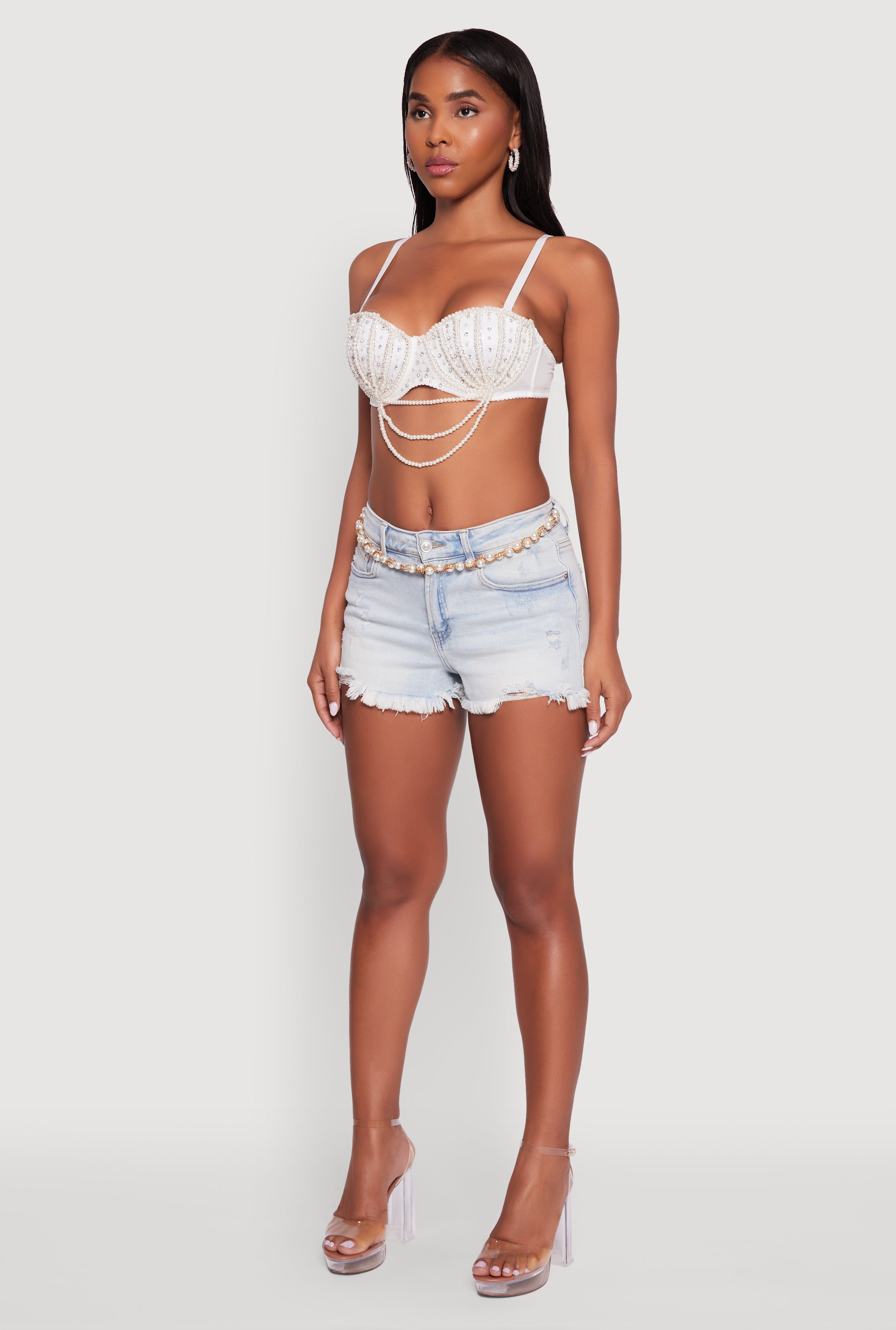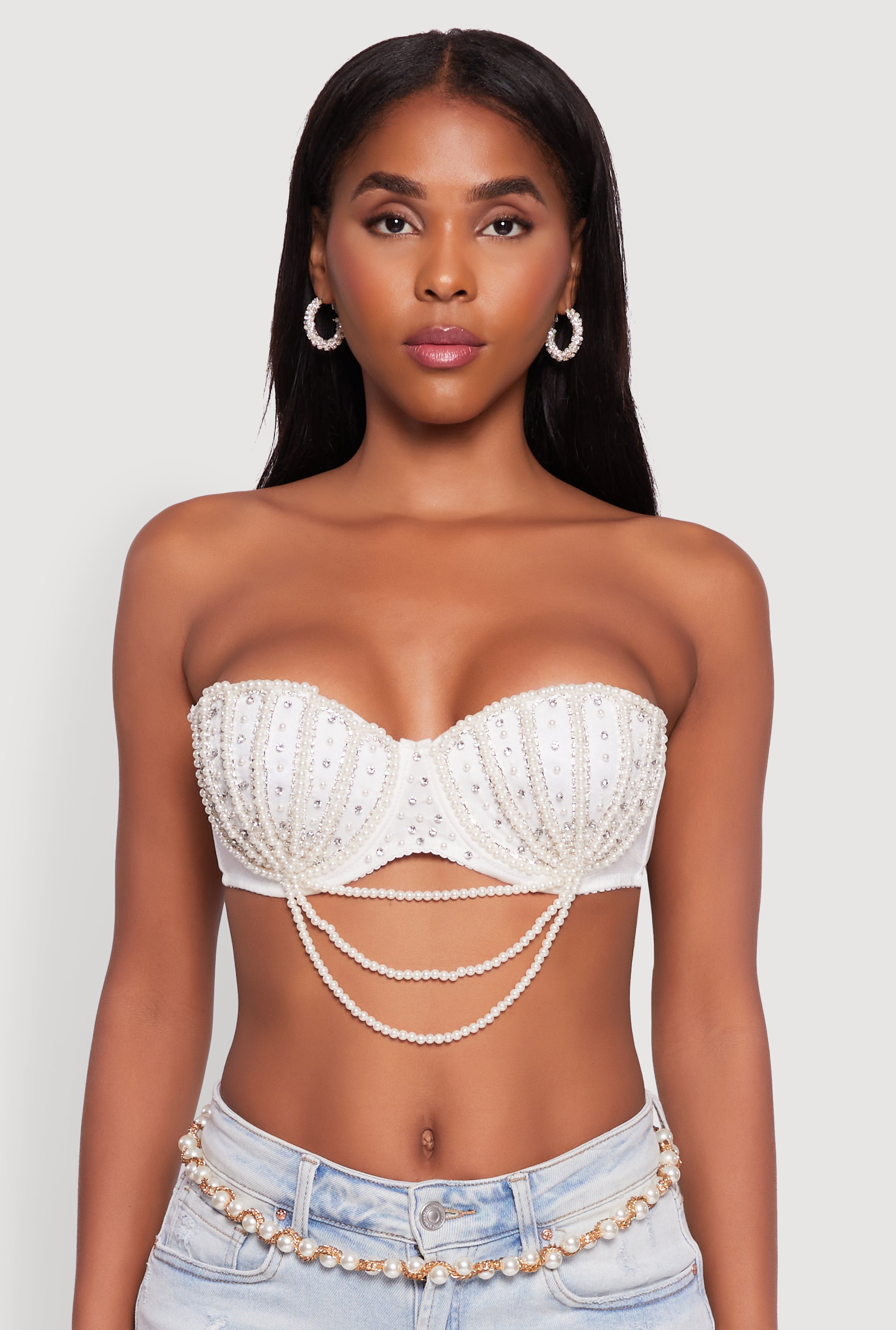Turn heads and sparkle all night long with the Rhinestone Layered Faux Pearl Convertible Bustier Top. This curve-hugging stunner features a sweetheart neckline and shimmering rhinestone details layered over faux pearls for that perfect mix of edgy and elegant. Whether you’re hitting a festival, party, or night out, this versatile top lets you switch it up with three different ways to wear it. Adjustable spaghetti straps and a convertible design mean you can go strapless or keep it classic. Get ready to shine and own your vibe with this must-have crop bustier that’s as bold as you are.