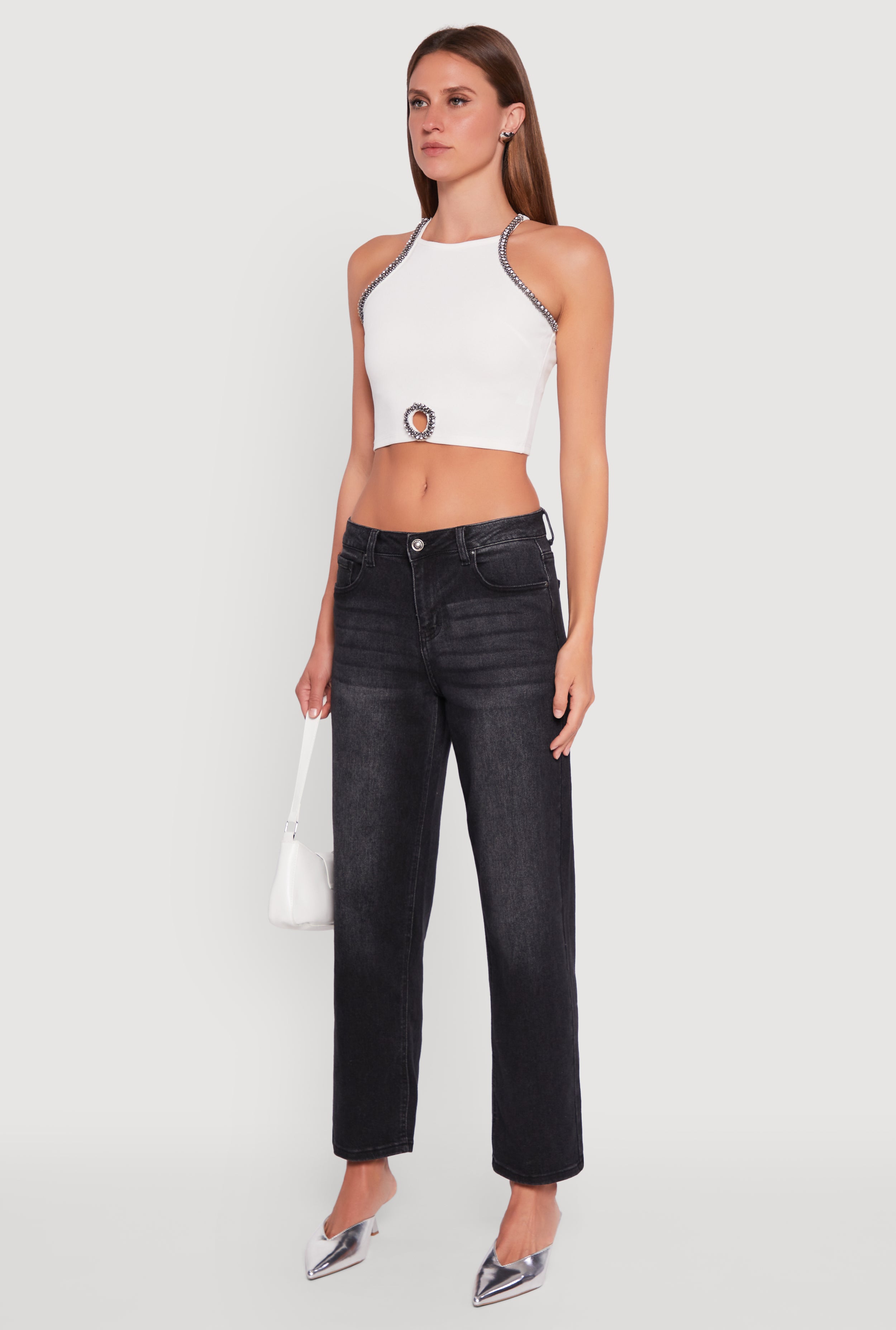Shine bright and turn heads with this Rhinestone Studded Trim Detail Halter Crop Top. Perfect for your next night out or special occasion, this sleeveless crop top features a classic fit and a chic halter neckline that flatters every figure. The sparkling rhinestone trim adds just the right amount of glam to elevate your party look effortlessly. Pair it with high-waisted jeans or a sleek skirt and get ready to steal the spotlight.