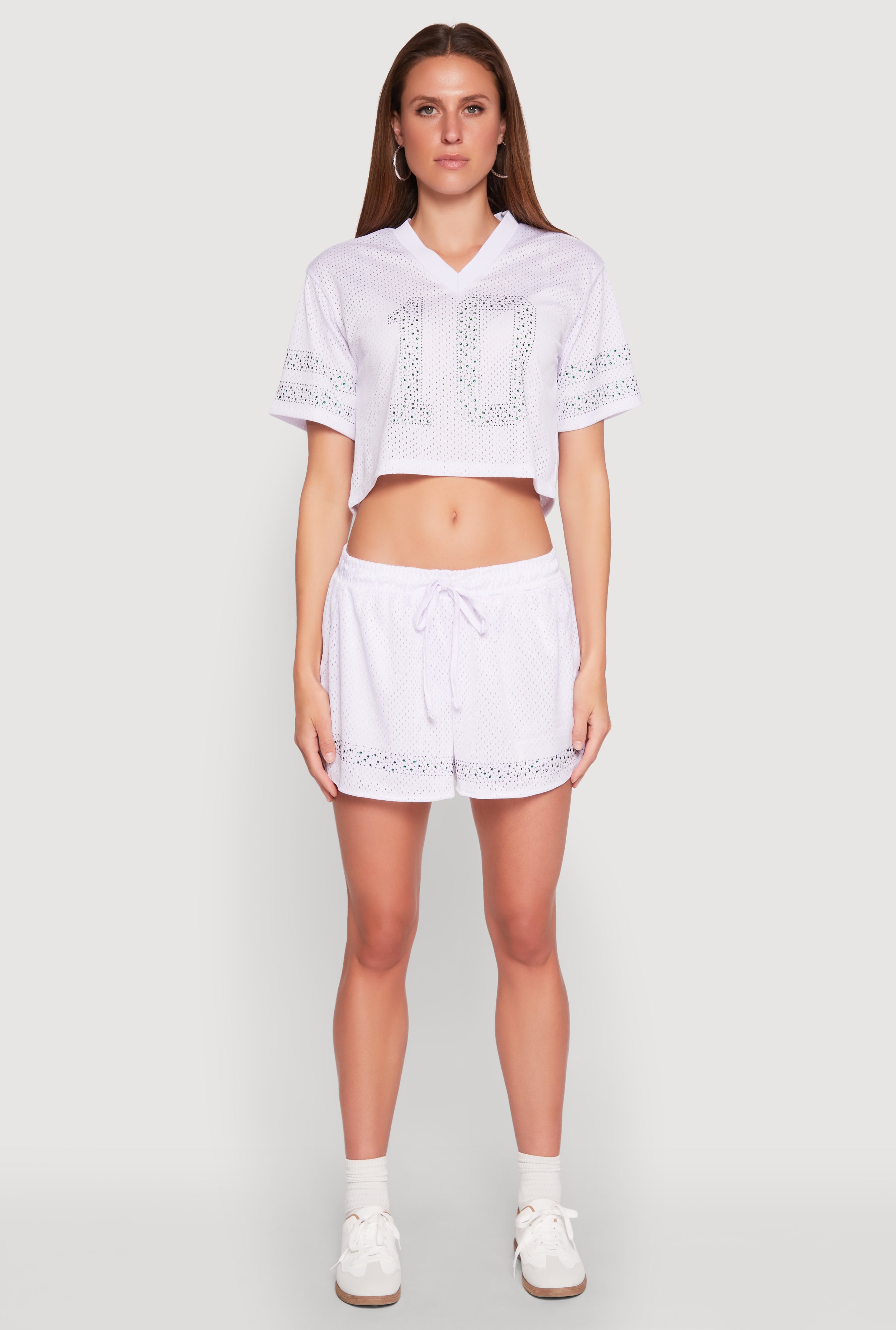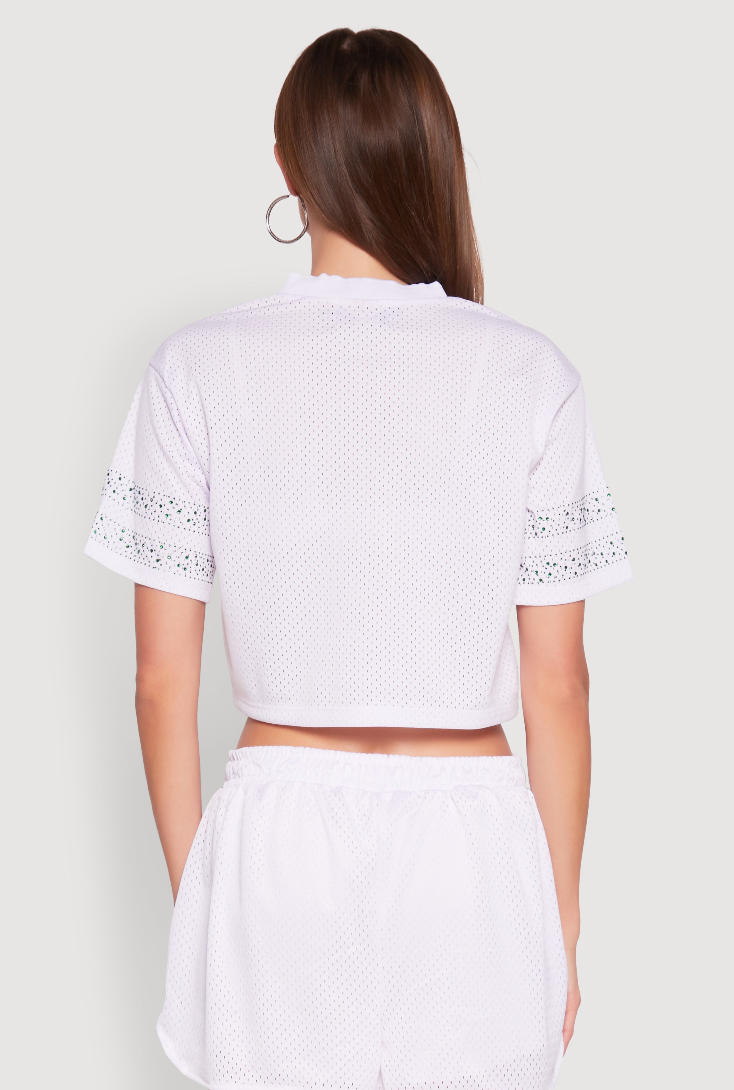 Get ready to turn heads with the Rhinestone Varsity Stripe Mesh Jersey, a perfect blend of sporty vibes and sparkling style. This trendy T-shirt features a classic fit with a cropped hem, making it an effortless statement piece for your casual looks. The mesh fabric adds a breathable touch, while the rhinestone varsity stripe detail brings just the right amount of glam. Whether you're heading to a chill hangout or adding some sparkle to your everyday outfit, this top is your new go-to for a fun, fashionable vibe.
