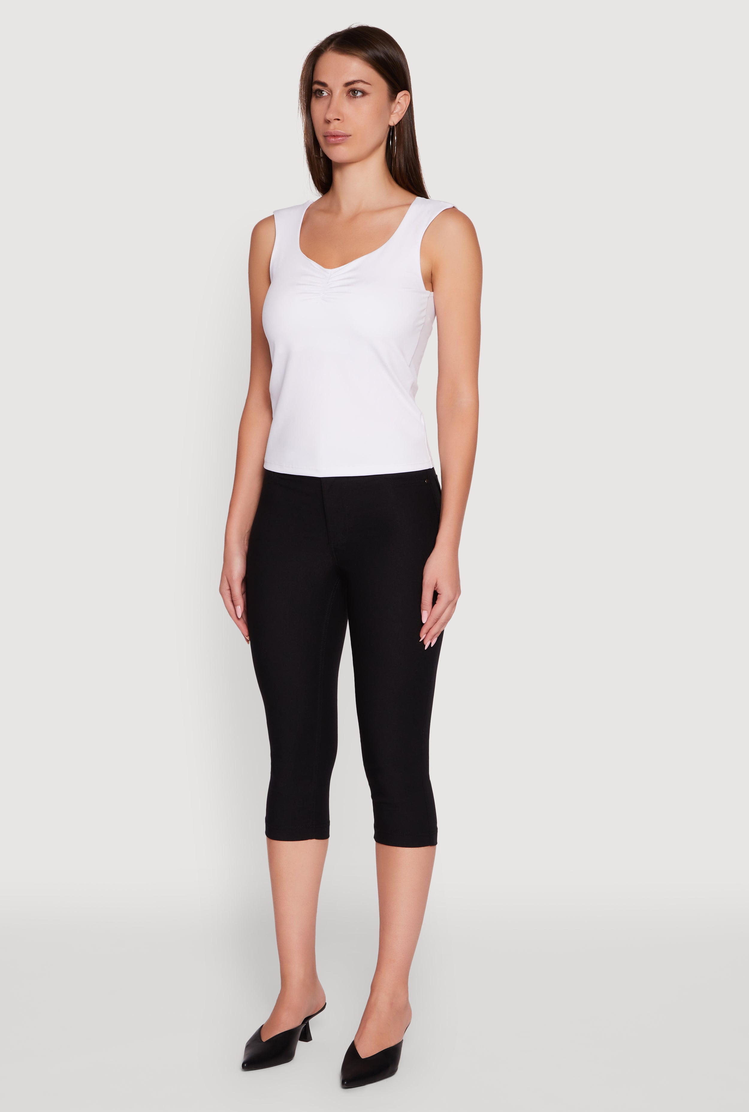 Upgrade your everyday look with this Ruched V Neck Tank Top featuring a built-in shelf bra for effortless support. Its classic fit and flattering ruching create a timeless silhouette that feels as good as it looks. Perfect for casual days when you want to keep it simple but stylish, this sleeveless tank is your new go-to for layering or wearing solo.